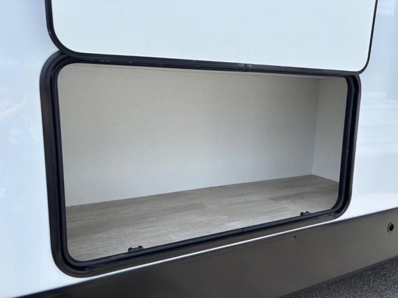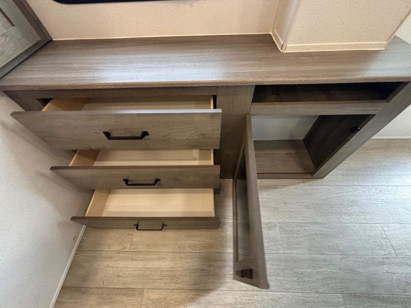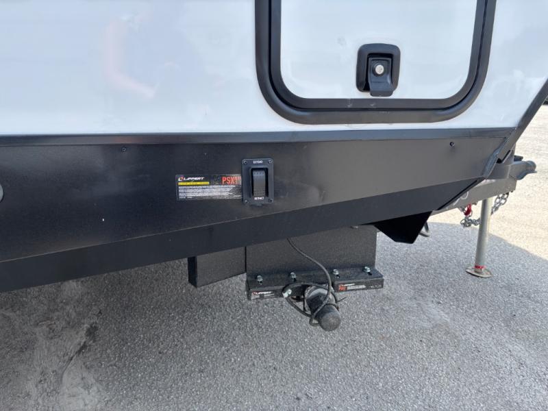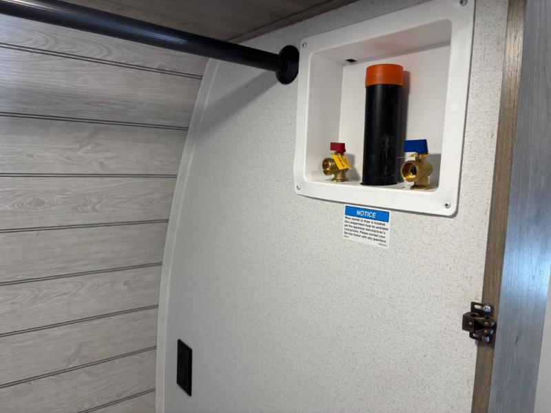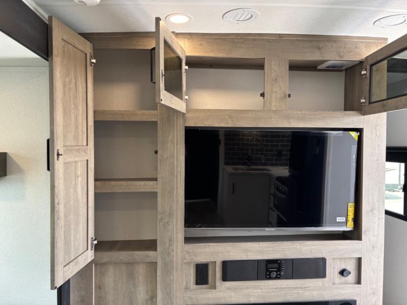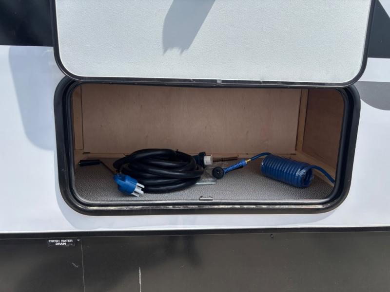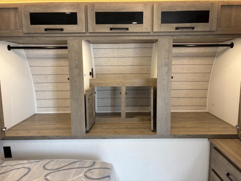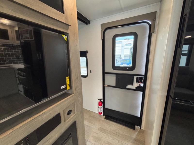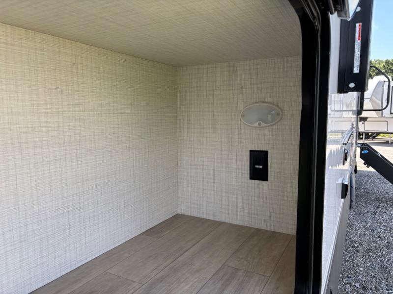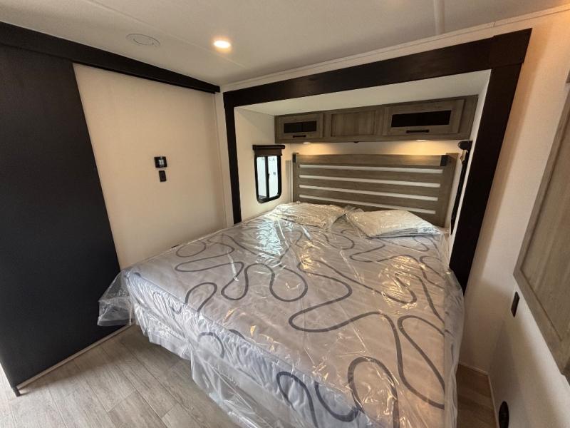 This travel trailer offers so many features that you will love, from a private bunkhouse for overnight guests to having three slide outs giving you a spacious interior throughout! The bunkhouse includes triple bunks, a double-size day bed, and storage space for your guests' things. The full bathroom is centrally located for all to access from the main living and kitchen area where you will find a slide out that includes a booth dinette and a sofa sleeper. The cook will love the kitchen amenities such as the microwave, cooktop, 11 cu. ft. refrigerator, and the L-shaped counter for preparing and serving meals. And don't overlook the front private bedroom with its king bed slide out, dresser, closet, plus a second bedroom closet with washer and dryer prep!