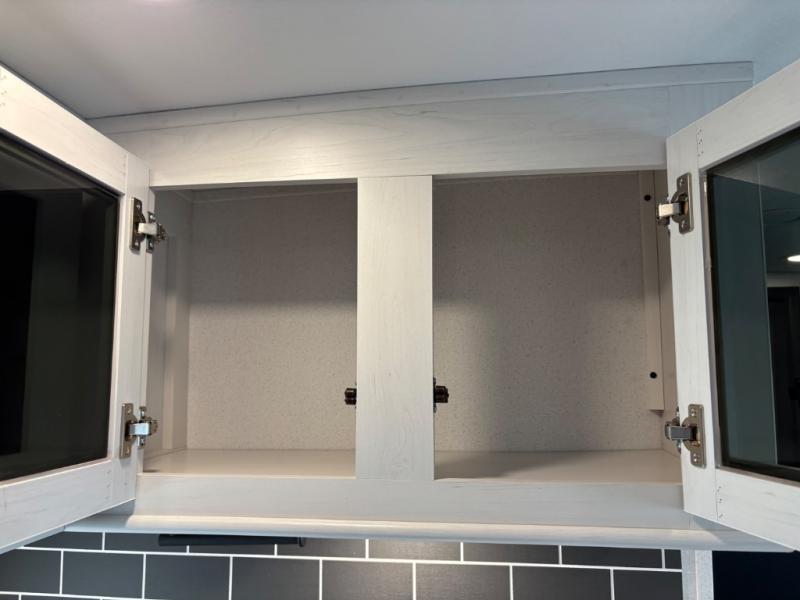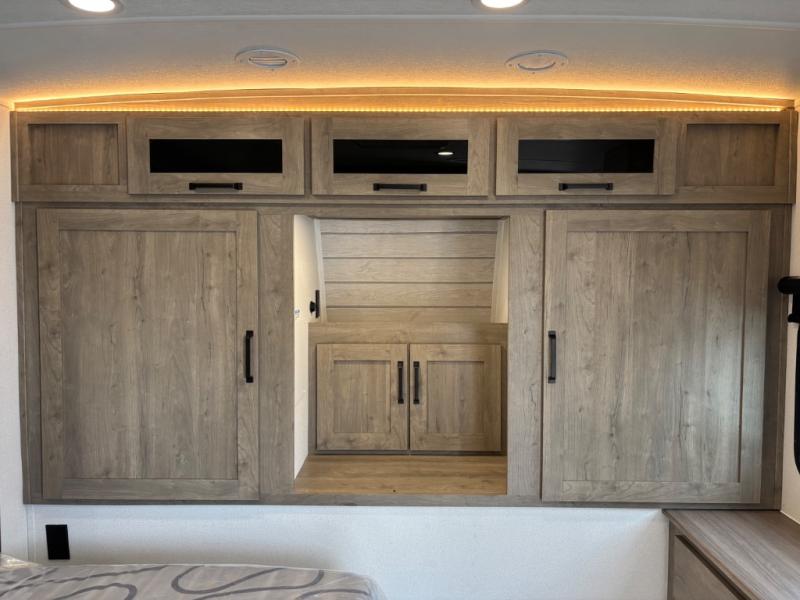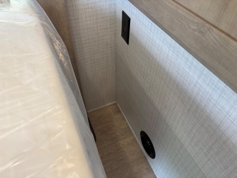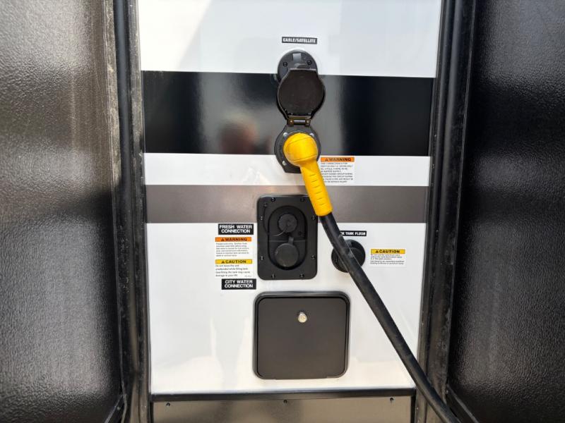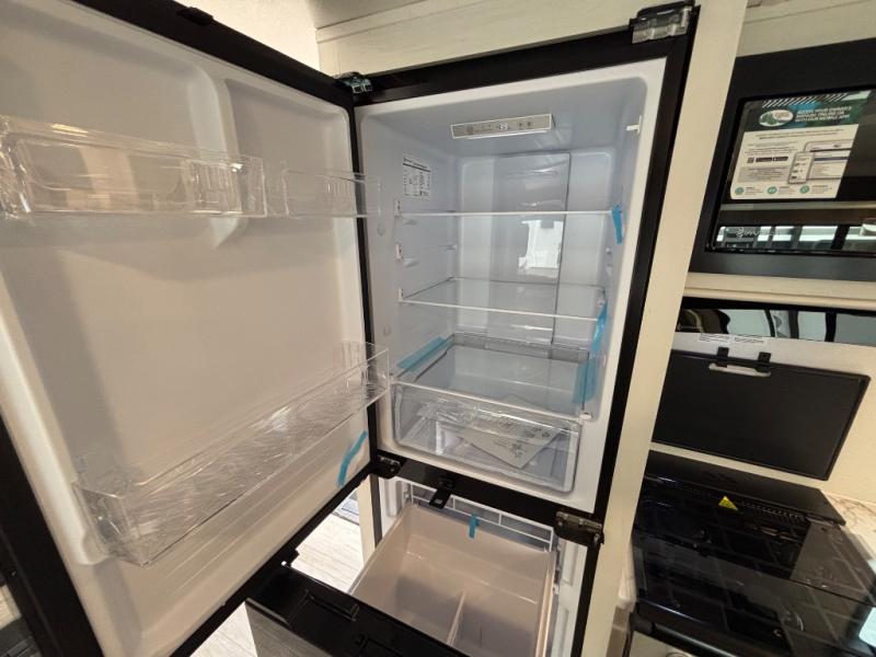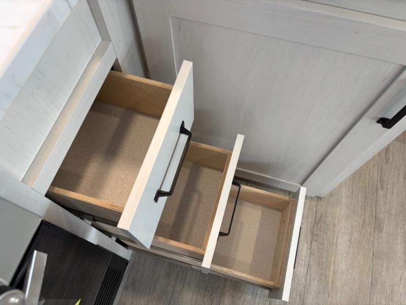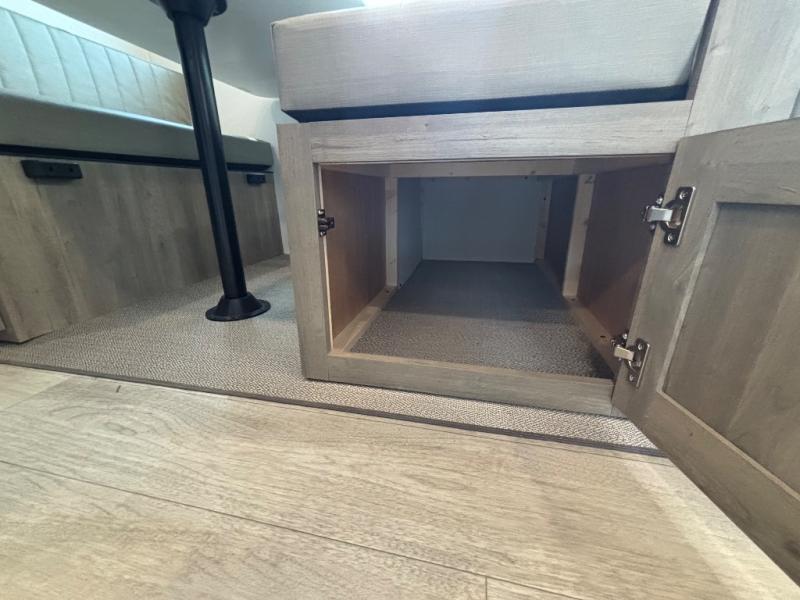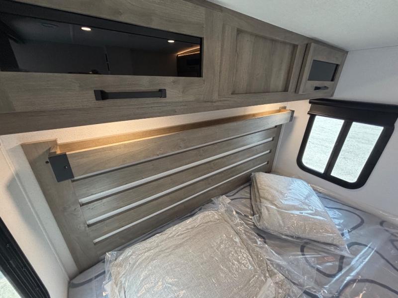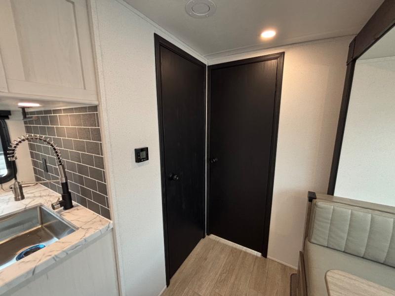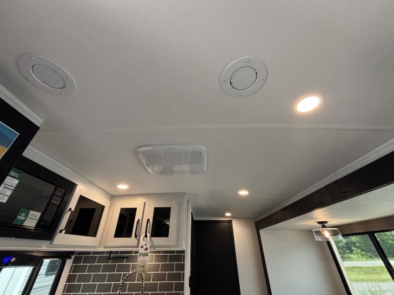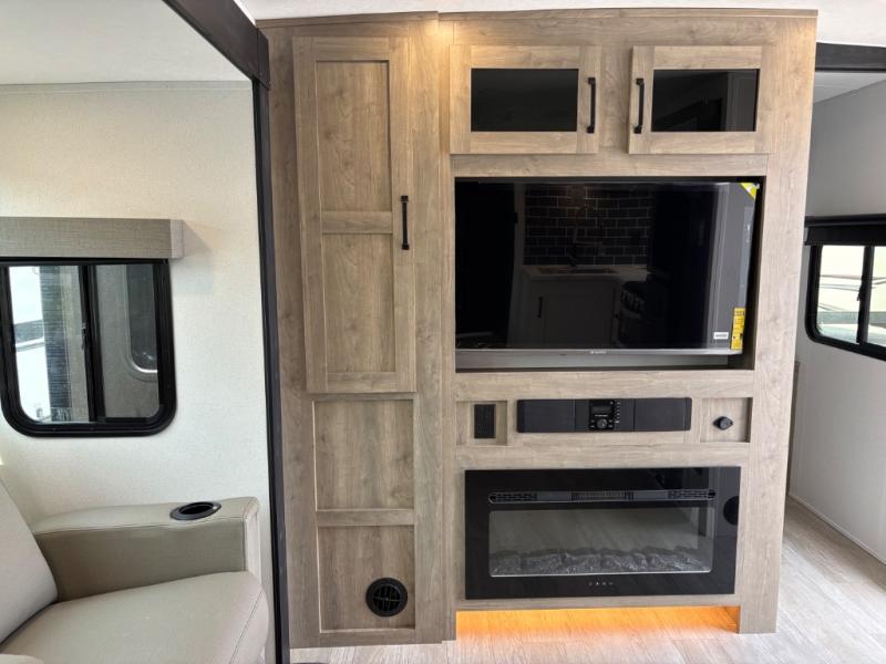 This travel trailer offers so many features that you will love, from a private bunkhouse for overnight guests to having three slide outs giving you a spacious interior throughout! The bunkhouse includes triple bunks, a double-size day bed, and storage space for your guests' things. The full bathroom is centrally located for all to access from the main living and kitchen area where you will find a slide out that includes a booth dinette and a sofa sleeper. The cook will love the kitchen amenities such as the microwave, cooktop, 11 cu. ft. refrigerator, and the L-shaped counter for preparing and serving meals. And don't overlook the front private bedroom with its king bed slide out, dresser, closet, plus a second bedroom closet with washer and dryer prep!