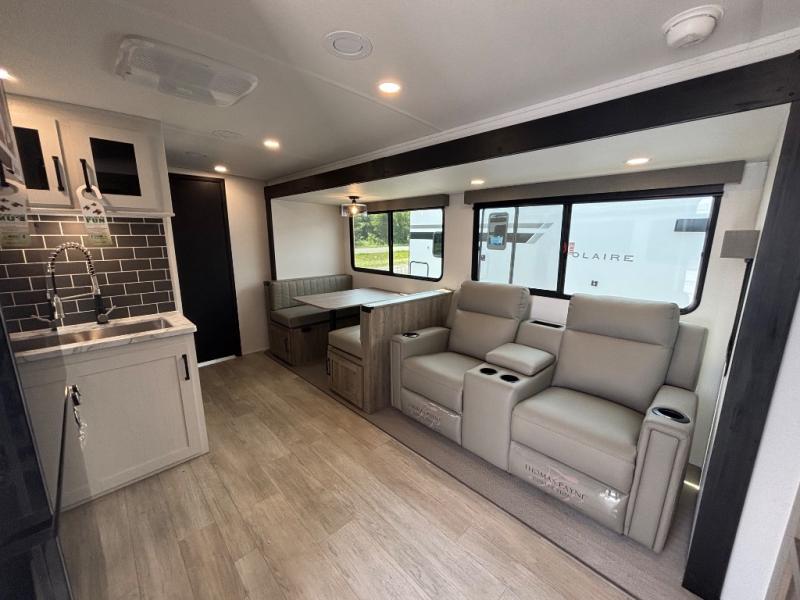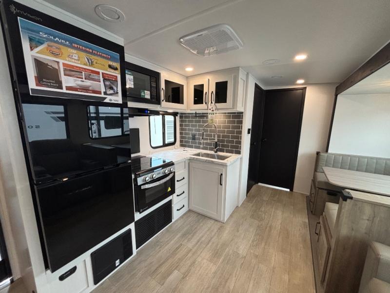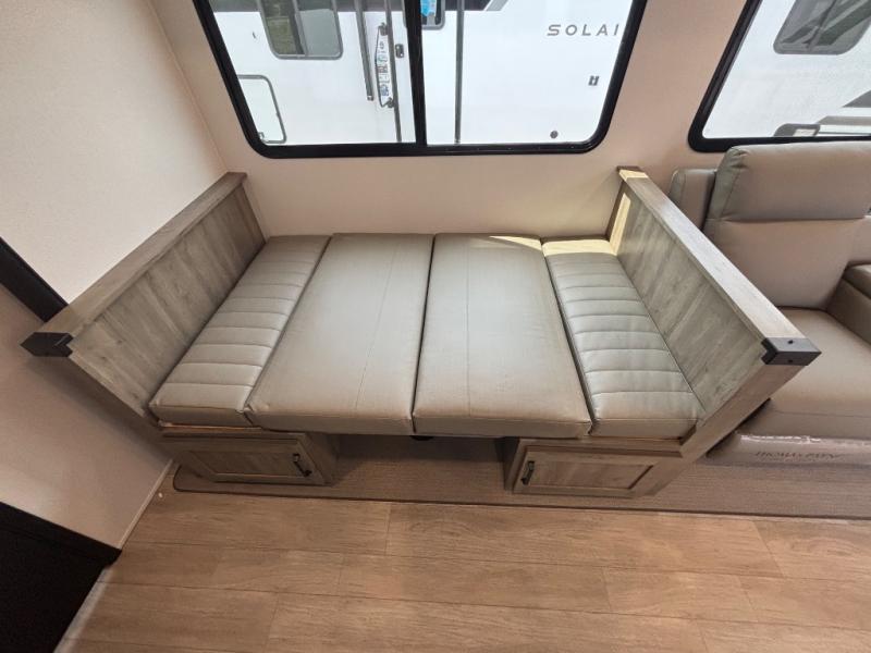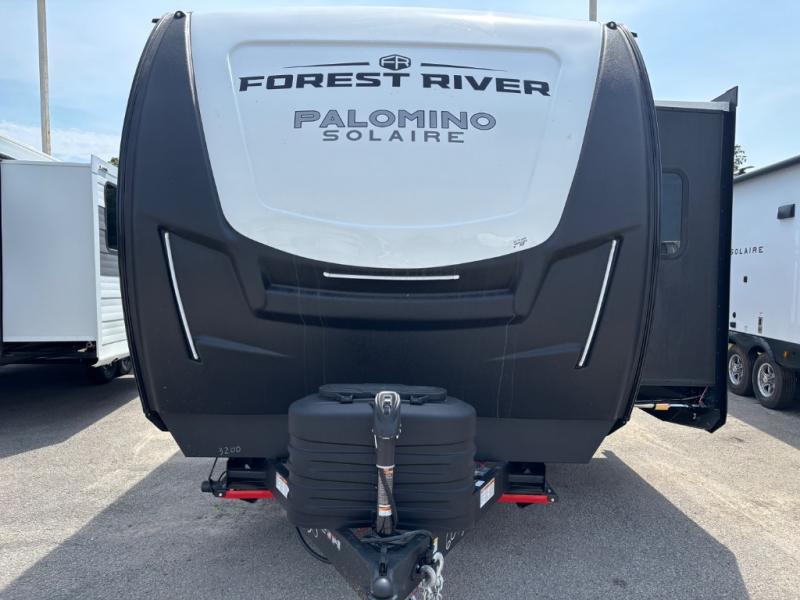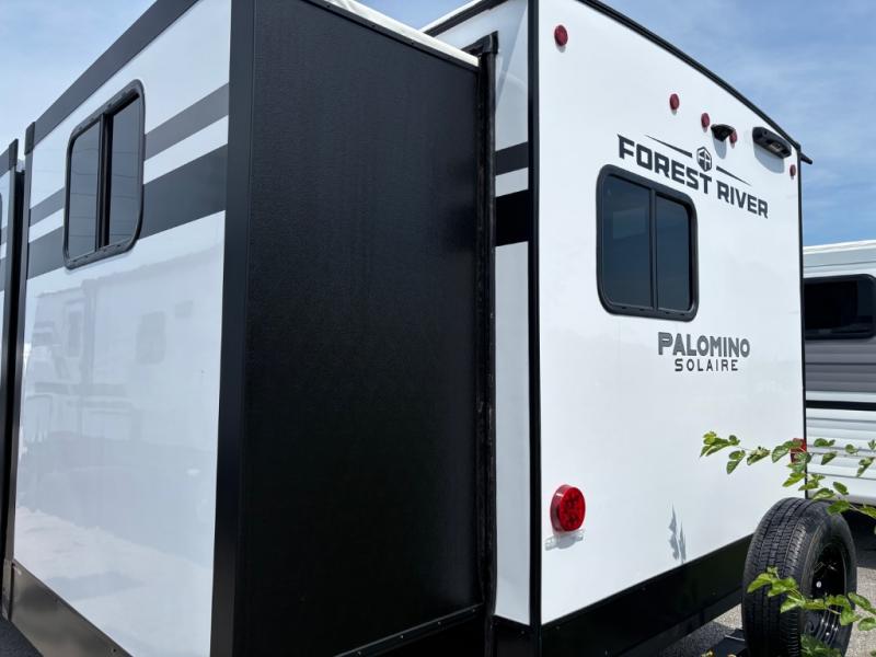 Each SolAire travel trailer by Palomino features a white gel coat exterior and an aluminum superstructure frame for lightweight towing. You will love having a power tongue jack for easy set up, plus slam latch baggage doors with magnets to make unloading easier than ever. There is also a power awning with LED lights and aluminum wheels included on the exterior. Each SolAire is constructed to last with Azdel composite, a fully laminated rear wall and roof, plus a fully enclosed and heated underbelly. The interior includes roller shades and kitchen backsplash, USB ports to keep your electronics charged, a Bluetooth stereo with speakers, and many more stand-out features!