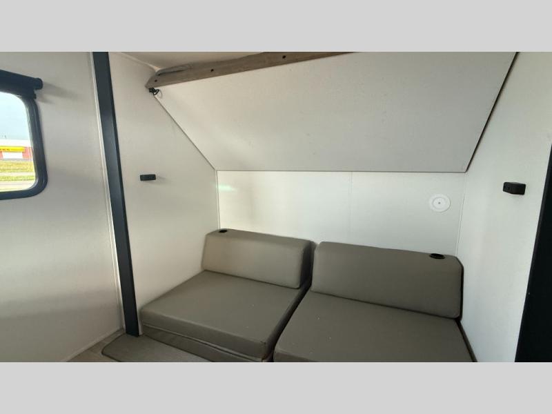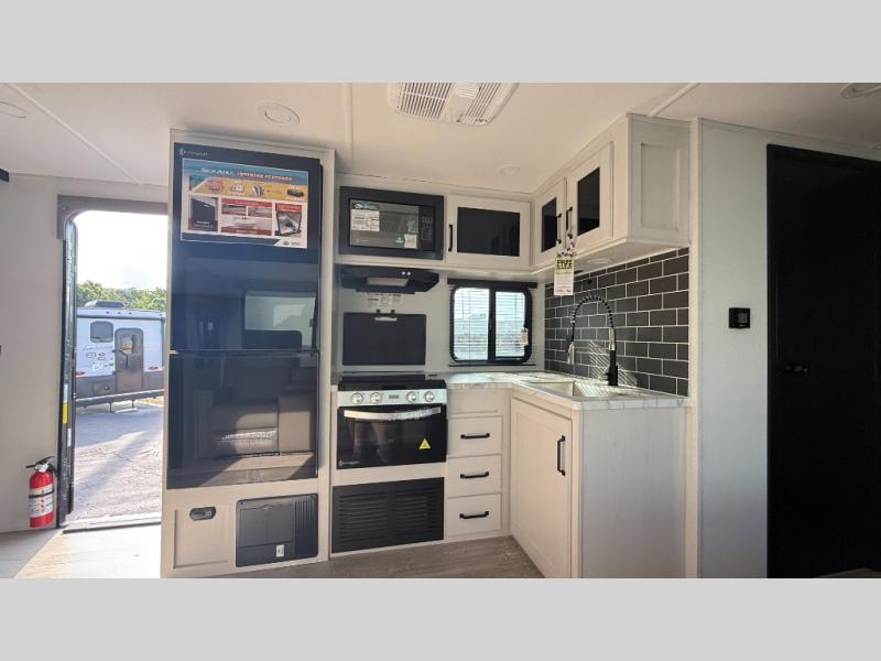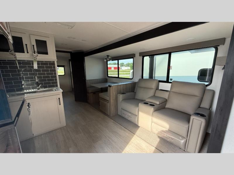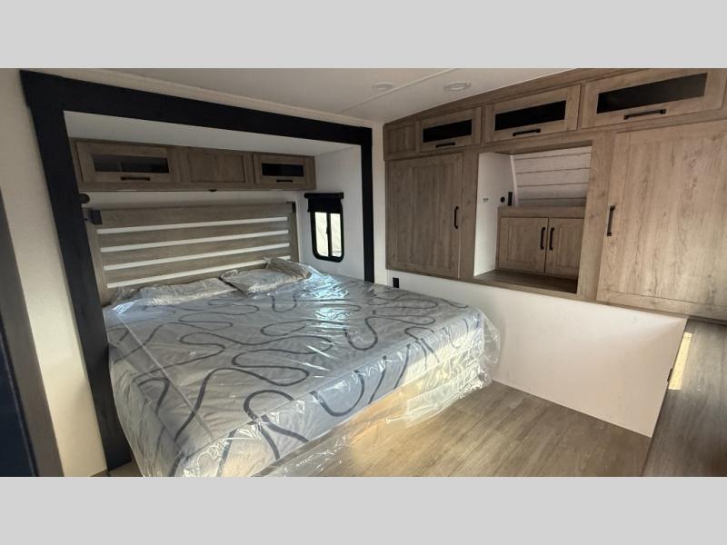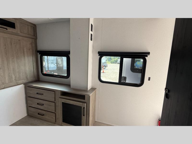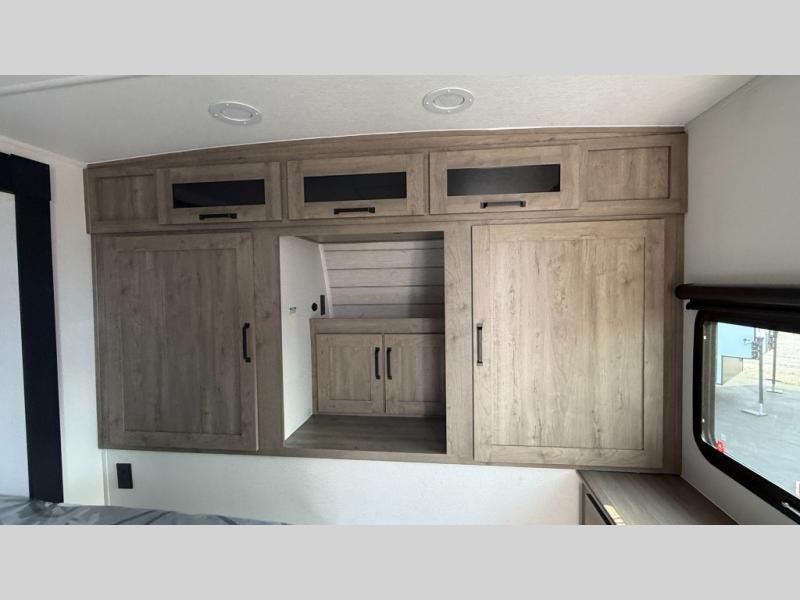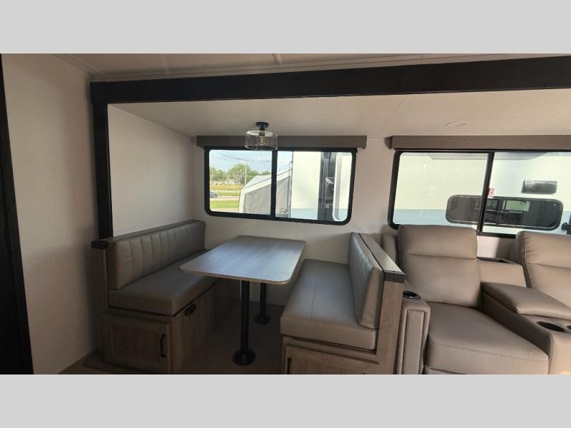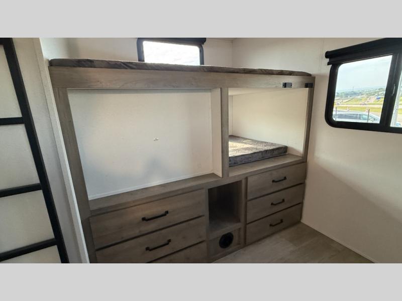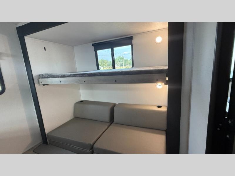 This travel trailer offers so many features that you will love, from a private bunkhouse for overnight guests to having three slide outs giving you a spacious interior throughout! The bunkhouse includes triple bunks, a double-size day bed, and storage space for your guests' things. The full bathroom is centrally located for all to access from the main living and kitchen area where you will find a slide out that includes a booth dinette and a sofa sleeper. The cook will love the kitchen amenities such as the microwave, cooktop, 11 cu. ft. refrigerator, and the L-shaped counter for preparing and serving meals. And don't overlook the front private bedroom with its king bed slide out, dresser, closet, plus a second bedroom closet with washer and dryer prep!