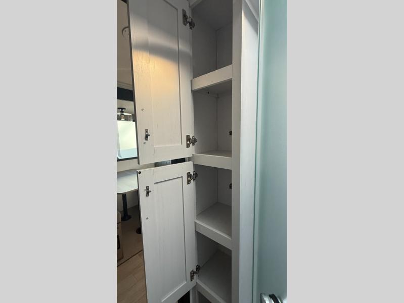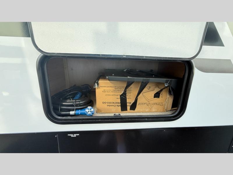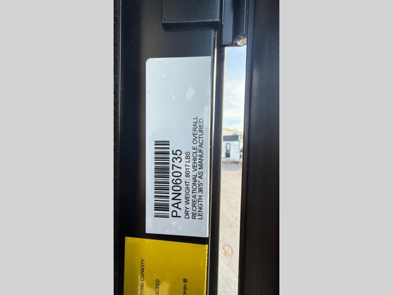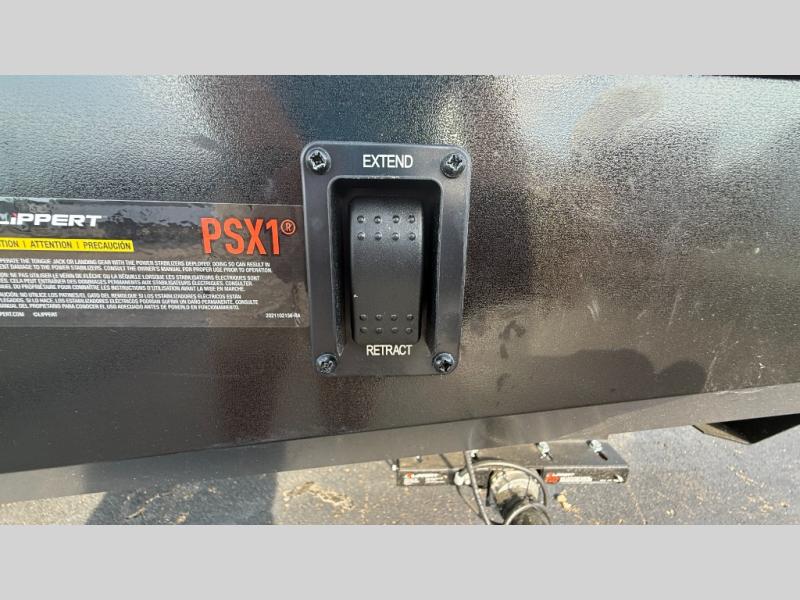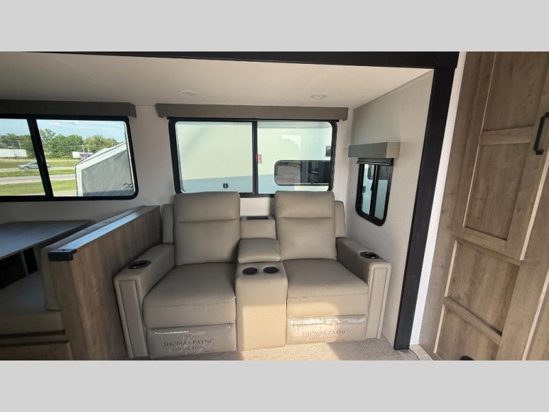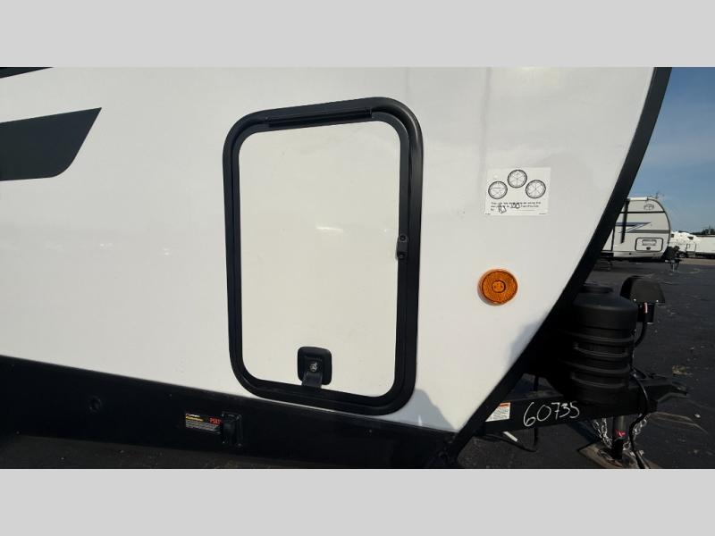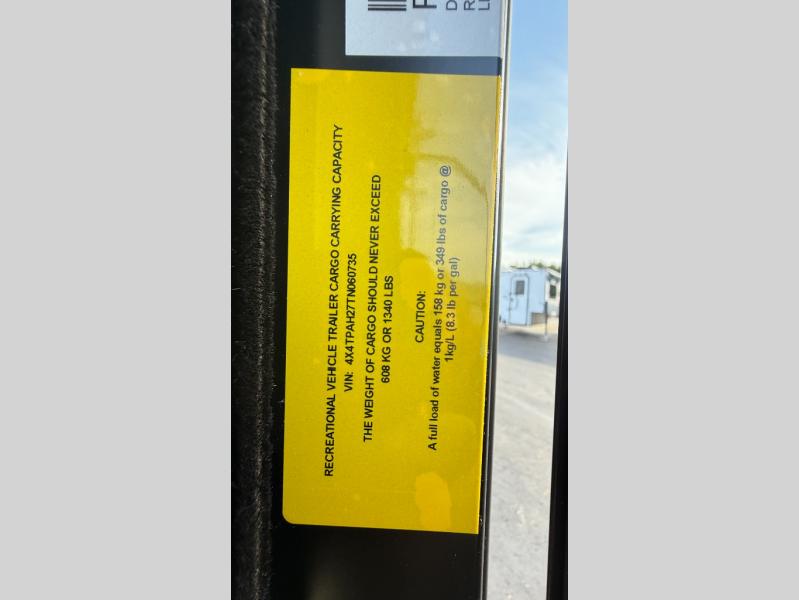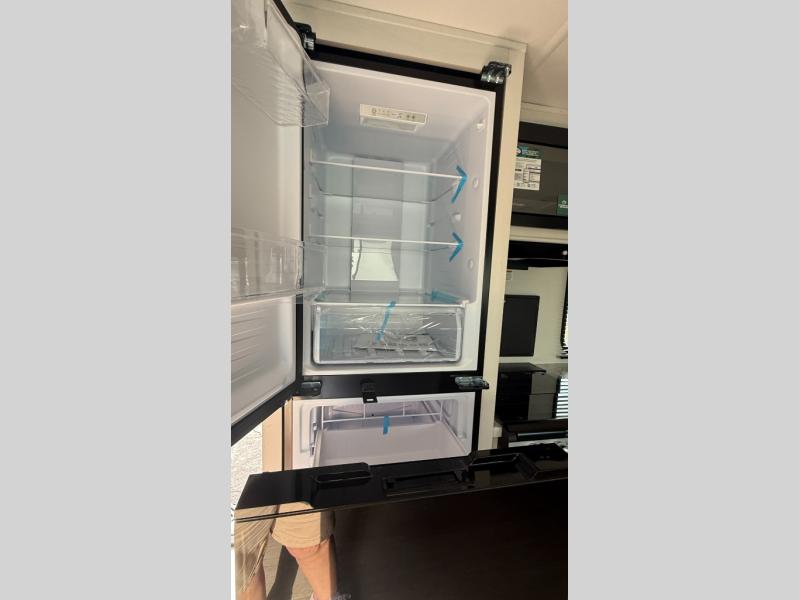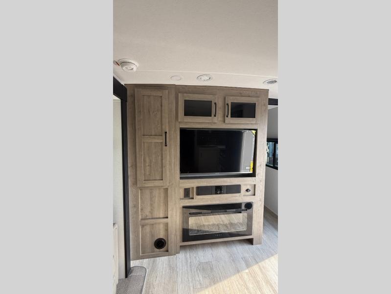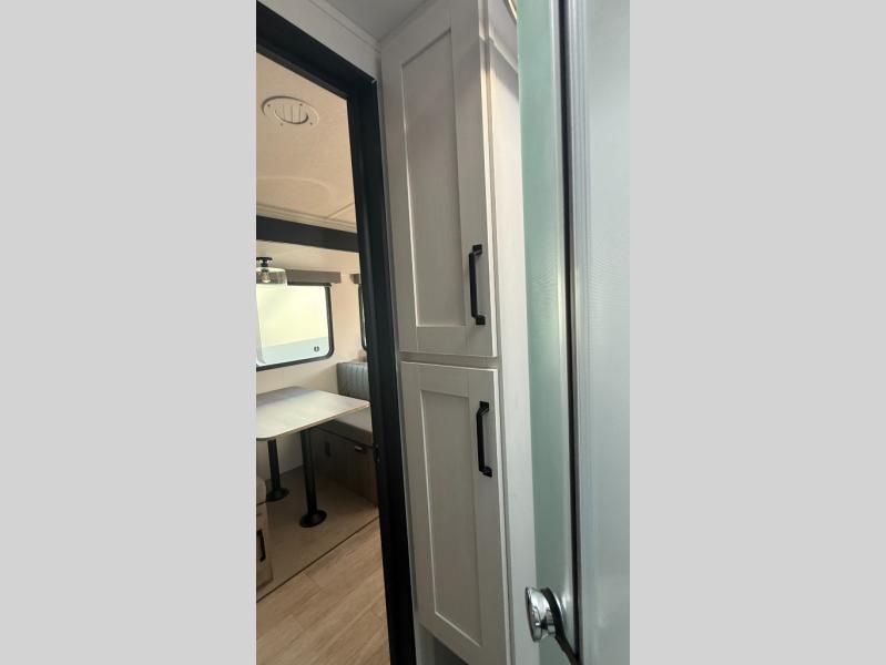 This travel trailer offers so many features that you will love, from a private bunkhouse for overnight guests to having three slide outs giving you a spacious interior throughout! The bunkhouse includes triple bunks, a double-size day bed, and storage space for your guests' things. The full bathroom is centrally located for all to access from the main living and kitchen area where you will find a slide out that includes a booth dinette and a sofa sleeper. The cook will love the kitchen amenities such as the microwave, cooktop, 11 cu. ft. refrigerator, and the L-shaped counter for preparing and serving meals. And don't overlook the front private bedroom with its king bed slide out, dresser, closet, plus a second bedroom closet with washer and dryer prep!