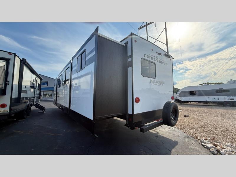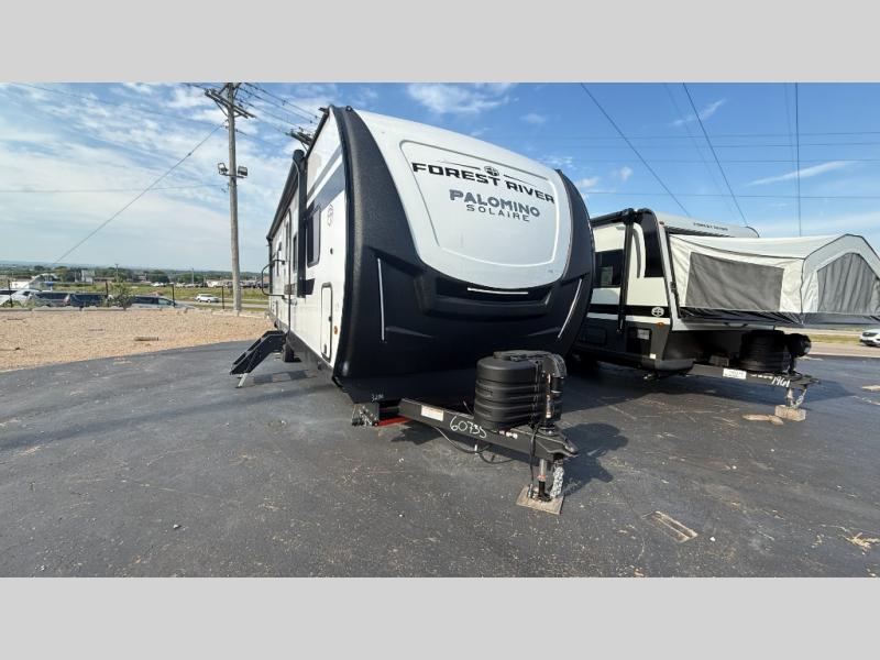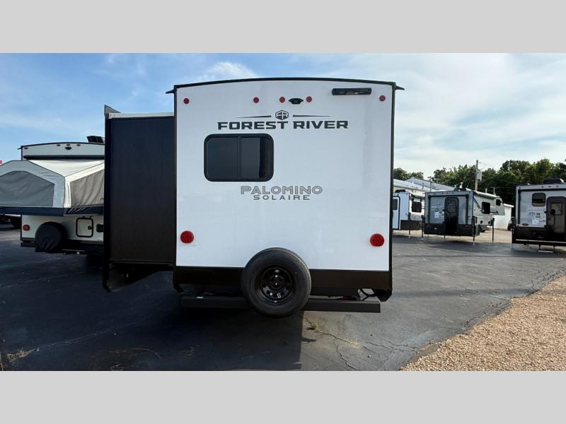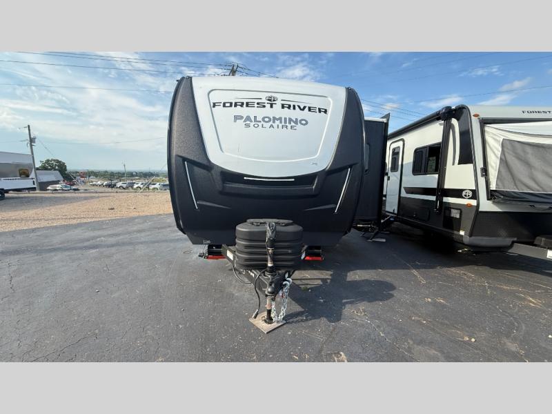 Each SolAire travel trailer by Palomino features a white gel coat exterior and an aluminum superstructure frame for lightweight towing. You will love having a power tongue jack for easy set up, plus slam latch baggage doors with magnets to make unloading easier than ever. There is also a power awning with LED lights and aluminum wheels included on the exterior. Each SolAire is constructed to last with Azdel composite, a fully laminated rear wall and roof, plus a fully enclosed and heated underbelly. The interior includes roller shades and kitchen backsplash, USB ports to keep your electronics charged, a Bluetooth stereo with speakers, and many more stand-out features!