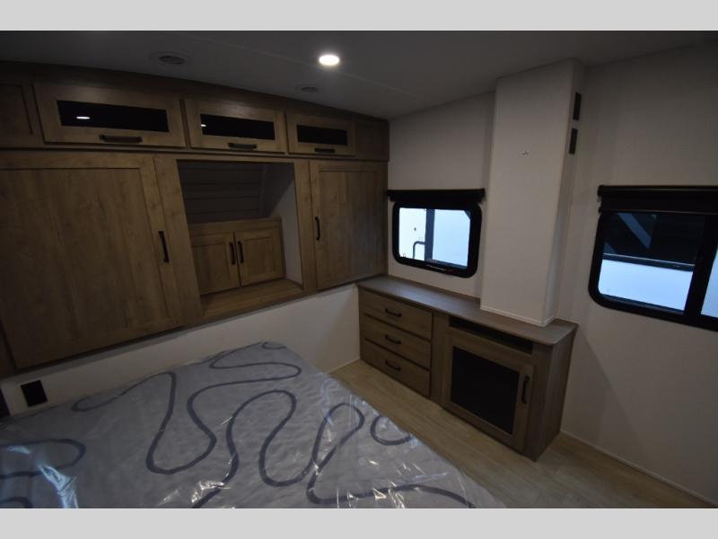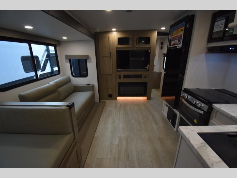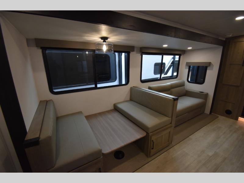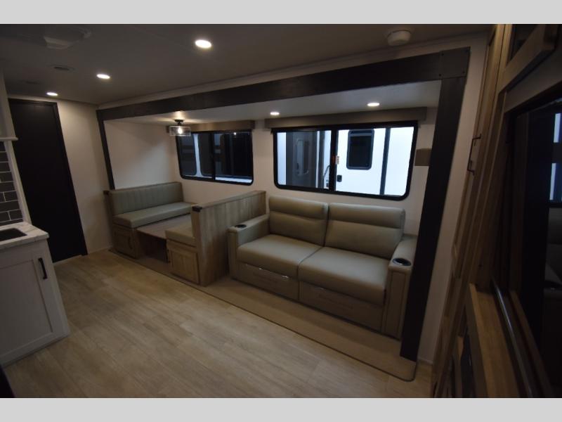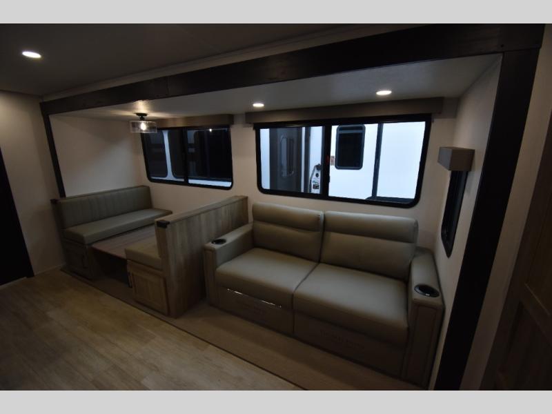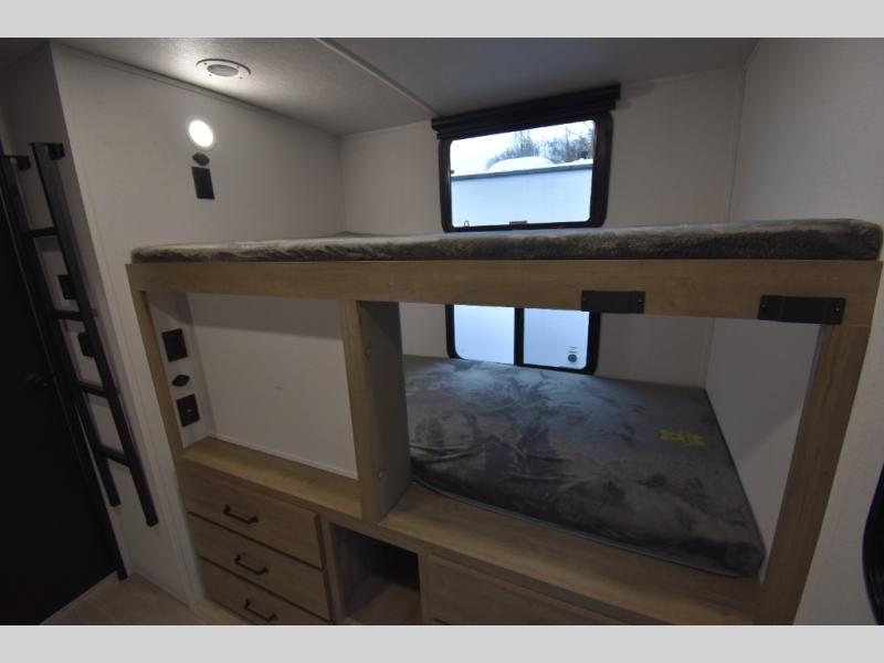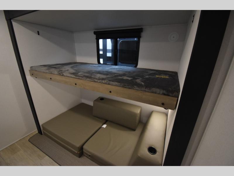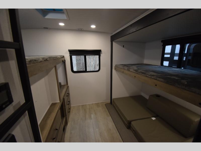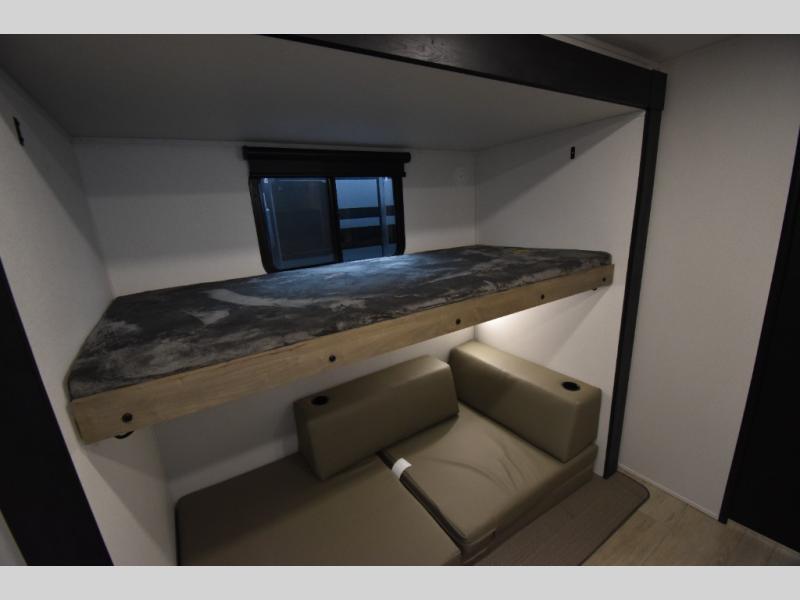 This travel trailer offers so many features that you will love, from a private bunkhouse for overnight guests to having three slide outs giving you a spacious interior throughout! The bunkhouse includes triple bunks, a double-size day bed, and storage space for your guests' things. The full bathroom is centrally located for all to access from the main living and kitchen area where you will find a slide out that includes a booth dinette and a sofa sleeper. The cook will love the kitchen amenities such as the microwave, cooktop, 11 cu. ft. refrigerator, and the L-shaped counter for preparing and serving meals. And don't overlook the front private bedroom with its king bed slide out, dresser, closet, plus a second bedroom closet with washer and dryer prep!