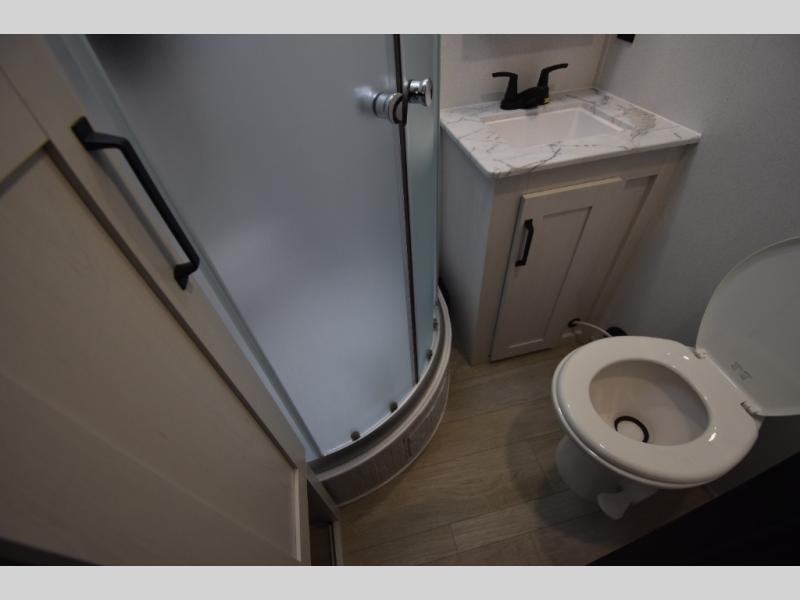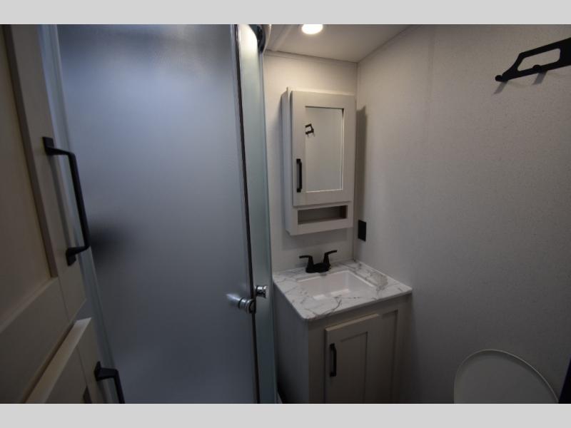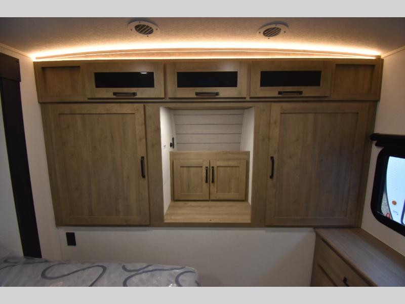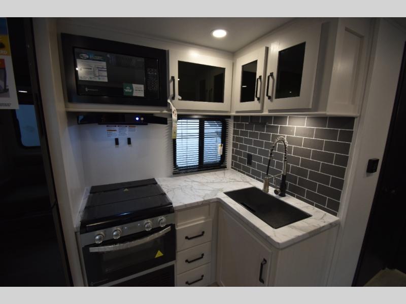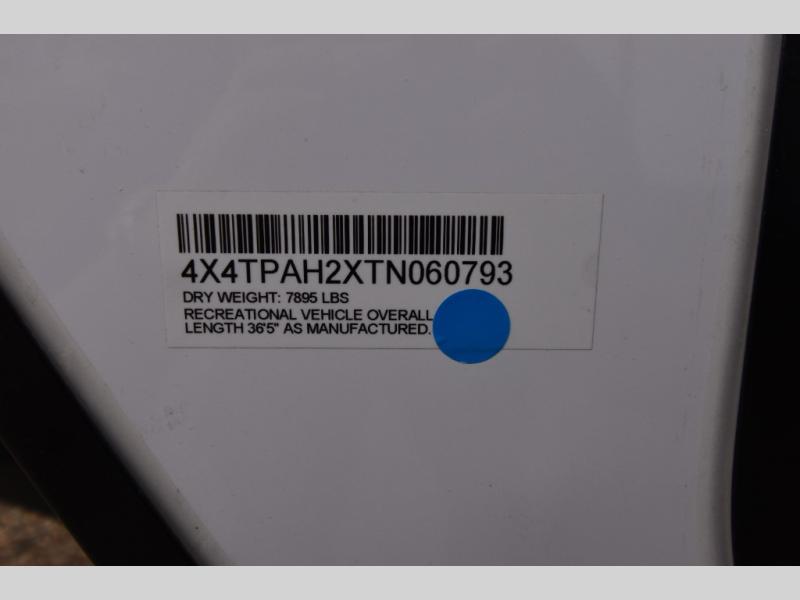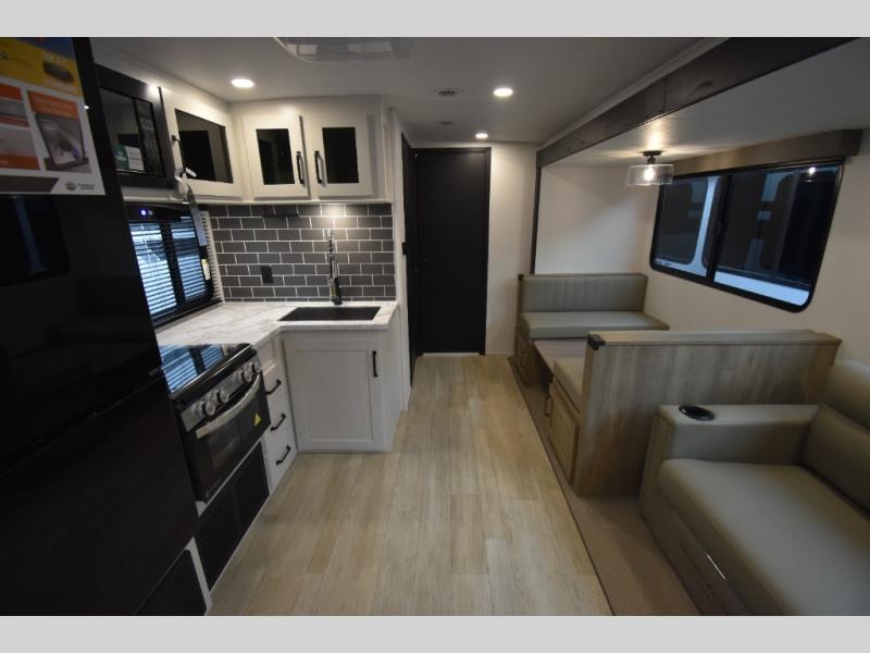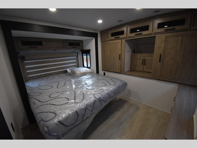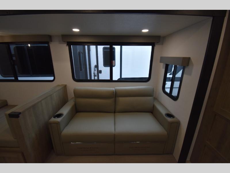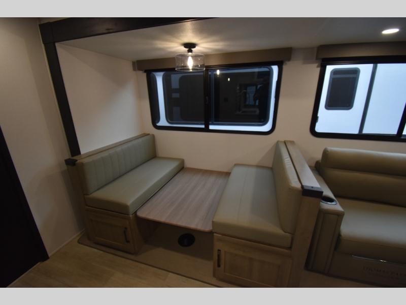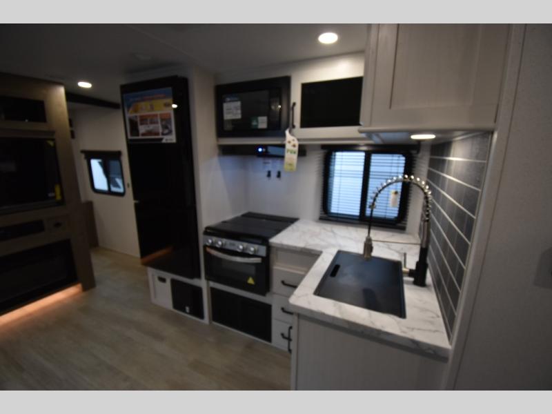 This travel trailer offers so many features that you will love, from a private bunkhouse for overnight guests to having three slide outs giving you a spacious interior throughout! The bunkhouse includes triple bunks, a double-size day bed, and storage space for your guests' things. The full bathroom is centrally located for all to access from the main living and kitchen area where you will find a slide out that includes a booth dinette and a sofa sleeper. The cook will love the kitchen amenities such as the microwave, cooktop, 11 cu. ft. refrigerator, and the L-shaped counter for preparing and serving meals. And don't overlook the front private bedroom with its king bed slide out, dresser, closet, plus a second bedroom closet with washer and dryer prep!