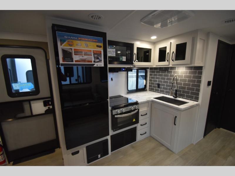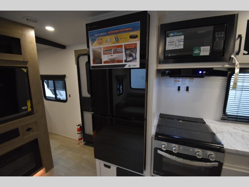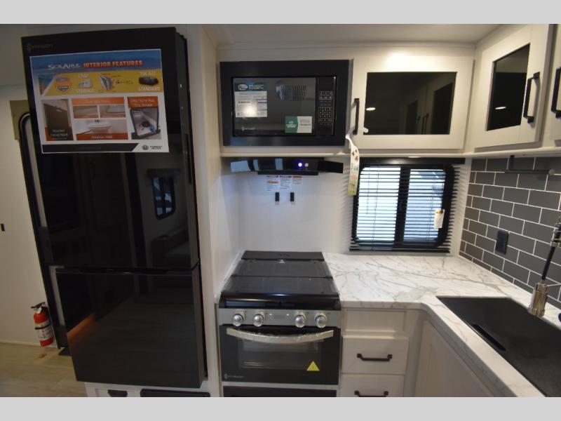 Each SolAire travel trailer by Palomino features a white gel coat exterior and an aluminum superstructure frame for lightweight towing. You will love having a power tongue jack for easy set up, plus slam latch baggage doors with magnets to make unloading easier than ever. There is also a power awning with LED lights and aluminum wheels included on the exterior. Each SolAire is constructed to last with Azdel composite, a fully laminated rear wall and roof, plus a fully enclosed and heated underbelly. The interior includes roller shades and kitchen backsplash, USB ports to keep your electronics charged, a Bluetooth stereo with speakers, and many more stand-out features!