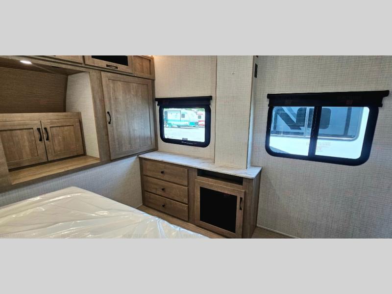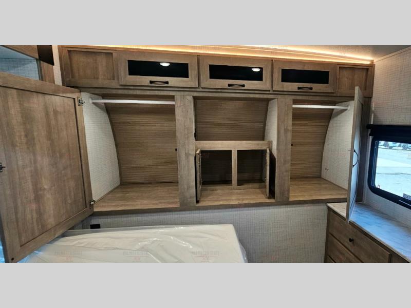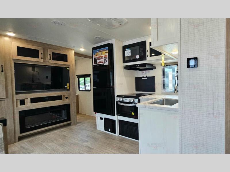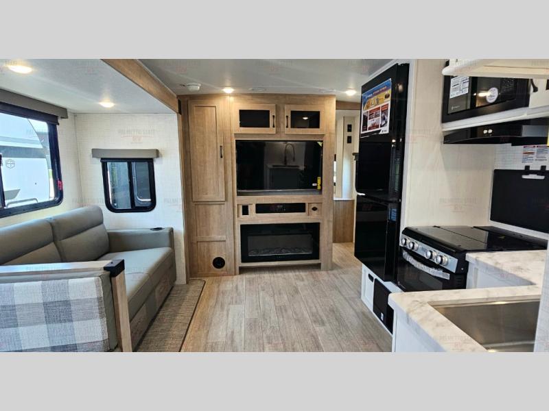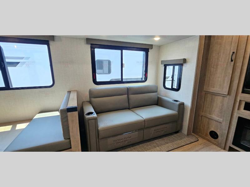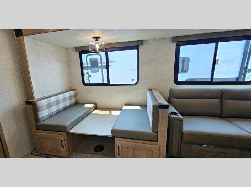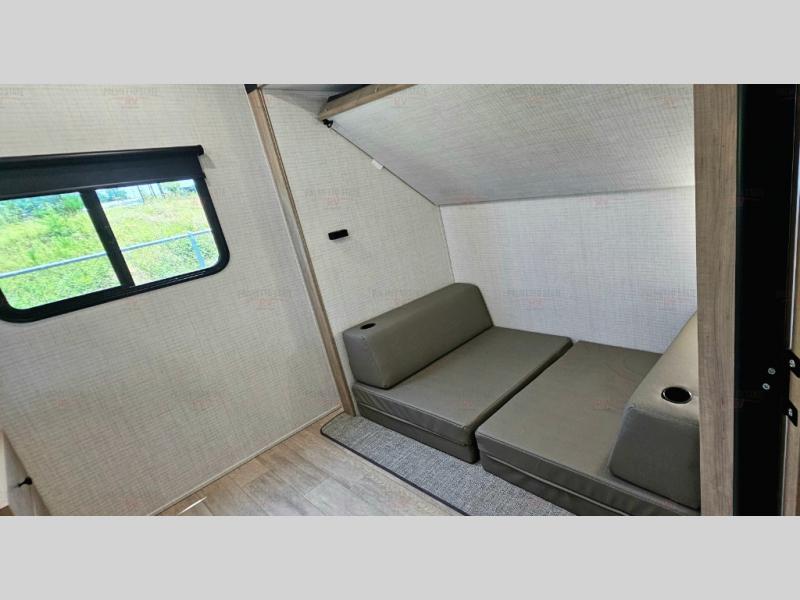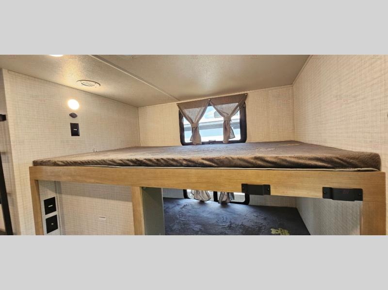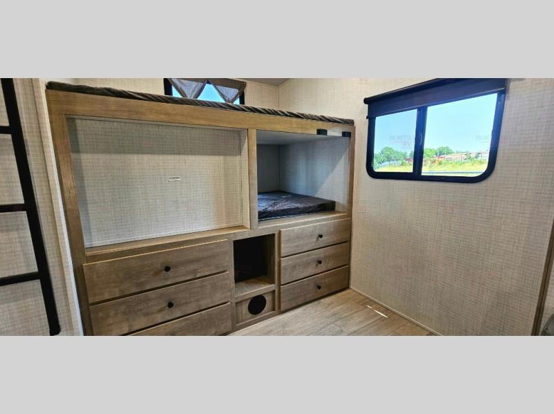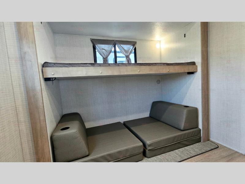 This travel trailer offers so many features that you will love, from a private bunkhouse for overnight guests to having three slide outs giving you a spacious interior throughout! The bunkhouse includes triple bunks, a double-size day bed, and storage space for your guests' things. The full bathroom is centrally located for all to access from the main living and kitchen area where you will find a slide out that includes a booth dinette and a sofa sleeper. The cook will love the kitchen amenities such as the microwave, cooktop, 11 cu. ft. refrigerator, and the L-shaped counter for preparing and serving meals. And don't overlook the front private bedroom with its king bed slide out, dresser, closet, plus a second bedroom closet with washer and dryer prep!