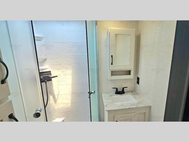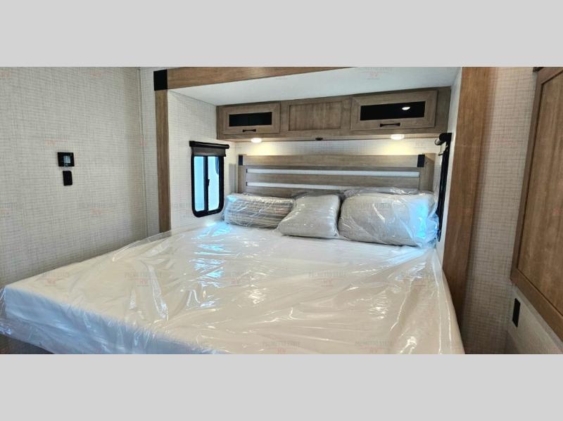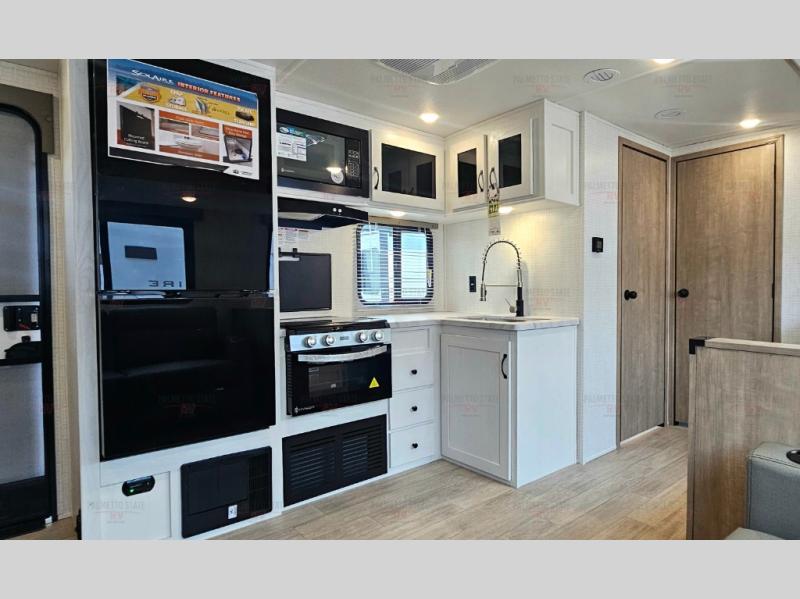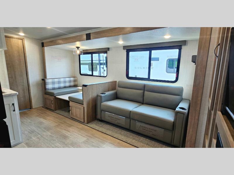Each Solaire travel trailer by Forest River is constructed with a fully enclosed/heated underbelly for added protection against the elements, plus a fully laminated roof and rear wall for durability. The slam latch baggage doors with magnets will make it easier than ever to pack up your camp gear, and the power awning with LED lights will provide shade during the day and inviting ambiance at night. Head inside to enjoy the roller shades, smoked glass kitchen cabinet doors, stainless-steel sink, and LED lights to keep your space well lit. Some of the available options include a bedroom A/C, a Wi-Fi booster, heated holding tanks, and more!