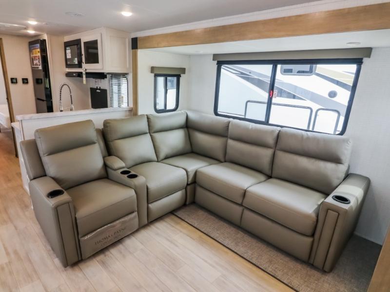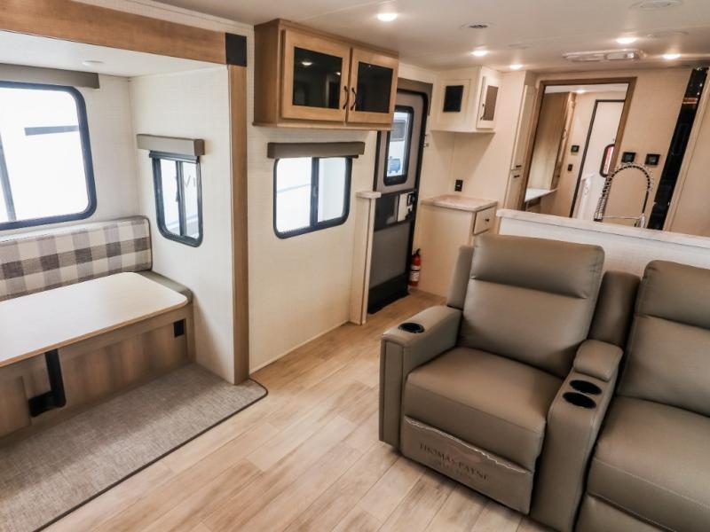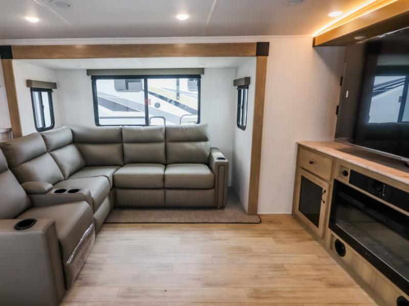 This travel trailer will feel just like home with its front living area, master bedroom, and triple slides for more space! You'll enjoy the sectional sofa and 63" dinette with two chairs on one side with a bench seat on the other. There is a front entertainment center where you can add an optional TV, and the fireplace will make it more cozy. A middle kitchen includes all the appliances to make meals each day, plus an electric refrigerator and pantry for food storage. Head towards the back to find the master bedroom with a king bed slide out, dual wardrobes, and a desk with drawers if you need to get some work done. And the full rear bath is super accommodating with its dual bath sinks plus washer and dryer prep!