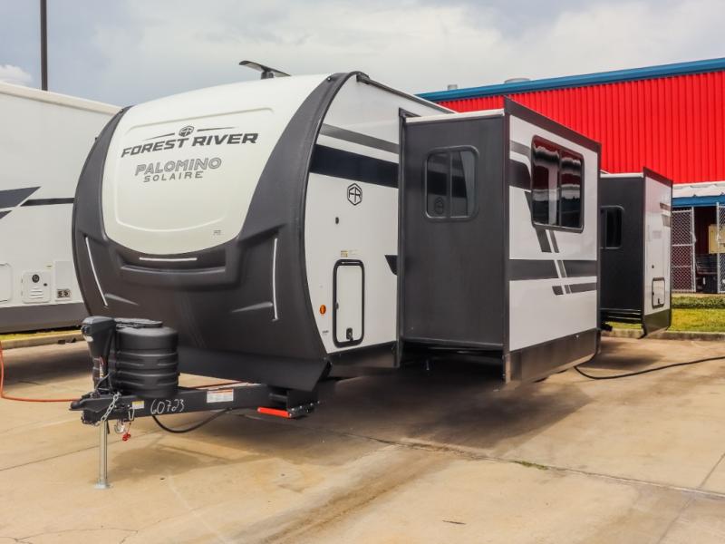 Each SolAire travel trailer by Palomino features a white gel coat exterior and an aluminum superstructure frame for lightweight towing. You will love having a power tongue jack for easy set up, plus slam latch baggage doors with magnets to make unloading easier than ever. There is also a power awning with LED lights and aluminum wheels included on the exterior. Each SolAire is constructed to last with Azdel composite, a fully laminated rear wall and roof, plus a fully enclosed and heated underbelly. The interior includes roller shades and kitchen backsplash, USB ports to keep your electronics charged, a Bluetooth stereo with speakers, and many more stand-out features!