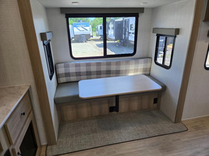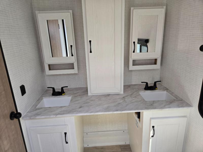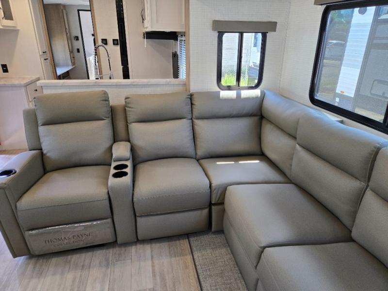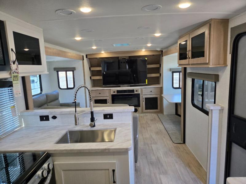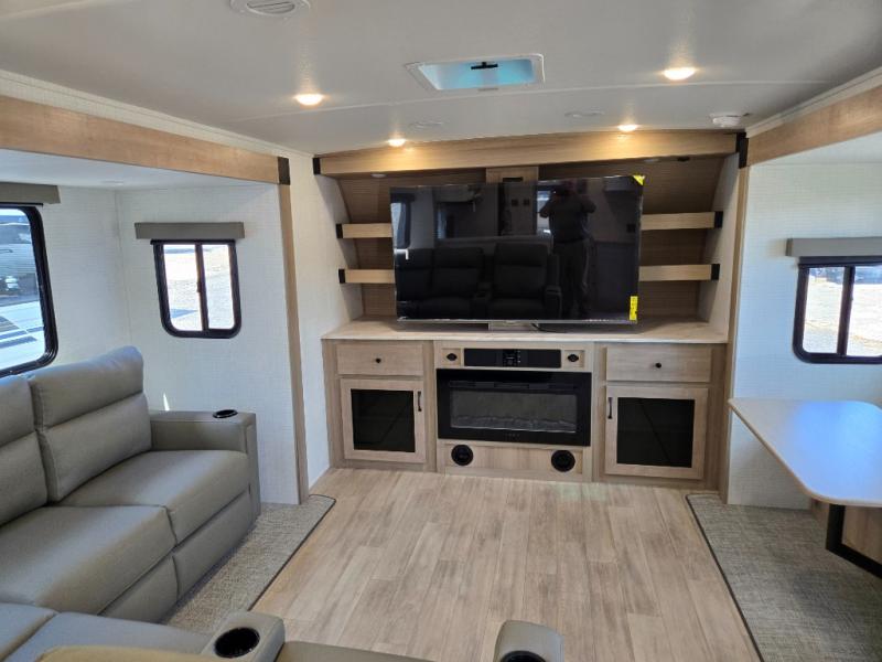 This travel trailer will feel just like home with its front living area, master bedroom, and triple slides for more space! You'll enjoy the sectional sofa and 63" dinette with two chairs on one side with a bench seat on the other. There is a front entertainment center where you can add an optional TV, and the fireplace will make it more cozy. A middle kitchen includes all the appliances to make meals each day, plus an electric refrigerator and pantry for food storage. Head towards the back to find the master bedroom with a king bed slide out, dual wardrobes, and a desk with drawers if you need to get some work done. And the full rear bath is super accommodating with its dual bath sinks plus washer and dryer prep!