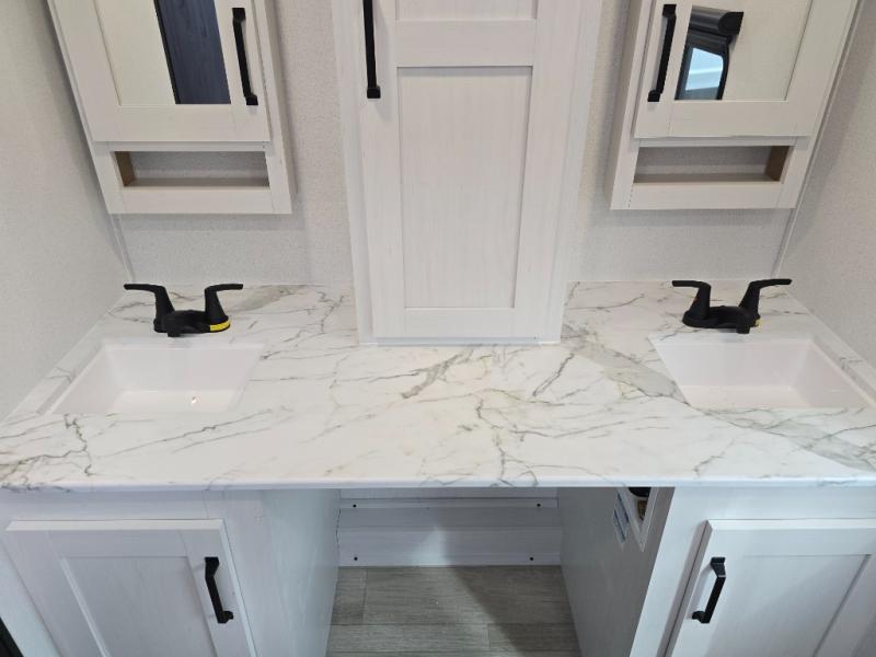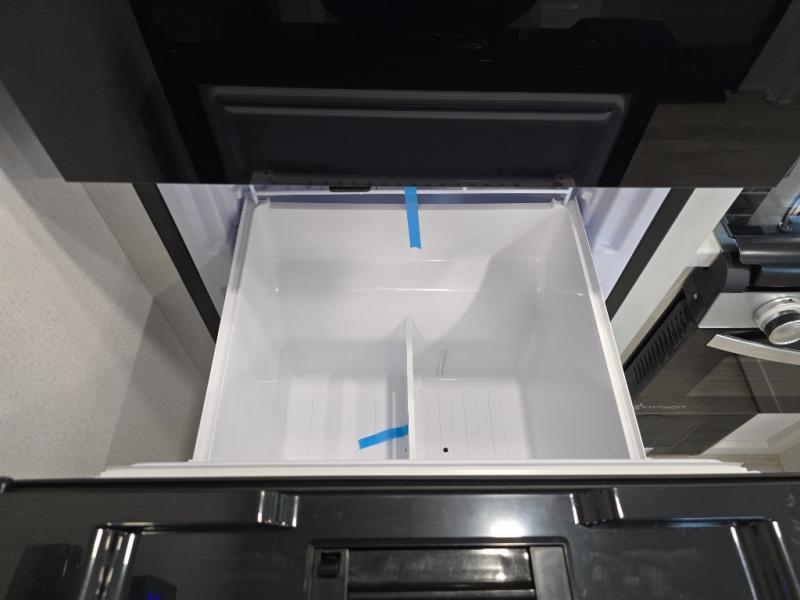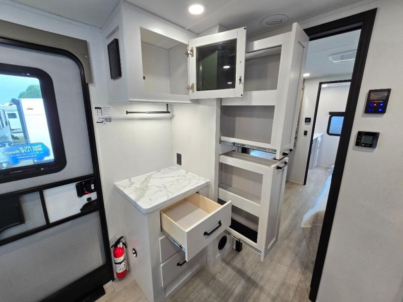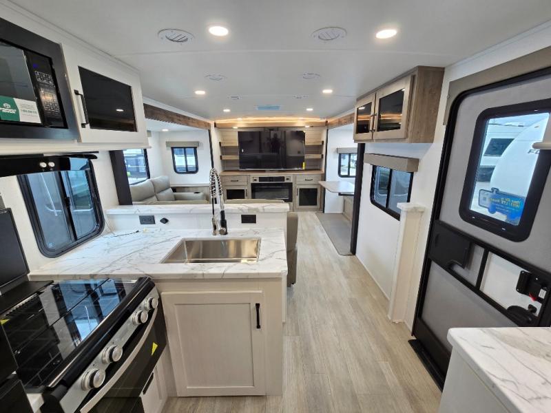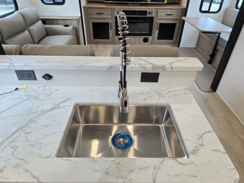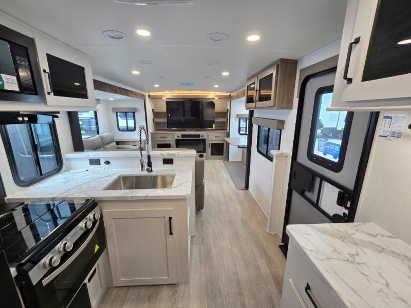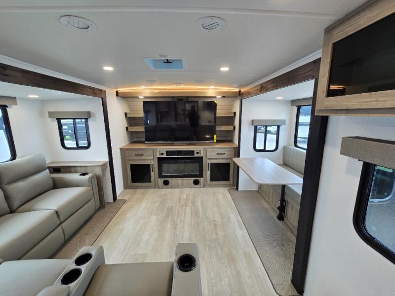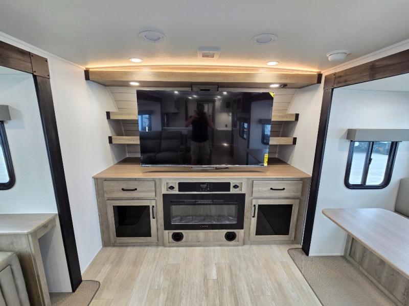 This travel trailer will feel just like home with its front living area, master bedroom, and triple slides for more space! You'll enjoy the sectional sofa and 63" dinette with two chairs on one side with a bench seat on the other. There is a front entertainment center where you can add an optional TV, and the fireplace will make it more cozy. A middle kitchen includes all the appliances to make meals each day, plus an electric refrigerator and pantry for food storage. Head towards the back to find the master bedroom with a king bed slide out, dual wardrobes, and a desk with drawers if you need to get some work done. And the full rear bath is super accommodating with its dual bath sinks plus washer and dryer prep!