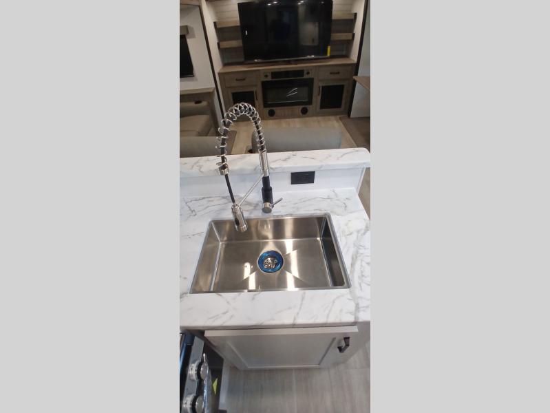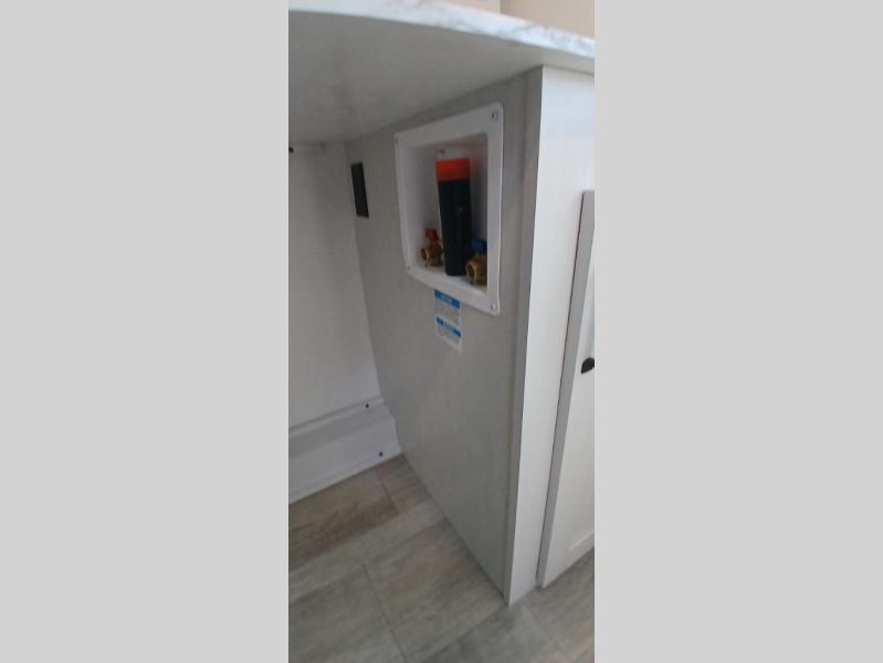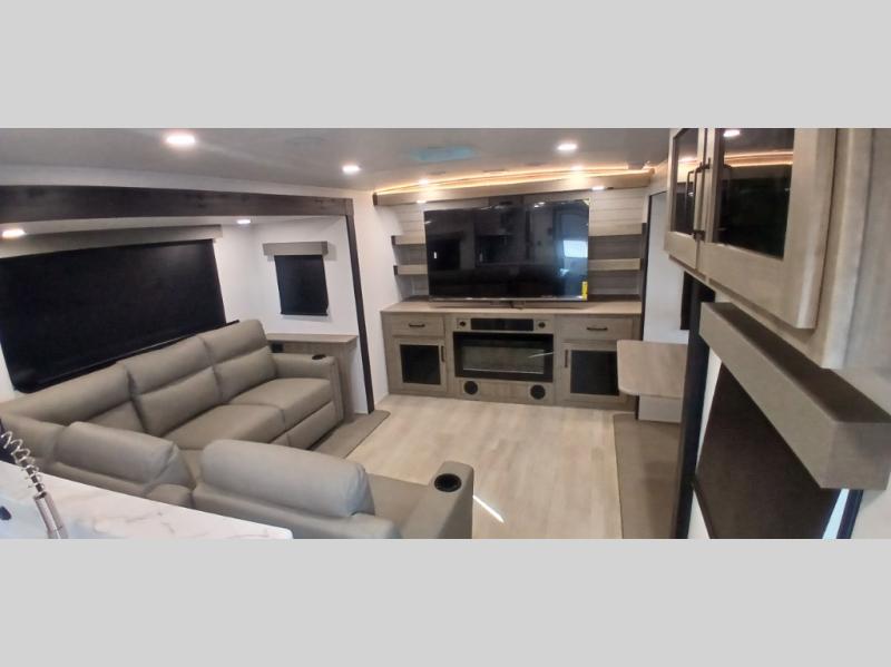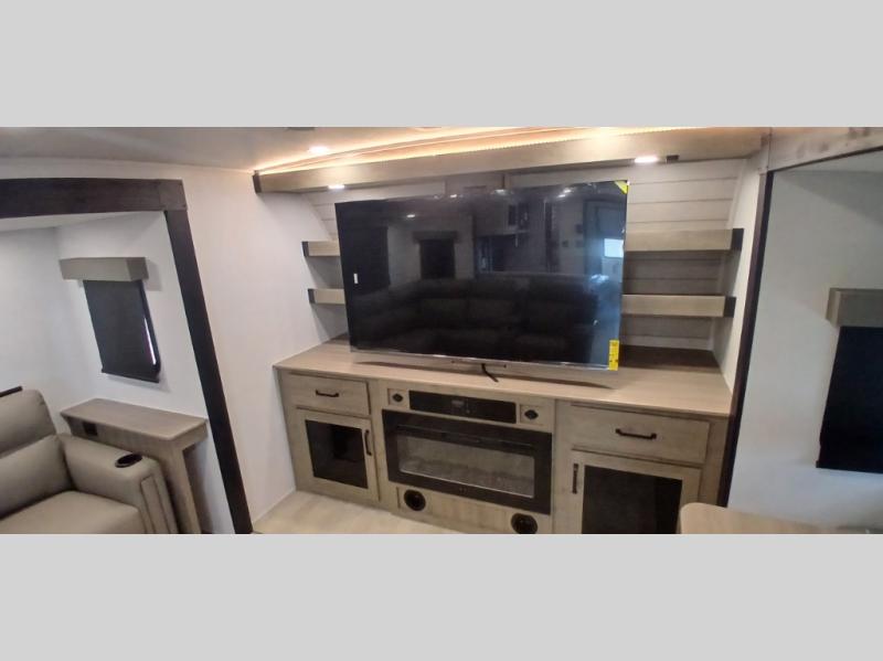 This travel trailer will feel just like home with its front living area, master bedroom, and triple slides for more space! You'll enjoy the sectional sofa and 63" dinette with two chairs on one side with a bench seat on the other. There is a front entertainment center where you can add an optional TV, and the fireplace will make it more cozy. A middle kitchen includes all the appliances to make meals each day, plus an electric refrigerator and pantry for food storage. Head towards the back to find the master bedroom with a king bed slide out, dual wardrobes, and a desk with drawers if you need to get some work done. And the full rear bath is super accommodating with its dual bath sinks plus washer and dryer prep!