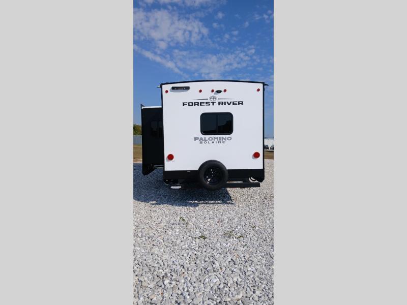 Each SolAire travel trailer by Palomino features a white gel coat exterior and an aluminum superstructure frame for lightweight towing. You will love having a power tongue jack for easy set up, plus slam latch baggage doors with magnets to make unloading easier than ever. There is also a power awning with LED lights and aluminum wheels included on the exterior. Each SolAire is constructed to last with Azdel composite, a fully laminated rear wall and roof, plus a fully enclosed and heated underbelly. The interior includes roller shades and kitchen backsplash, USB ports to keep your electronics charged, a Bluetooth stereo with speakers, and many more stand-out features!