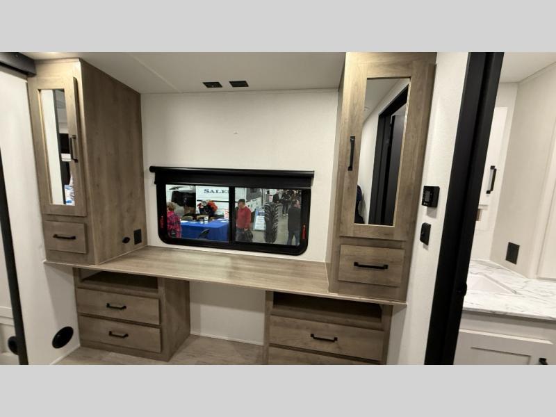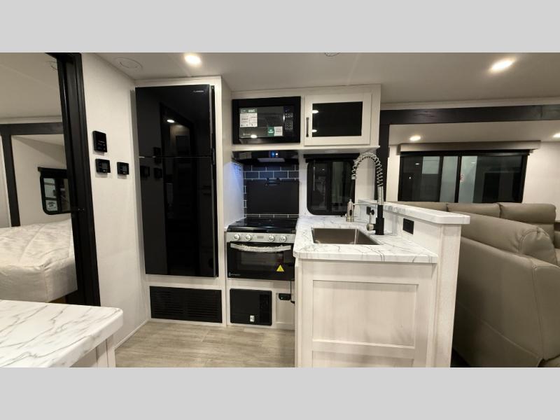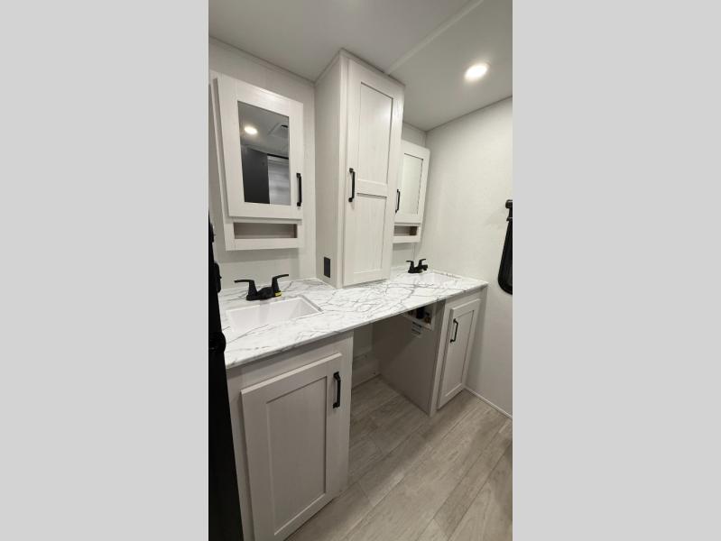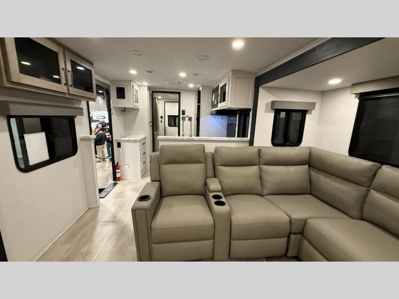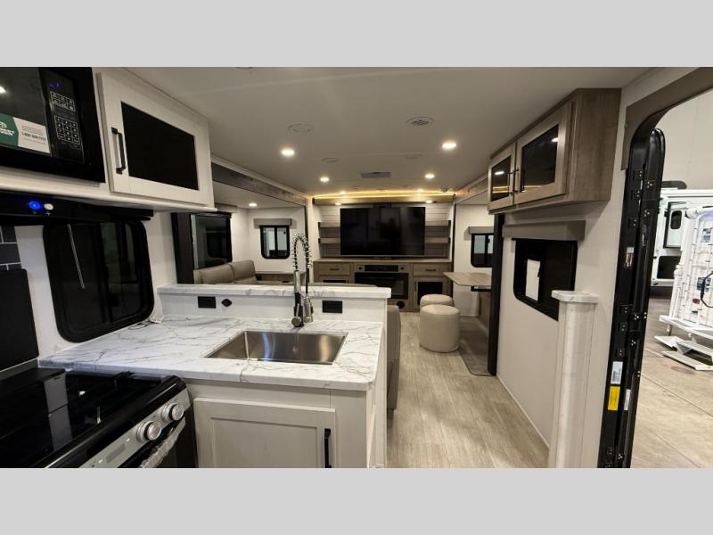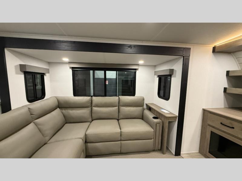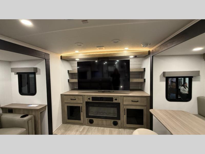 This travel trailer will feel just like home with its front living area, master bedroom, and triple slides for more space! You'll enjoy the L-shaped sofa with a tri-fold on one end and theater seats on the other. And there is a front entertainment center with a TV and fireplace to make it cozier. A middle kitchen includes all the appliances to make meals each day, plus an electric refrigerator and pantry for food storage. Head towards the back to find the master bedroom with a king bed slide out, dual wardrobes, and a desk with drawers if you need to get some work done. And the full rear bath is super accommodating with its dual bath sinks plus washer and dryer prep!