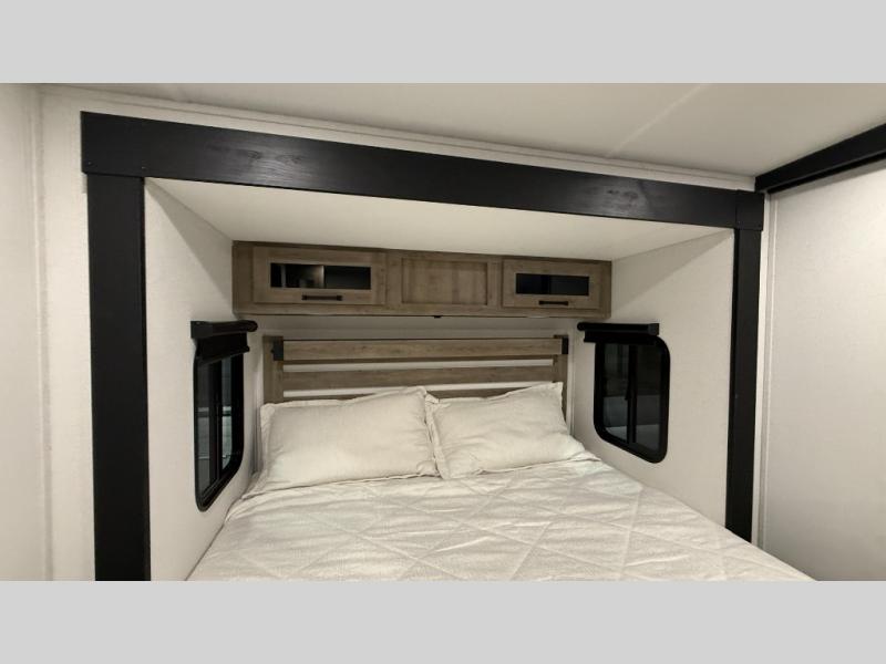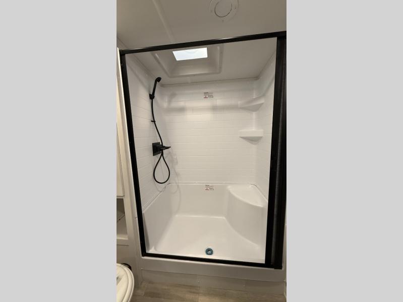 Each Solaire travel trailer by Forest River is constructed with a fully enclosed/heated underbelly for added protection against the elements, plus a fully laminated roof and rear wall for durability. The slam latch baggage doors with magnets will make it easier than ever to pack up your camp gear, and the power awning with LED lights will provide shade during the day and inviting ambiance at night. Head inside to enjoy the roller shades, smoked glass kitchen cabinet doors, stainless-steel sink, and LED lights to keep your space well lit. Some of the available options include a bedroom A/C, a Wi-Fi booster, heated holding tanks, and more!