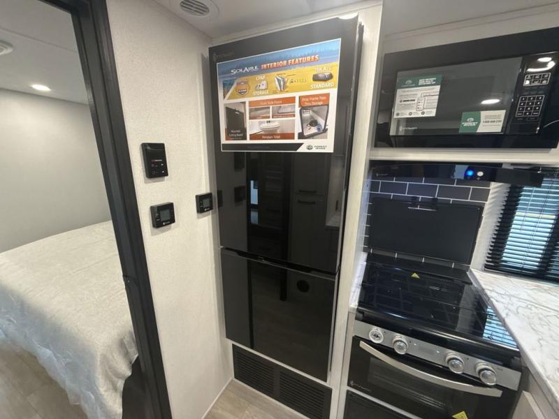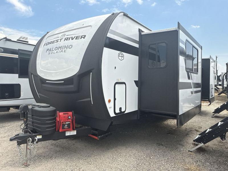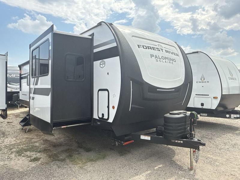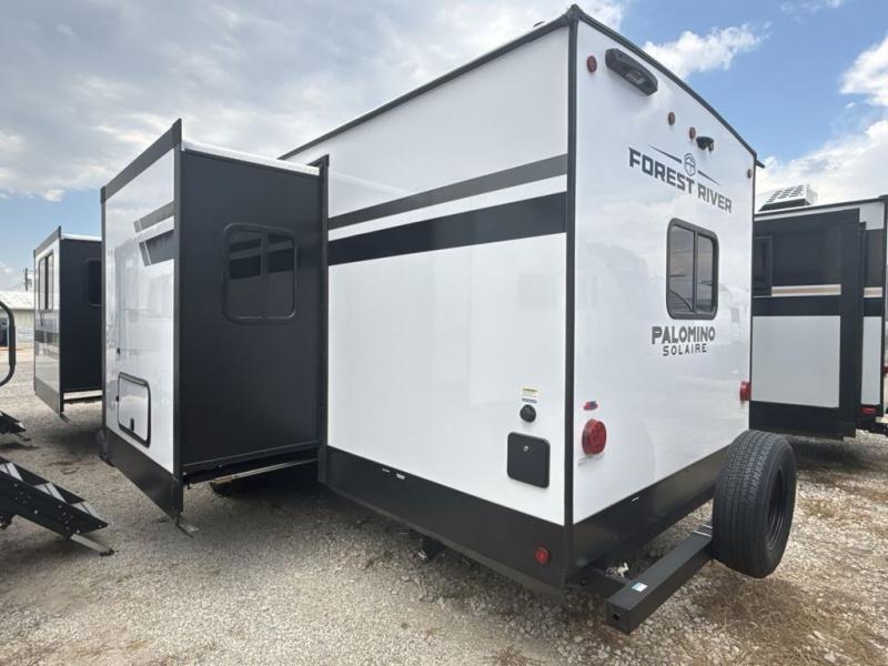 Each SolAire travel trailer by Palomino features a white gel coat exterior and an aluminum superstructure frame for lightweight towing. You will love having a power tongue jack for easy set up, plus slam latch baggage doors with magnets to make unloading easier than ever. There is also a power awning with LED lights and aluminum wheels included on the exterior. Each SolAire is constructed to last with Azdel composite, a fully laminated rear wall and roof, plus a fully enclosed and heated underbelly. The interior includes roller shades and kitchen backsplash, USB ports to keep your electronics charged, a Bluetooth stereo with speakers, and many more stand-out features!
