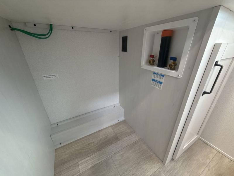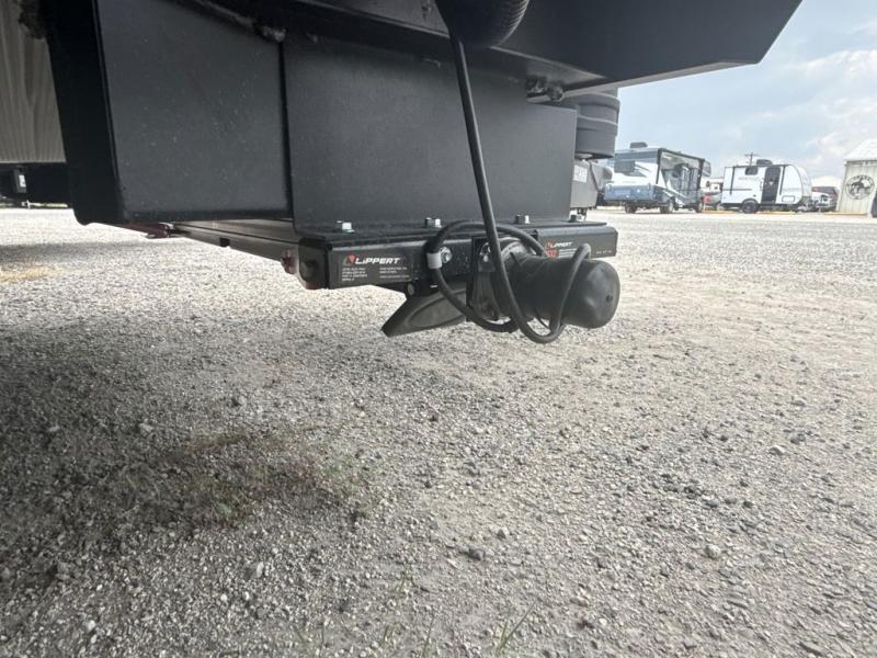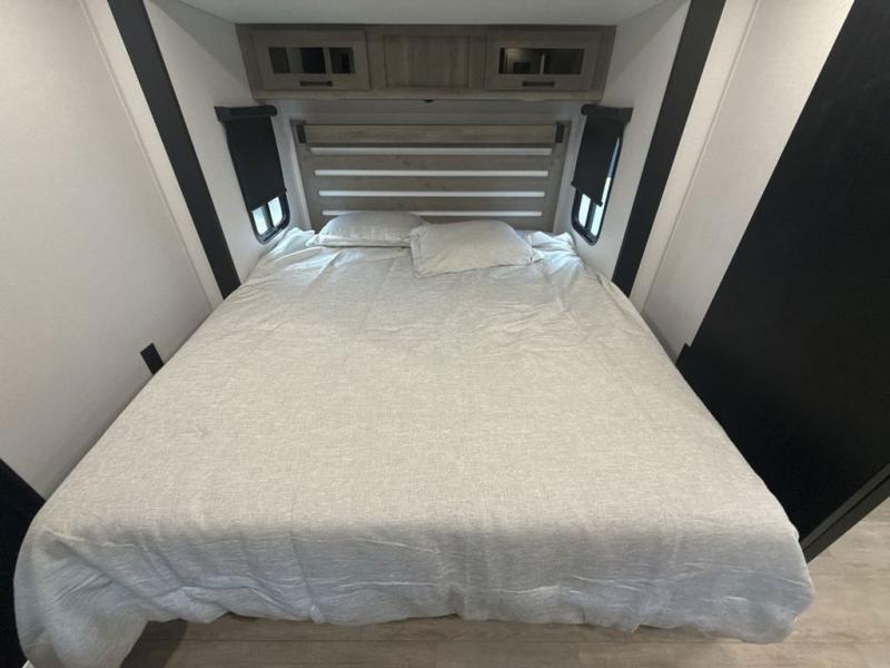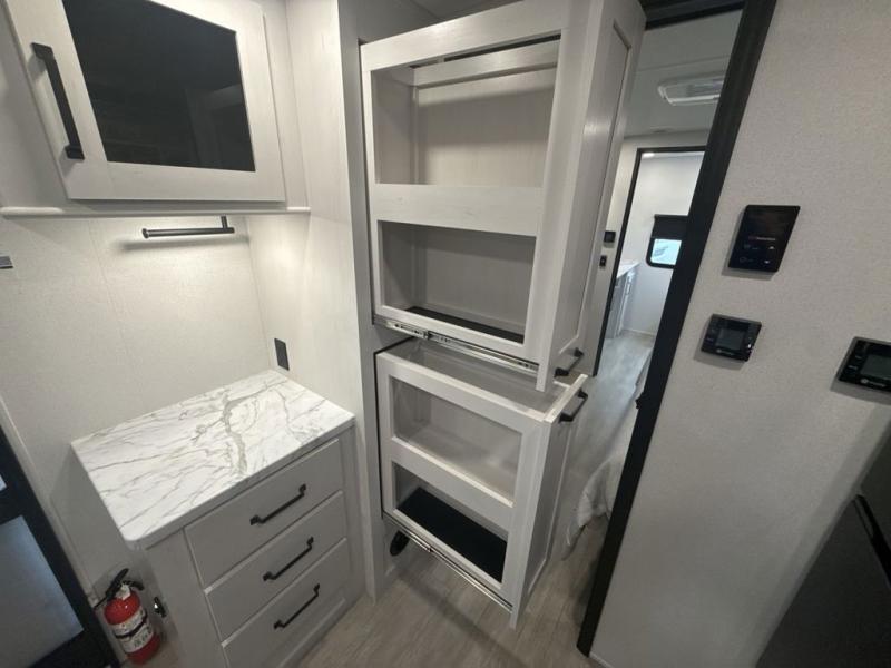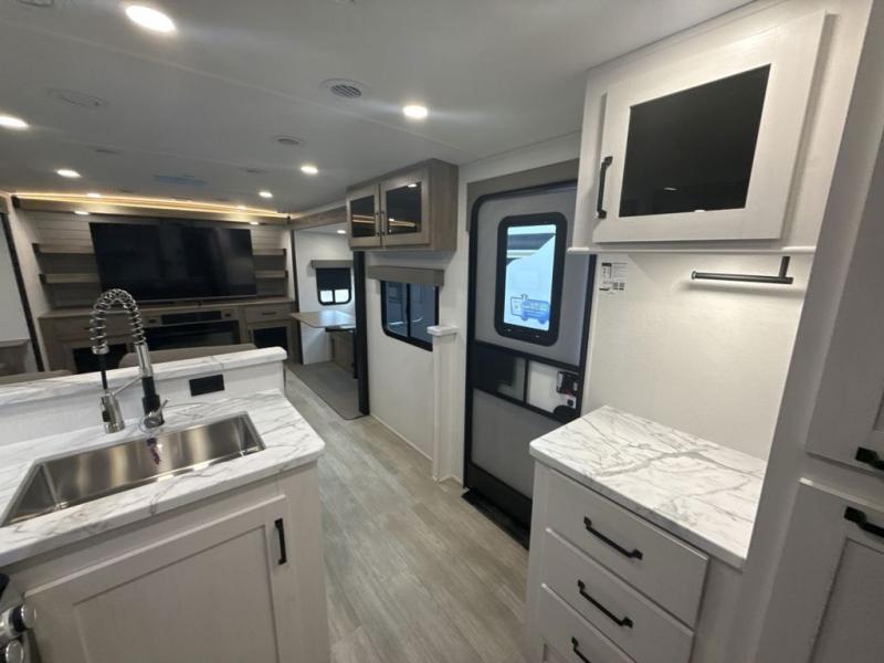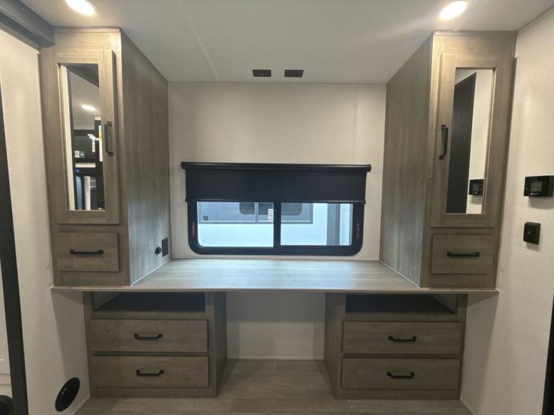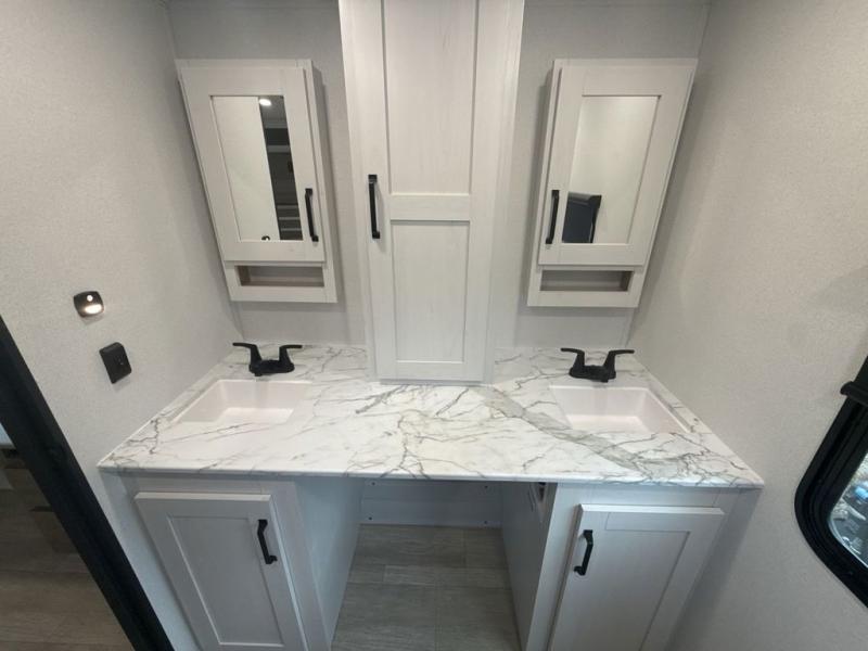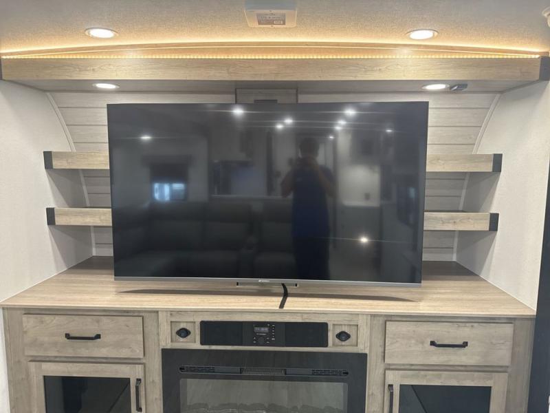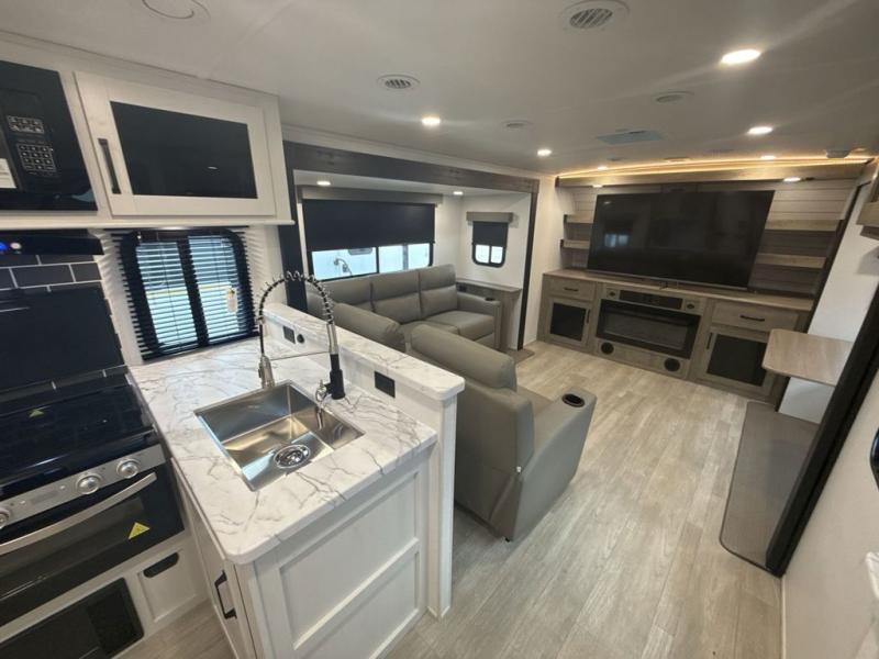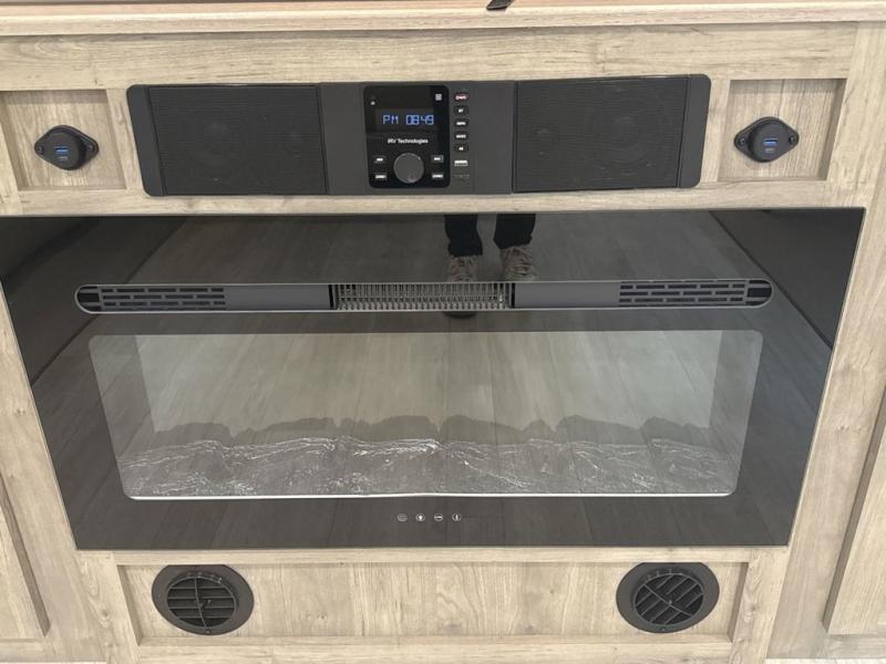 This travel trailer will feel just like home with its front living area, master bedroom, and triple slides for more space! You'll enjoy the sectional sofa and 63" dinette with two chairs on one side with a bench seat on the other. There is a front entertainment center where you can add an optional TV, and the fireplace will make it more cozy. A middle kitchen includes all the appliances to make meals each day, plus an electric refrigerator and pantry for food storage. Head towards the back to find the master bedroom with a king bed slide out, dual wardrobes, and a desk with drawers if you need to get some work done. And the full rear bath is super accommodating with its dual bath sinks plus washer and dryer prep!