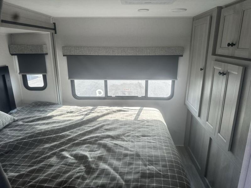 Pack your bags and pick your favorite destination then head out in this motorhome! The rear private bedroom has a 60" x 74" queen bed slide for more interior space, and a linen closet with wardrobes on either side of it. There is also a split-style bath with a private toilet and sink, and the shower is right across the hall. Prepare your best home cooked meals using the three burner cooktop, enjoy dining at the U-shaped dinette, and store any leftovers in the 10.7 cu. ft. 12V refrigerator. You will also appreciate the flip-up countertop for more meal prepping space. Relax each evening on the 66" sofa, or you can replace it for the optional power theater seating. There is even a 60" x 80" bunk over the cab for extra sleeping or storage space!