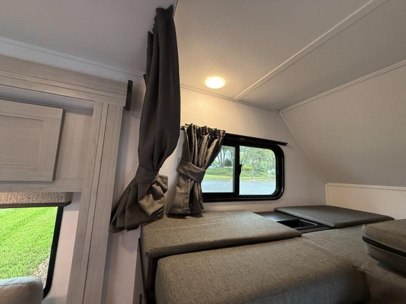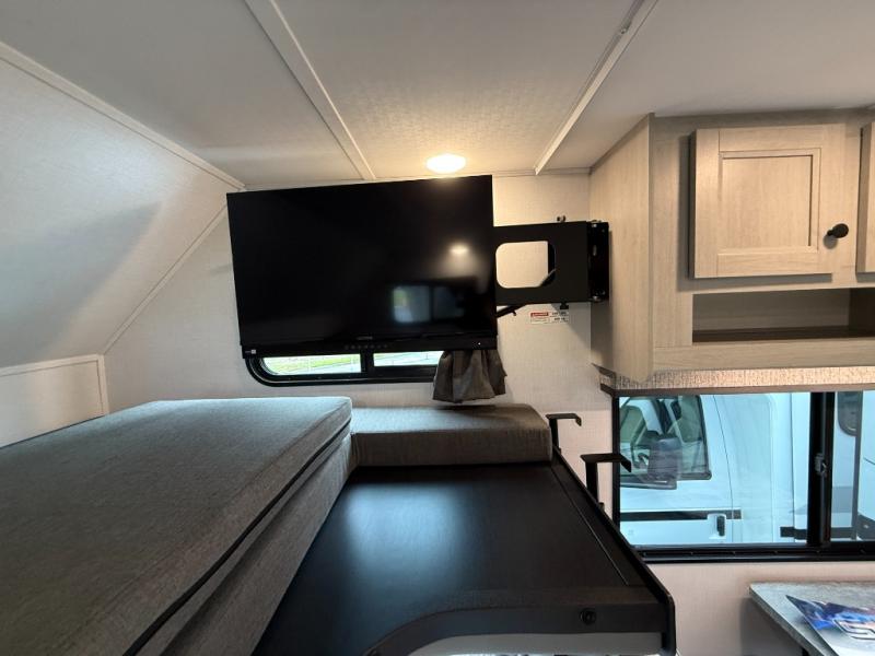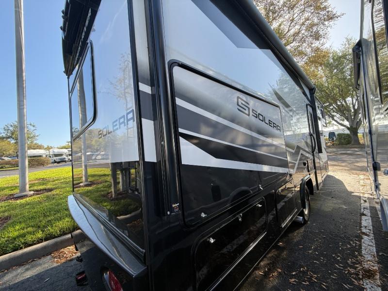 Inside, two slide-outs create a roomy living area with a large dinette and comfortable space to relax. The cab-over bunk adds extra sleeping capacity, allowing the Solera to sleep up to eight travelers.