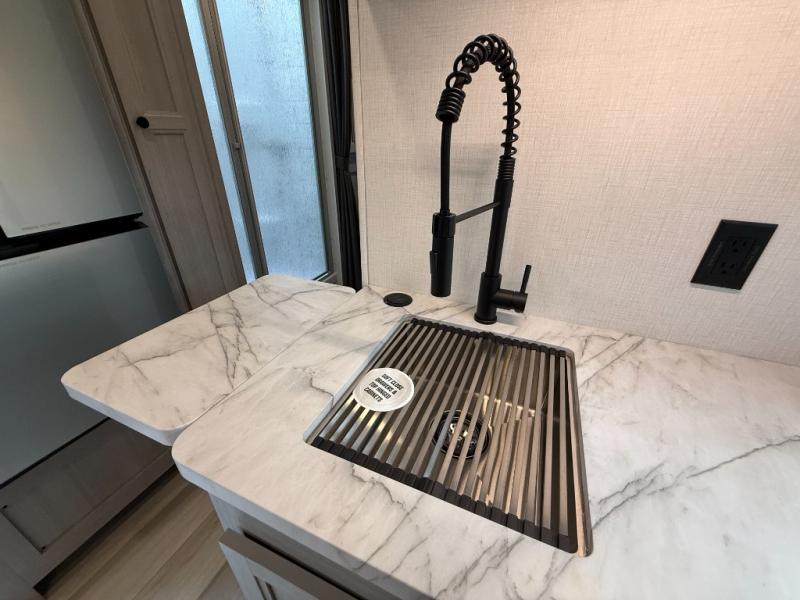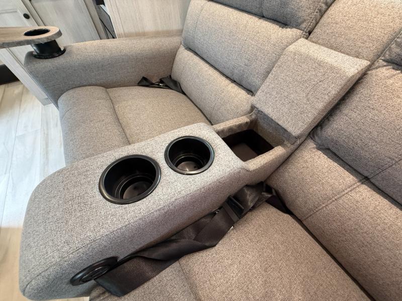 The kitchen includes a 3-burner cooktop, convection microwave, and large refrigerator, giving you everything needed to prepare meals on the road.