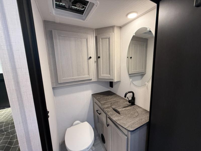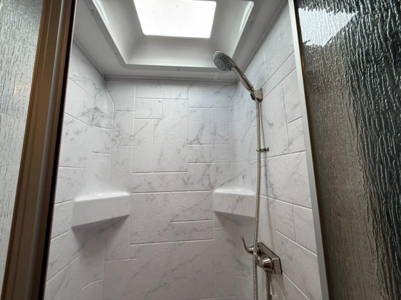 In the rear, a private bedroom with a queen bed slide and wardrobe storage provides a quiet place to recharge. The split bathroom layout makes it easy for multiple people to get ready at the same time.
