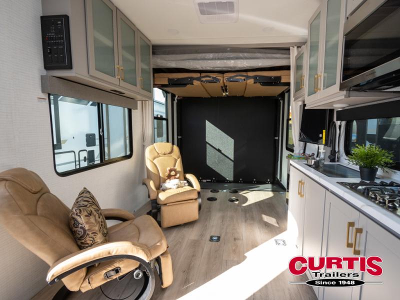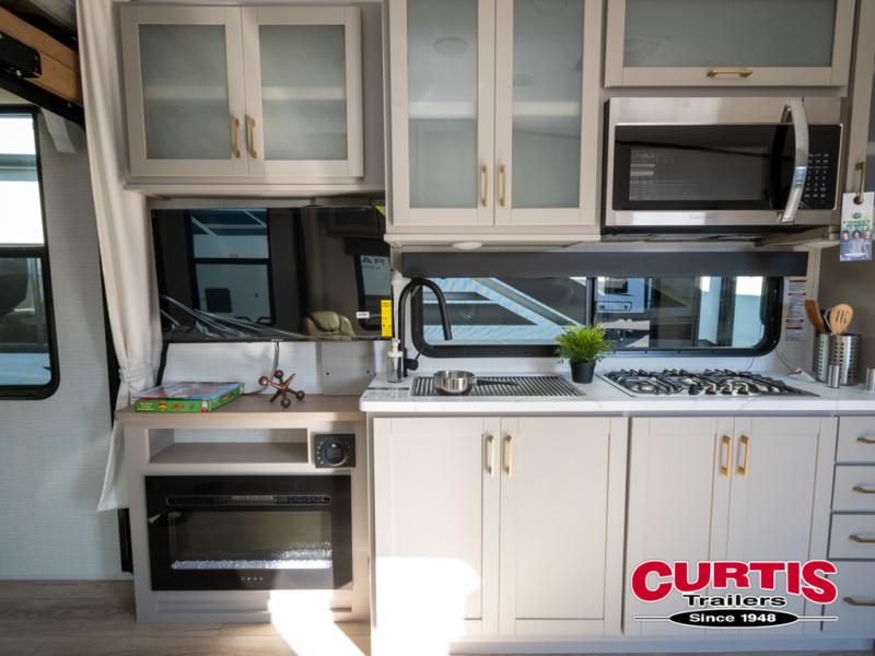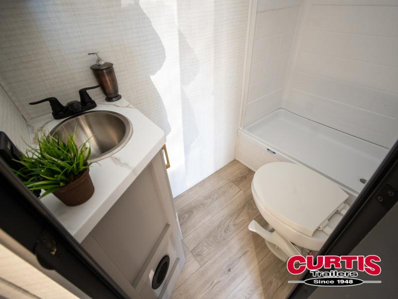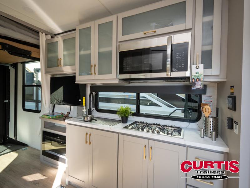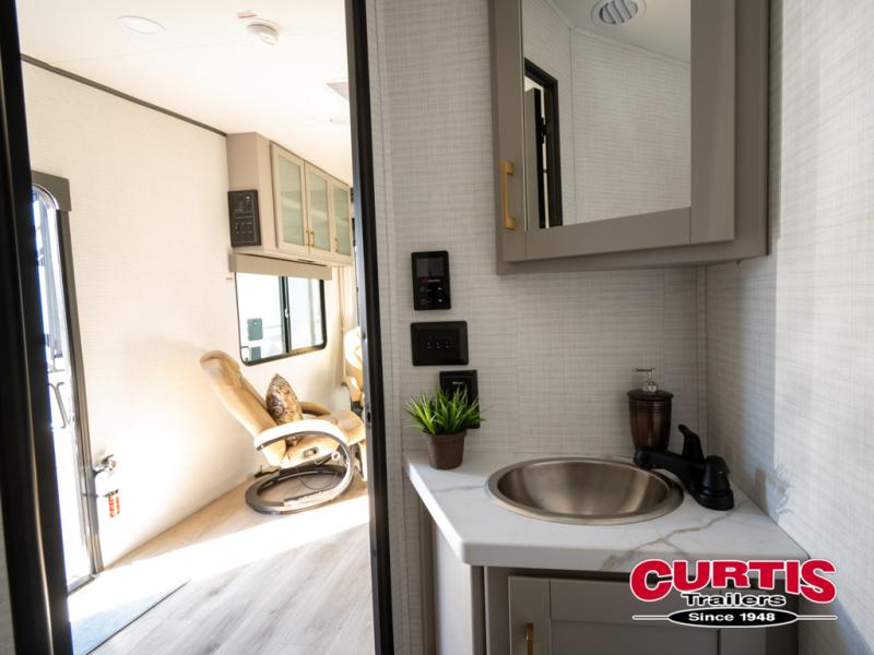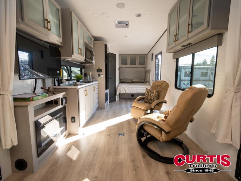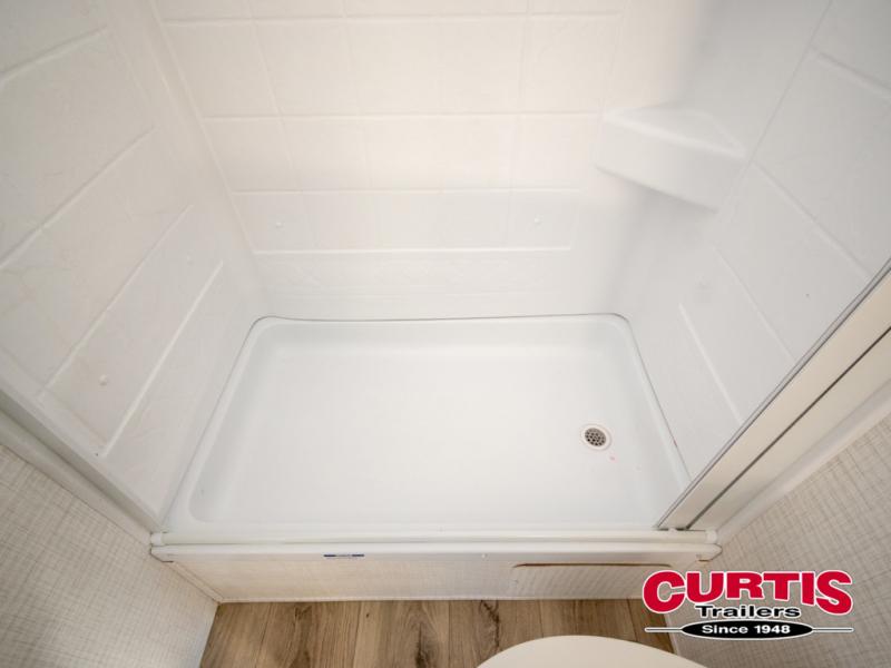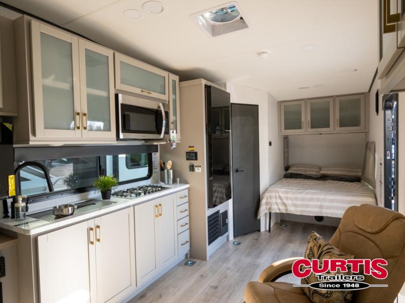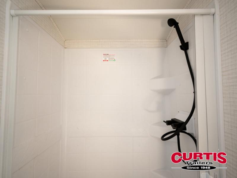 You will love this travel trailers' Murphy bed, since it is a clever space-saver, folding up to reveal a handy dresser below. Store your gear, clothes, and essentials in the dressers drawers, and enjoy a peaceful night's sleep. The pass-thru dinette is perfect for fueling up before a big day, and doubles as a convenient space to load and unload your toys. Further, the electric bed is a comfy spot to relax and unwind, perfect for after a long day of exploring. Plus, the entertainment center is great for fun nights in, and the convection microwave makes meal prep a breeze. Ample overhead cabinets provide storage for snacks, gear, and more, and the fridge keeps drinks cold. The full bathroom is a refreshing haven perfect for getting ready for the day or unwind after a big adventure.