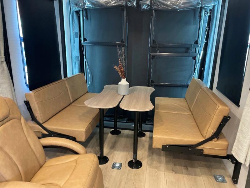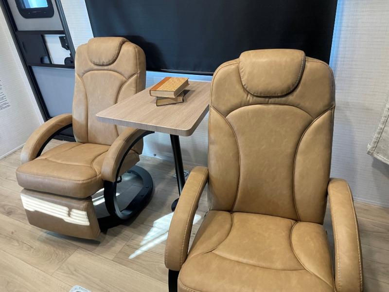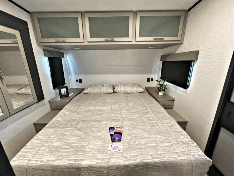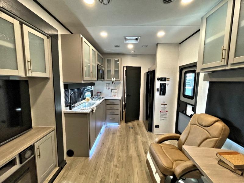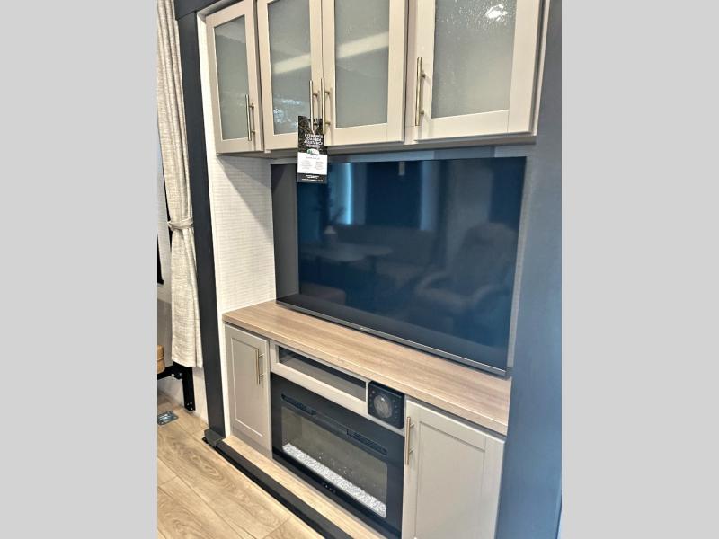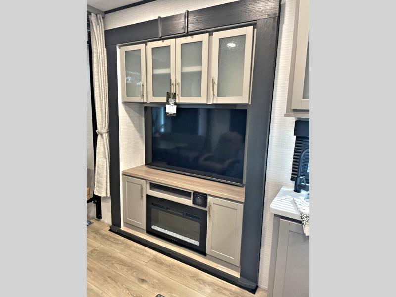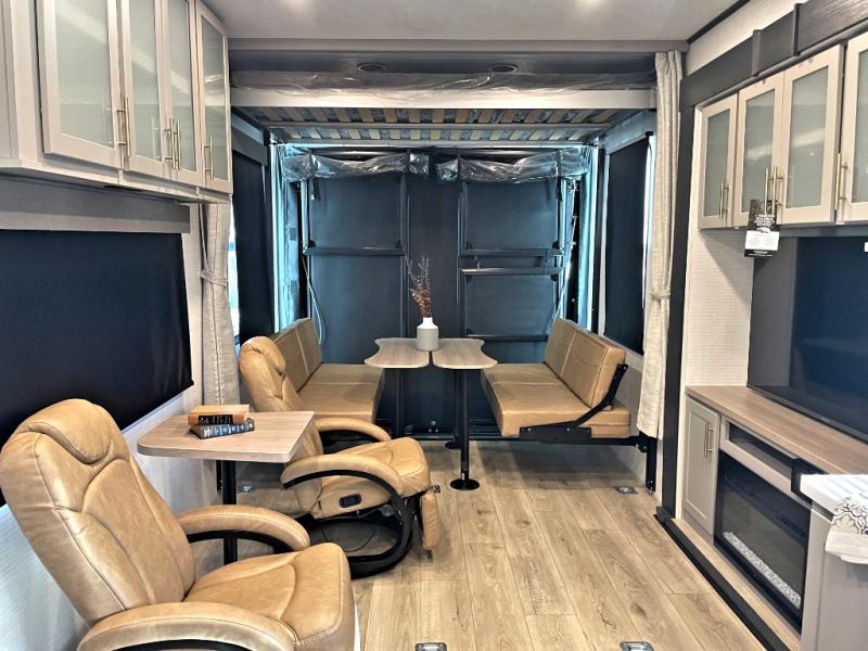 Are you looking for a travel trailer that can haul your favorite riding toys and still provide at-home comforts? This toy hauler is the one with 15' 1" total garage space, a front master bedroom with a king bed and dresser slide out, and a walk-through bath! The main living area also includes many comforts, like the dual lounge chairs, entertainment center slide out with a fireplace, and full kitchen. Your guests will find their beds on the electric pass-thru dinette or the drop-down electric bed!