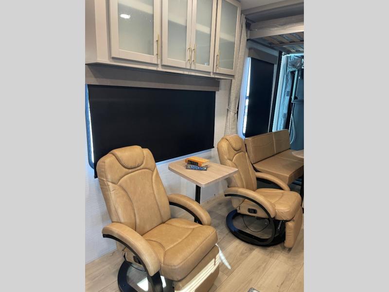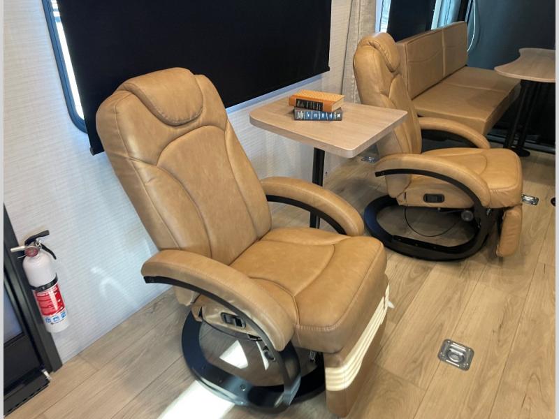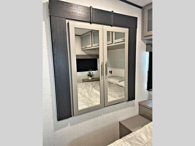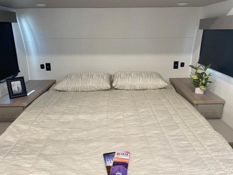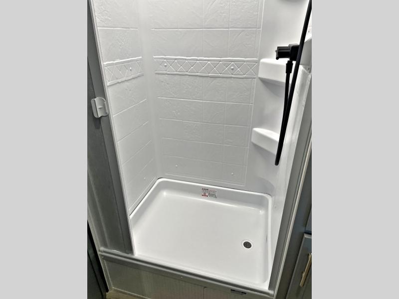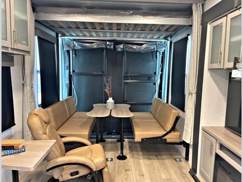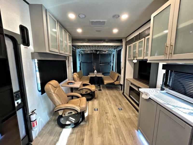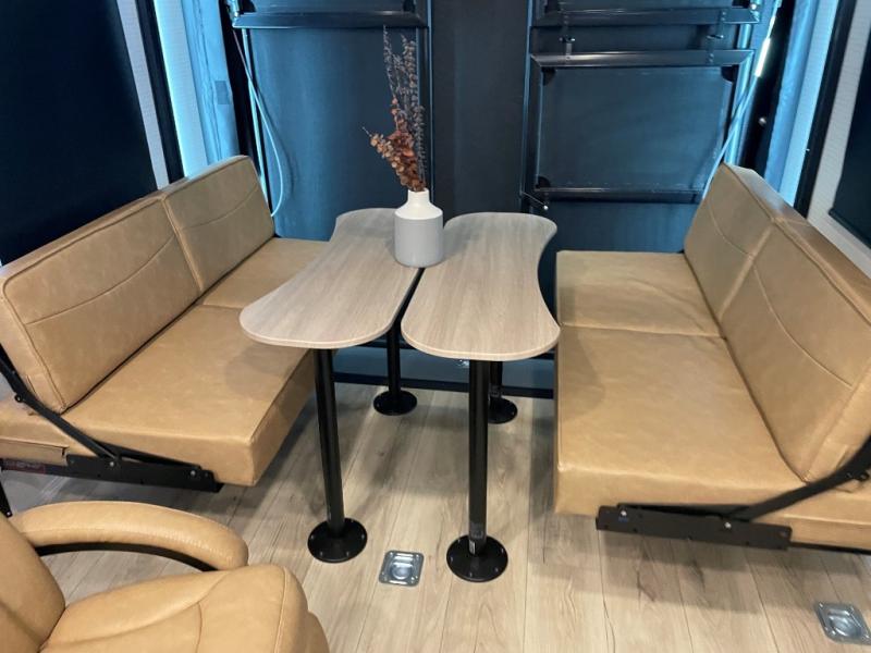 Are you looking for a travel trailer that can haul your favorite riding toys and still provide at-home comforts? This toy hauler is the one with 15' 1" total garage space, a front master bedroom with a king bed and dresser slide out, and a walk-through bath! The main living area also includes many comforts, like the dual lounge chairs, entertainment center slide out with a fireplace, and full kitchen. Your guests will find their beds on the electric pass-thru dinette or the drop-down electric bed!