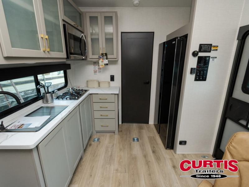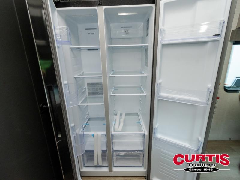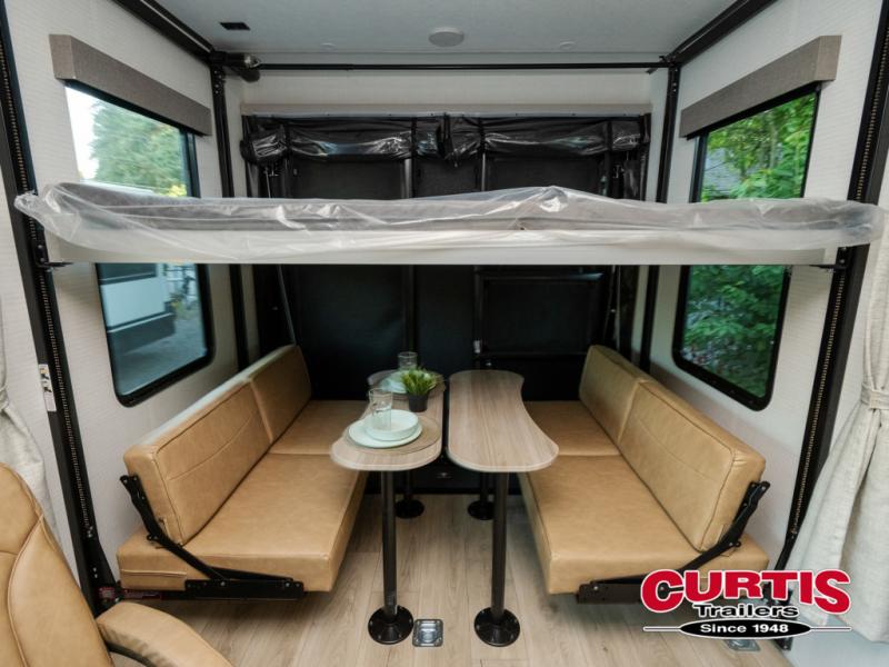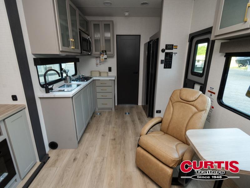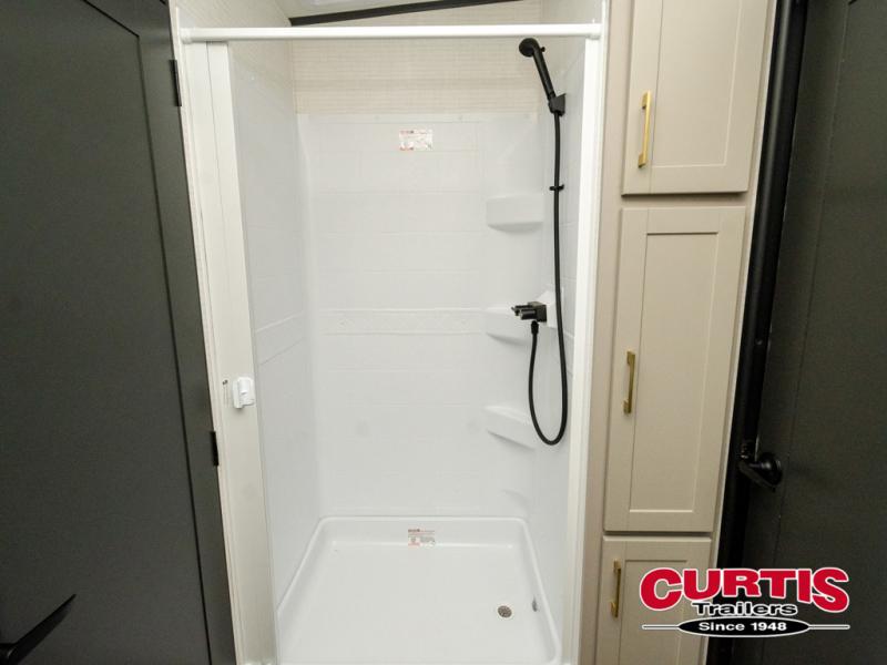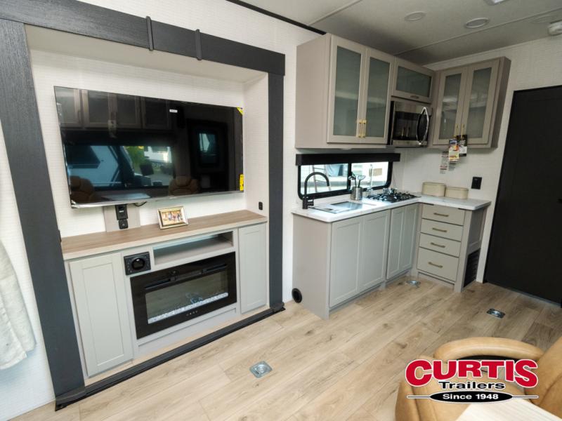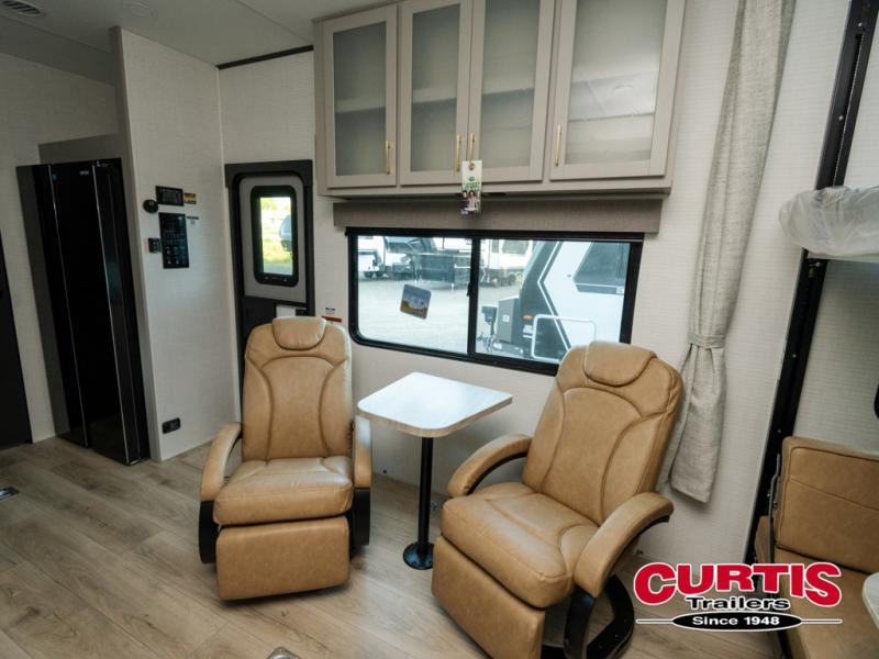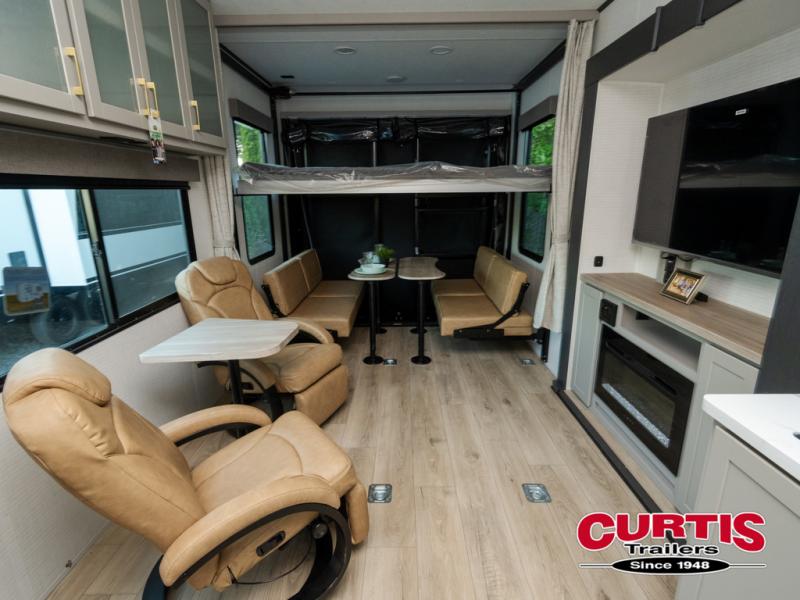 Are you looking for a travel trailer that can haul your favorite riding toys and still provide at-home comforts? This toy hauler is the one with 15' 1" total garage space, a front master bedroom with a king bed and dresser slide out, and a walk-through bath! The main living area also includes many comforts, like the dual lounge chairs, entertainment center slide out with a fireplace, and full kitchen. Your guests will find their beds on the electric pass-thru dinette or the drop-down electric bed!