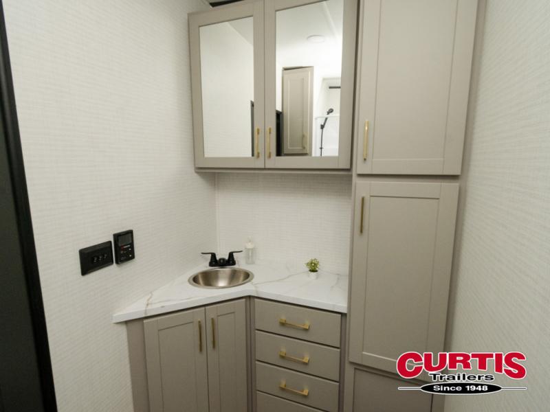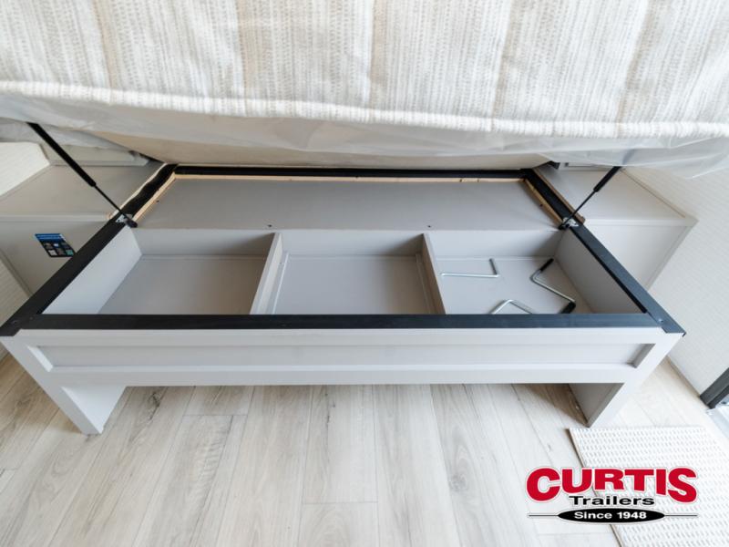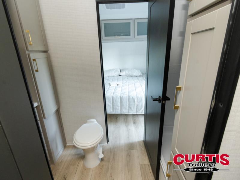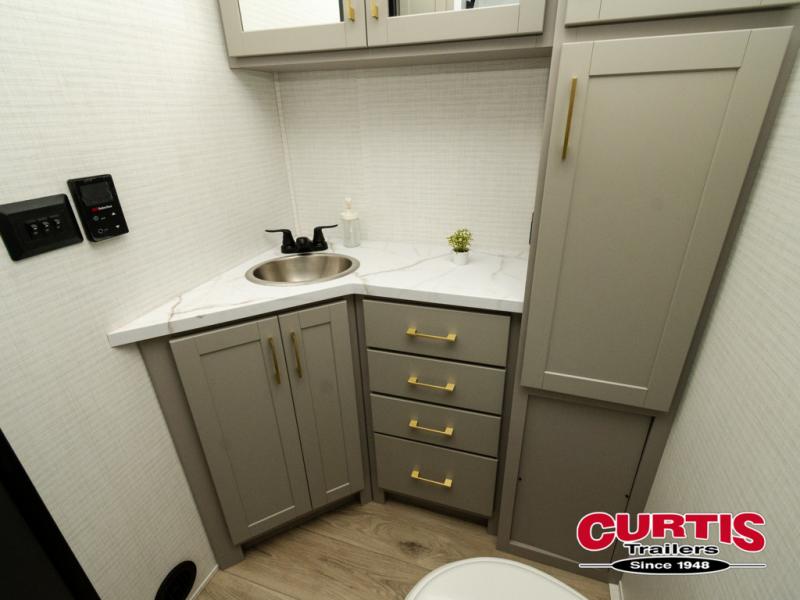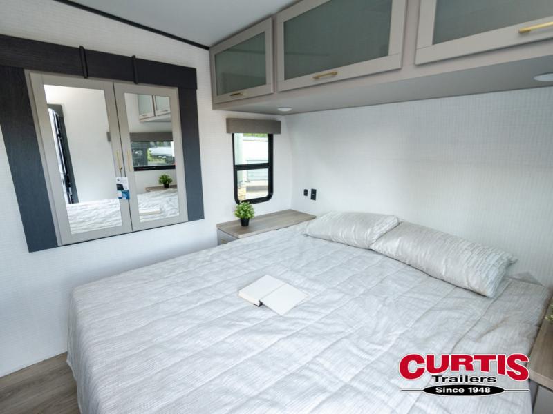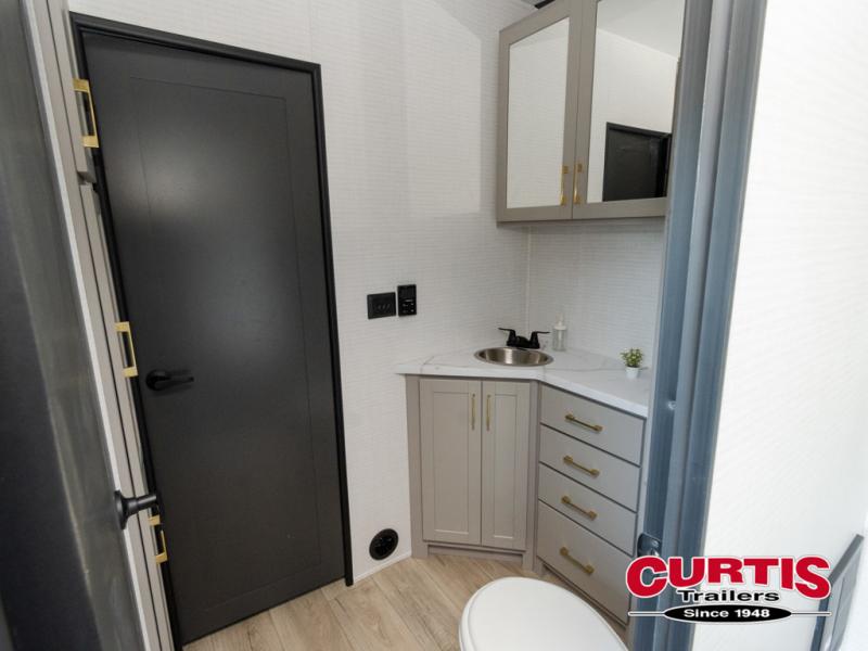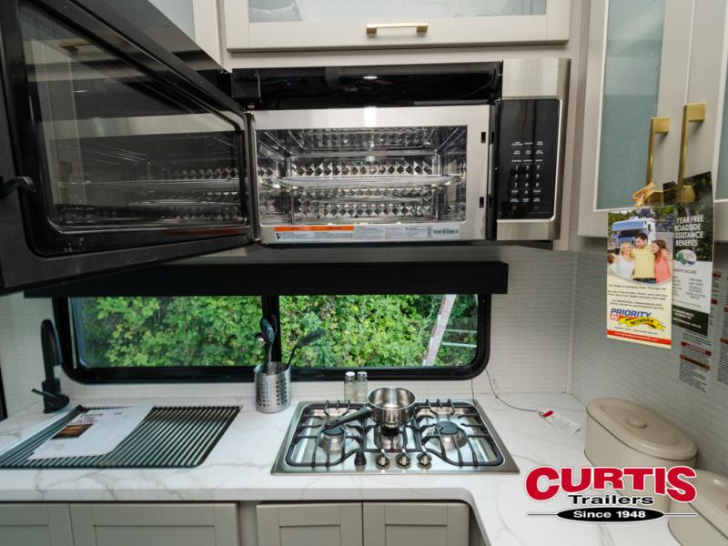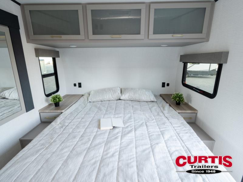 Are you looking for a travel trailer that can haul your favorite riding toys and still provide at-home comforts? This toy hauler is the one with 15' 1" total garage space, a front master bedroom with a king bed and dresser slide out, and a walk-through bath! The main living area also includes many comforts, like the dual lounge chairs, entertainment center slide out with a fireplace, and full kitchen. Your guests will find their beds on the electric pass-thru dinette or the drop-down electric bed!