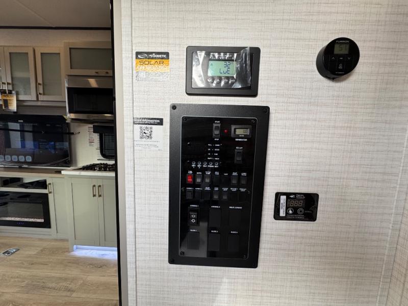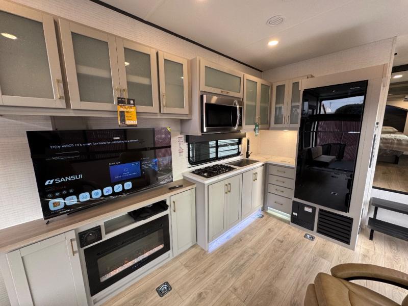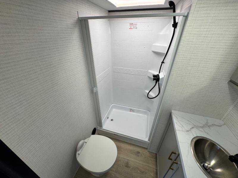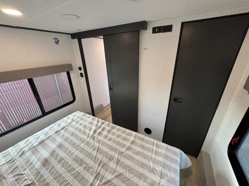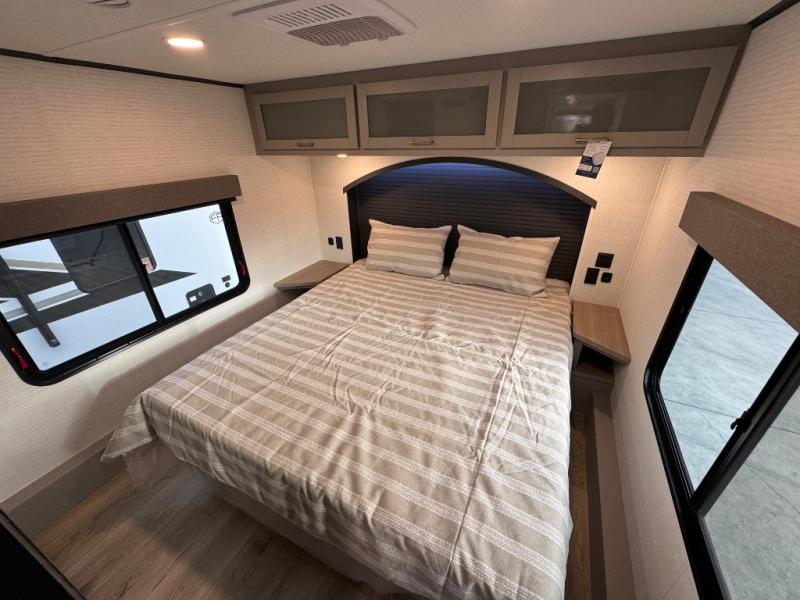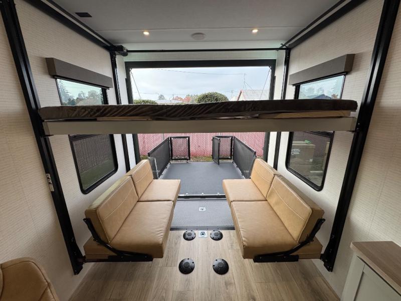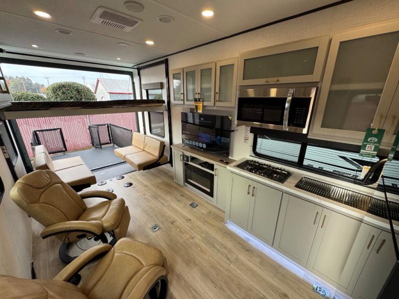 This toy hauler features 15' 7" of total garage space so you can easily fit your toys in! Once they're unloaded, you can relax on the electric pass-thru dinette or dual lounge chairs. You'll find a cooktop in the kitchen, a refrigerator to keep perishables fresh, and plenty of counter space to prep meals. The full bath will let you clean up after trail riding, and the front private bedroom with a king bed is sure to bring a great night's rest.