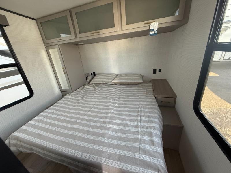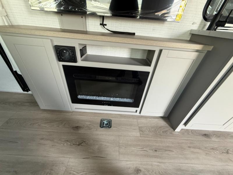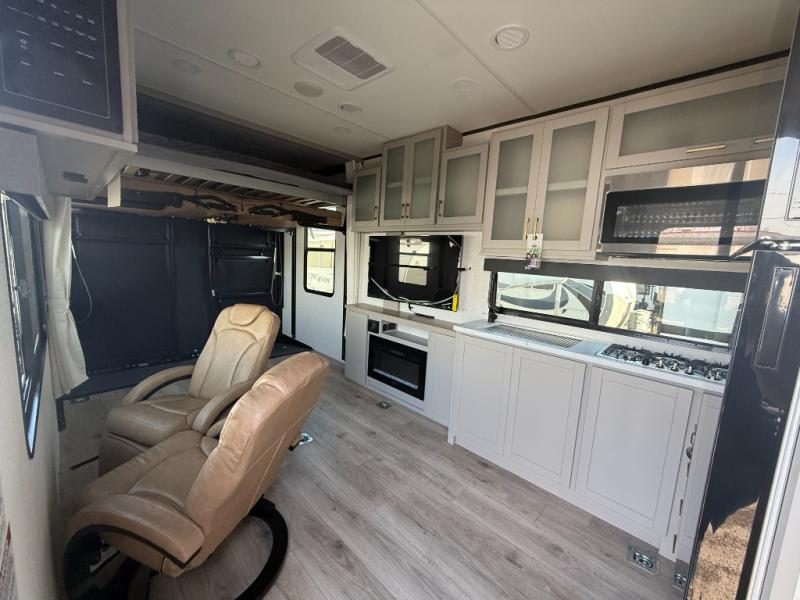 Spend your weekends riding the trails with this toy hauler in tow! There is 16' 1" total garage space for your toys and a ramp door for quick unloading. While the chef of your group is preparing lunch on the cooktop, everyone else can play a card game at the electric pass-thru dinette. This model includes an entertainment center directly across from the dual lounge chairs for all-around comfort. The king bed in the front private bedroom is sure to bring a great night's rest, while your guests sleep on the dinette or drop-down electric bed above!