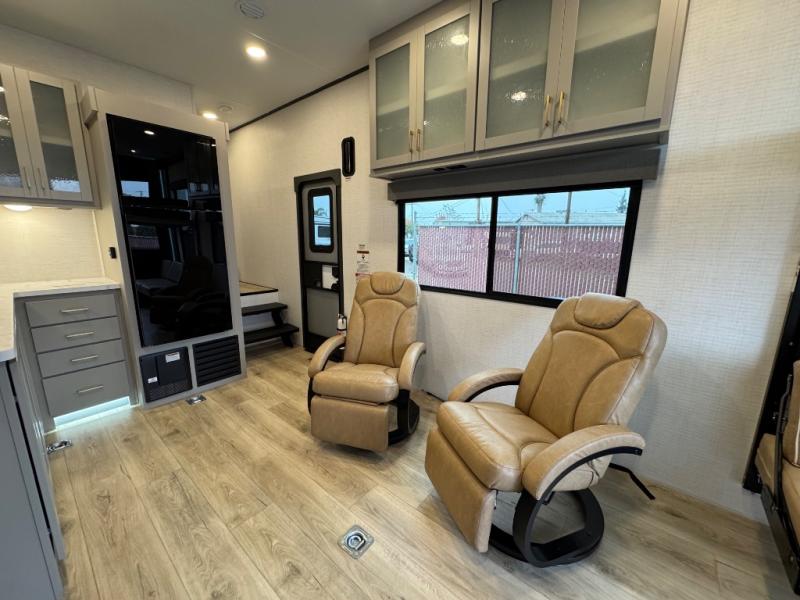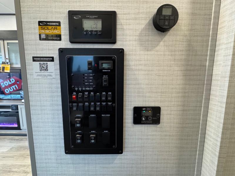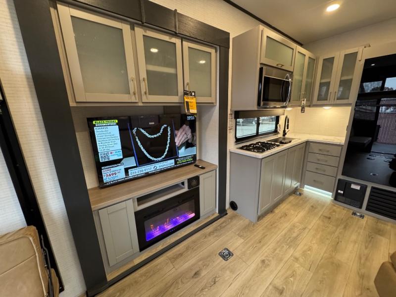 Inside, enjoy a cozy fireplace, entertainment slide, full kitchen, and spacious bathroom. Up front, the private bedroom features a king bed and dresser slide for added room and storage.