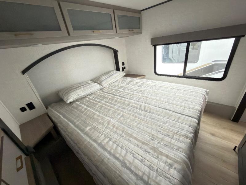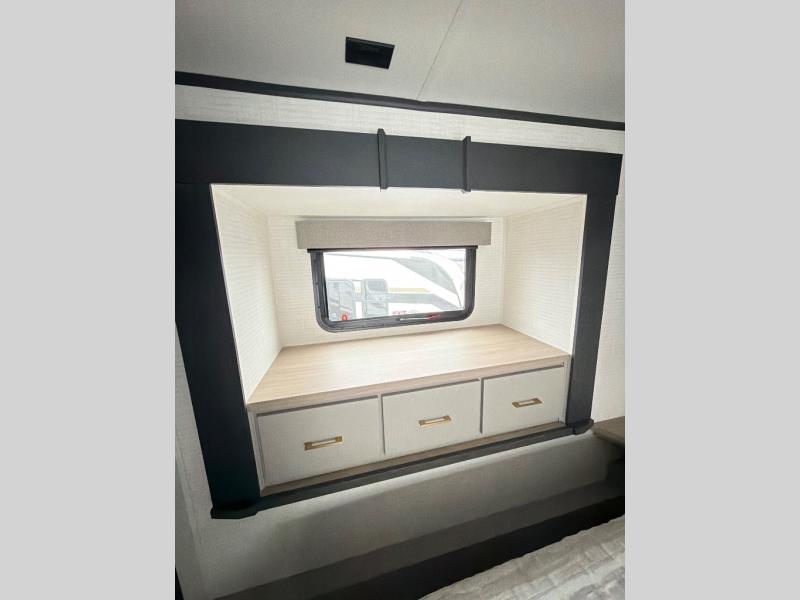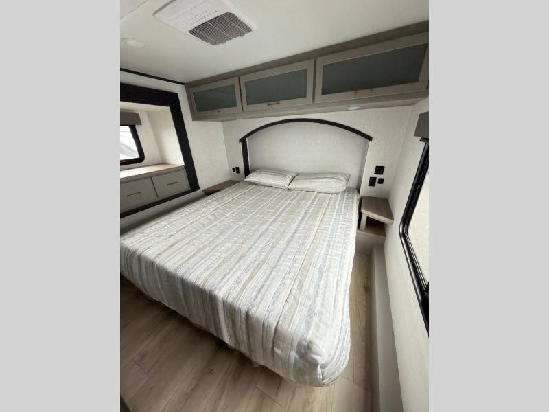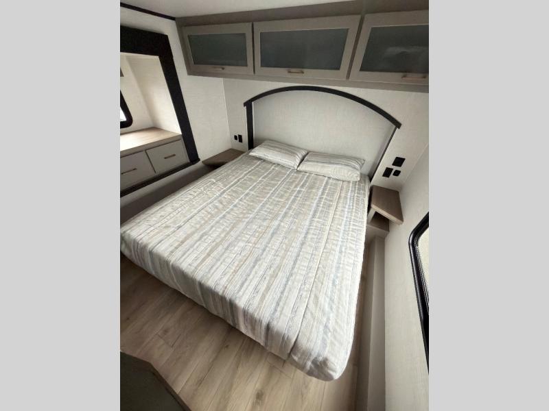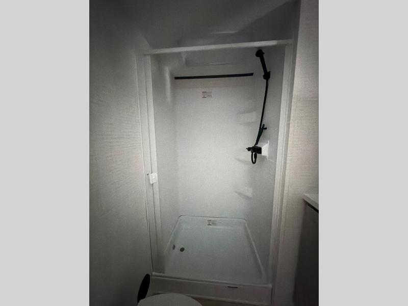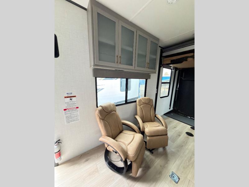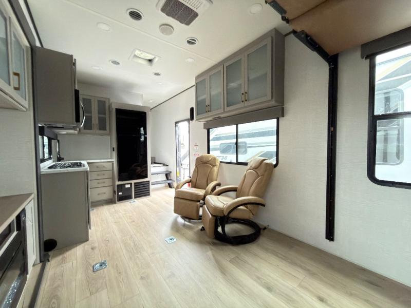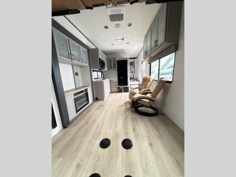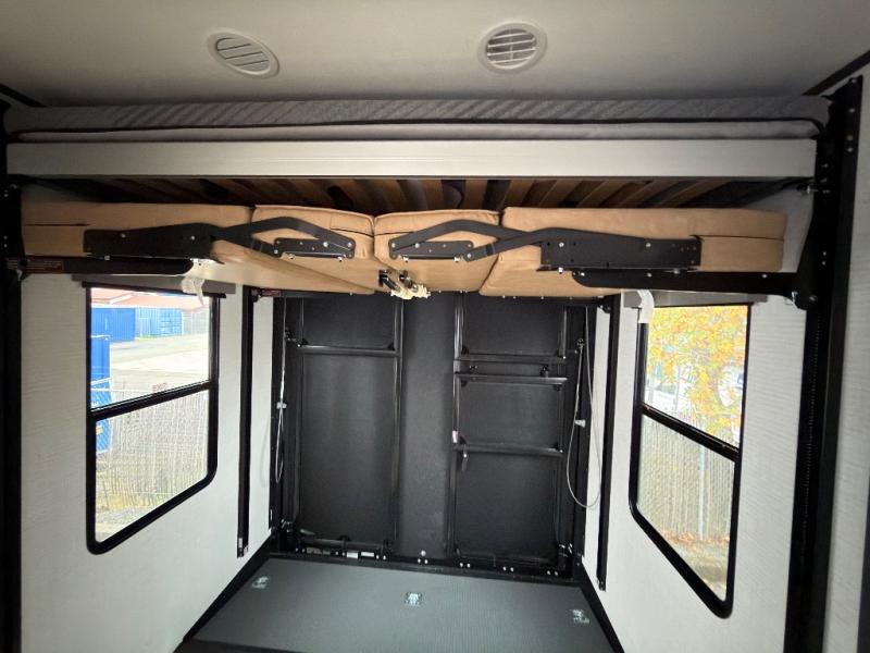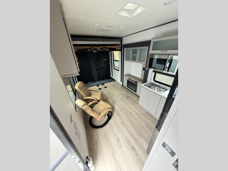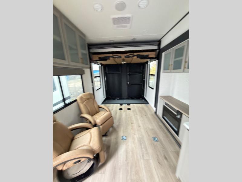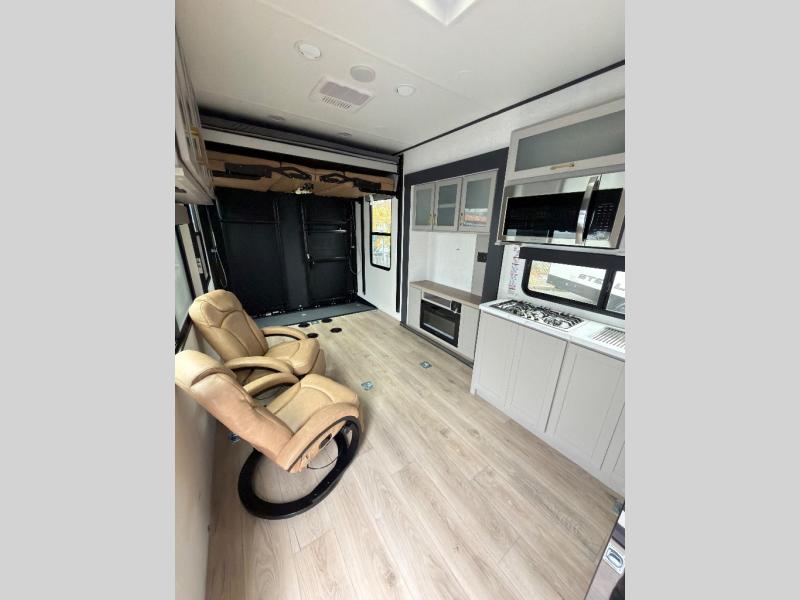 This toy hauler features 15' 7" of total garage space so you can easily fit your toys in! Once they're unloaded, you can relax on the electric pass-thru dinette or dual lounge chairs. There is also an entertainment center slide here. You'll find a cooktop and convection microwave in the kitchen to make meals each day. The full bath will let you clean up after trail riding, and the front private bedroom with a king bed is sure to bring a great night's rest. There is also a dresser slide out in the bedroom for added storage and space!