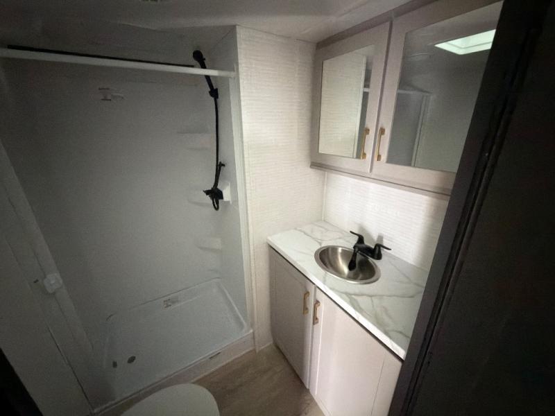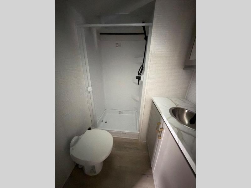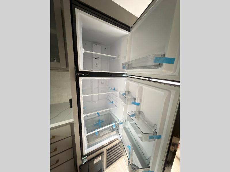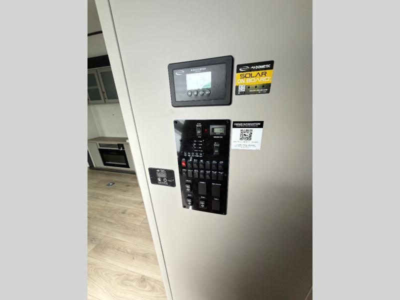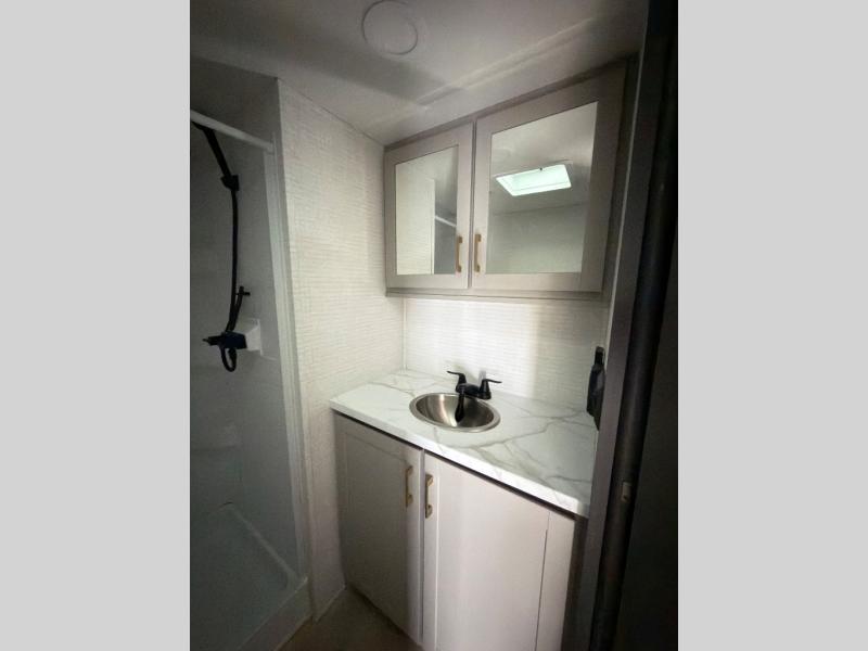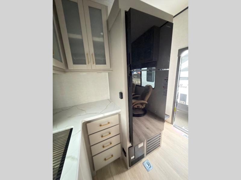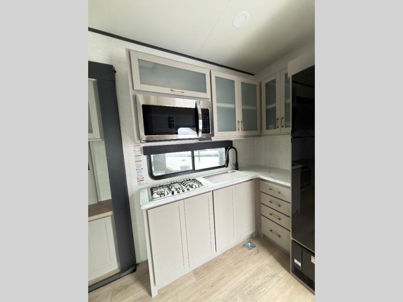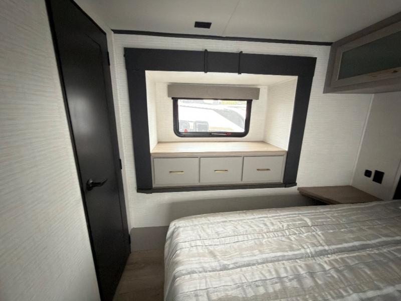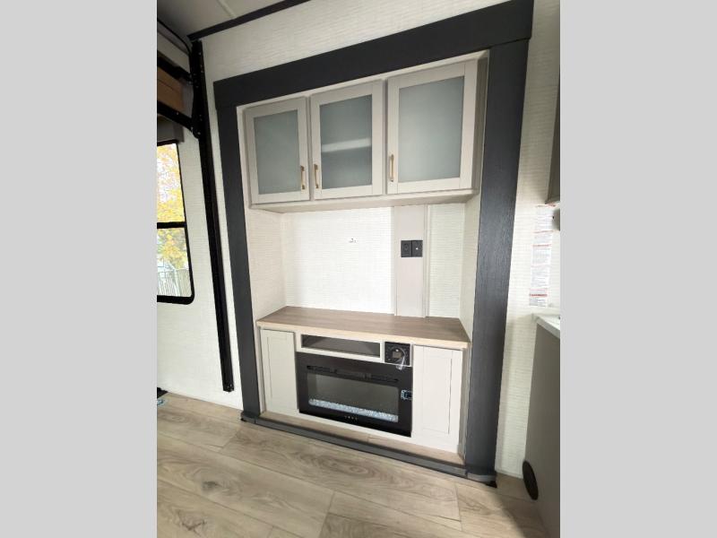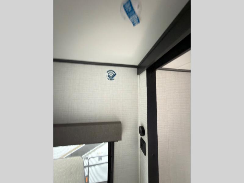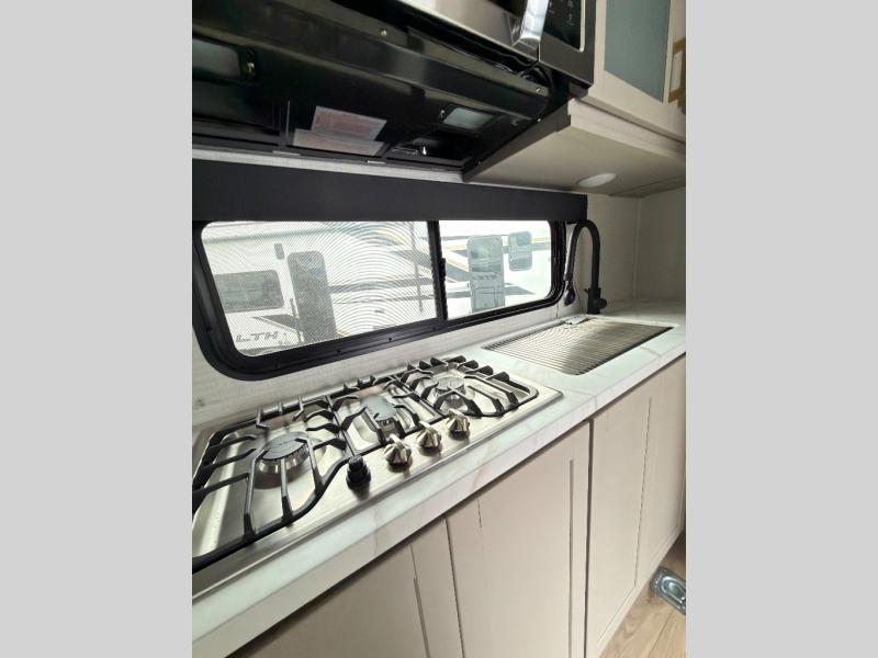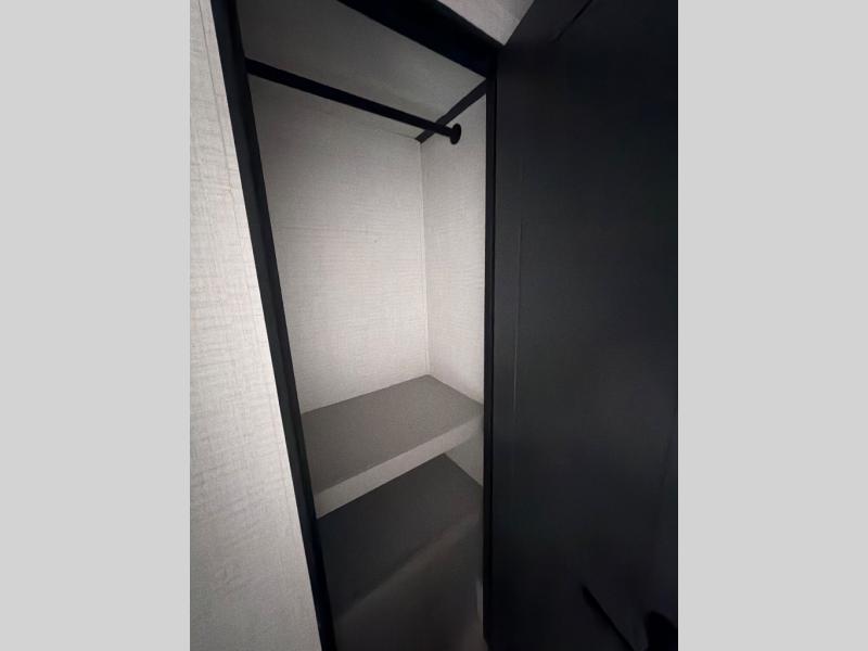 This toy hauler features 15' 7" of total garage space so you can easily fit your toys in! Once they're unloaded, you can relax on the electric pass-thru dinette or dual lounge chairs. There is also an entertainment center slide here. You'll find a cooktop and convection microwave in the kitchen to make meals each day. The full bath will let you clean up after trail riding, and the front private bedroom with a king bed is sure to bring a great night's rest. There is also a dresser slide out in the bedroom for added storage and space!