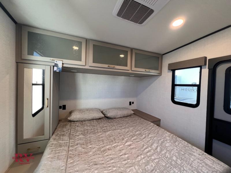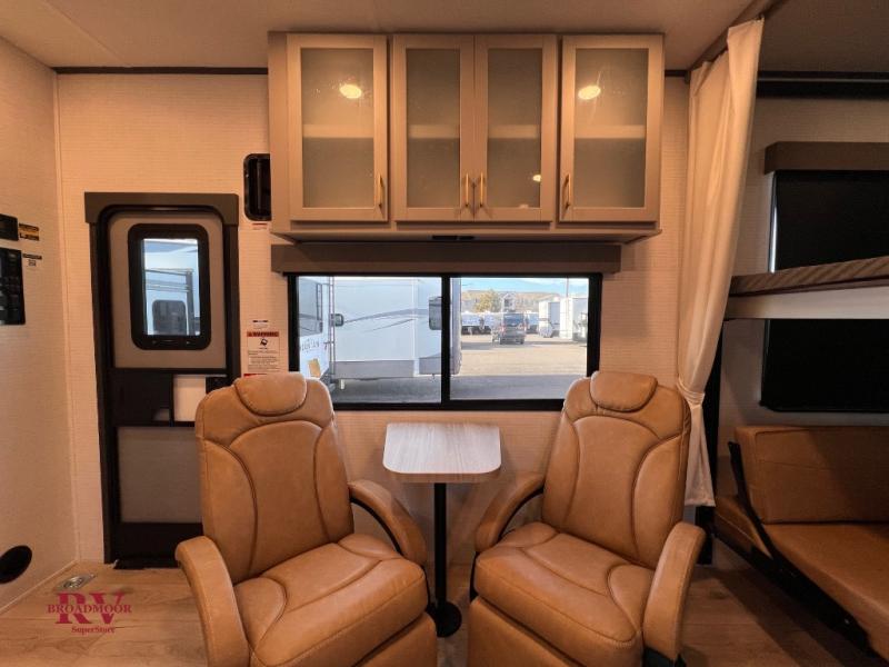 This dual entry travel trailer is sure to meet all your needs. Once you arrive at the campground, unload your toys from the 15' 7" total garage space, then grab a cold drink from the refrigerator. You can then relax on the dual lounge chairs, play a game at the electric pass-thru dinette, or let your guests rest on the electric bed. If you need a rest yourself, you'll find the king bed in the front master bedroom ultra comfortable. This model also includes an entertainment center with a fireplace and a kitchen slide out with the sink, counter space, cooktop, and pantry!
