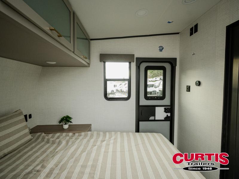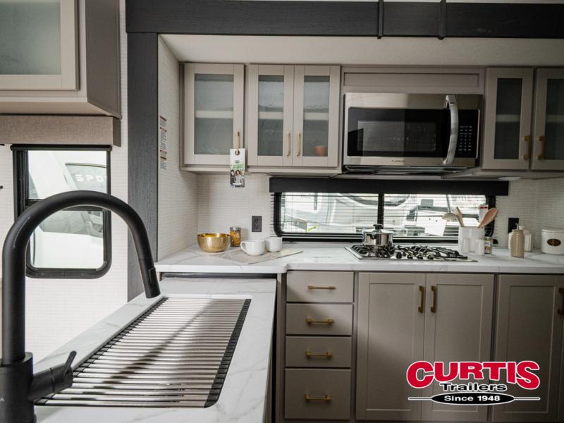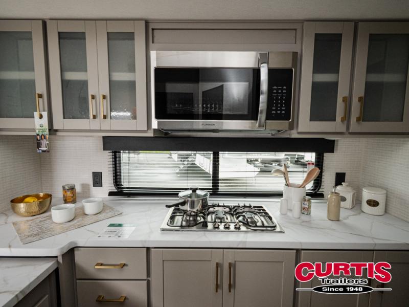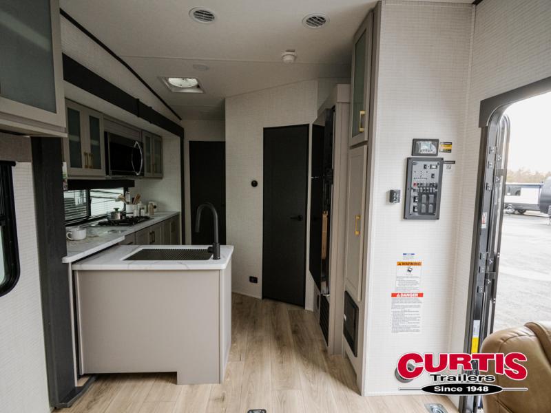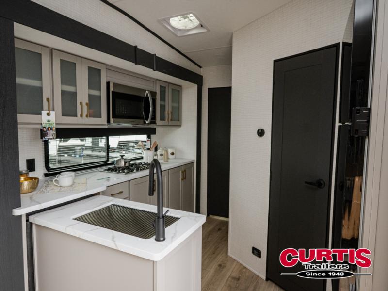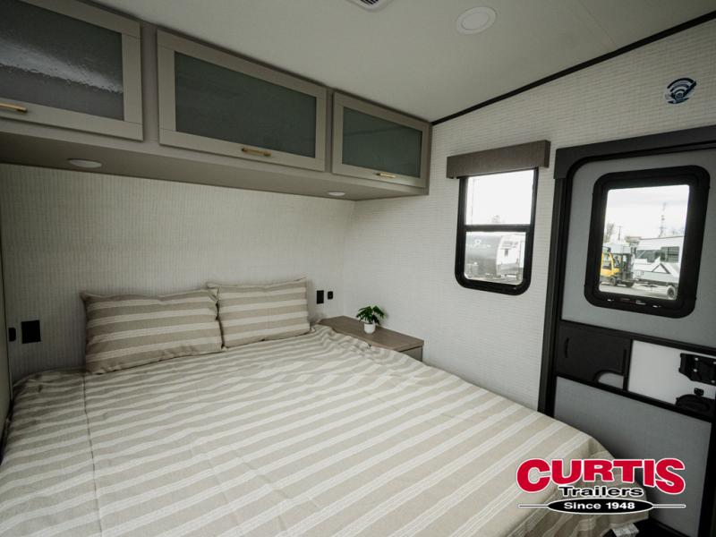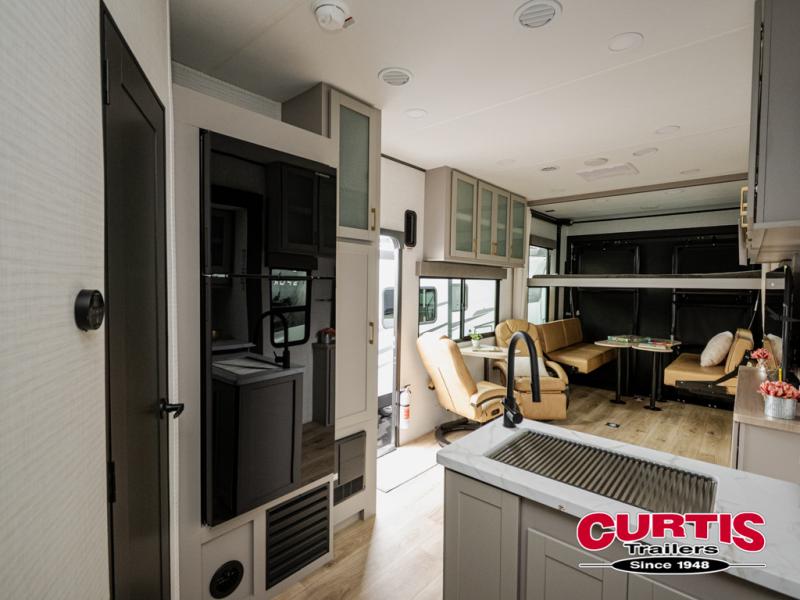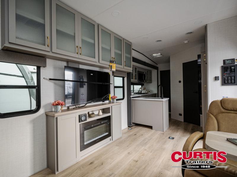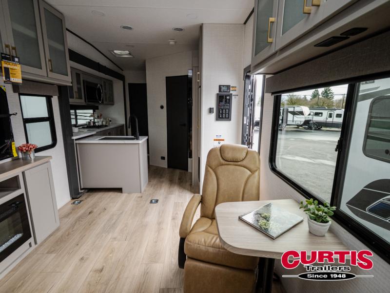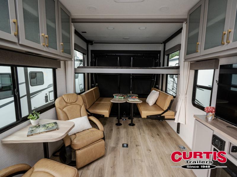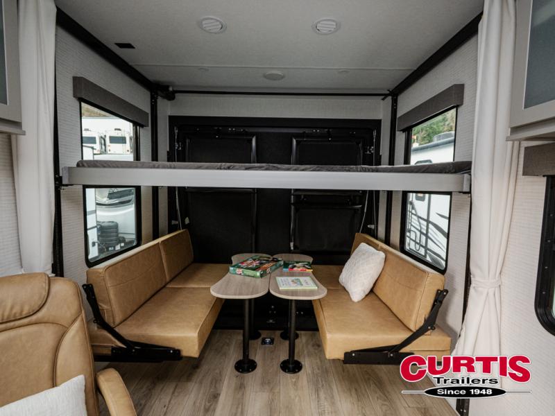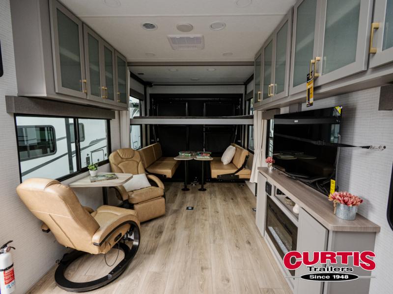 This dual entry travel trailer is sure to meet all your needs. Once you arrive at the campground, unload your toys from the 15' 7" total garage space, then grab a cold drink from the refrigerator. You can then relax on the dual lounge chairs, play a game at the electric pass-thru dinette, or let your guests rest on the electric bed. If you need a rest yourself, you'll find the king bed in the front master bedroom ultra comfortable. This model also includes an entertainment center with a fireplace and a kitchen slide out with the sink, counter space, cooktop, and pantry!