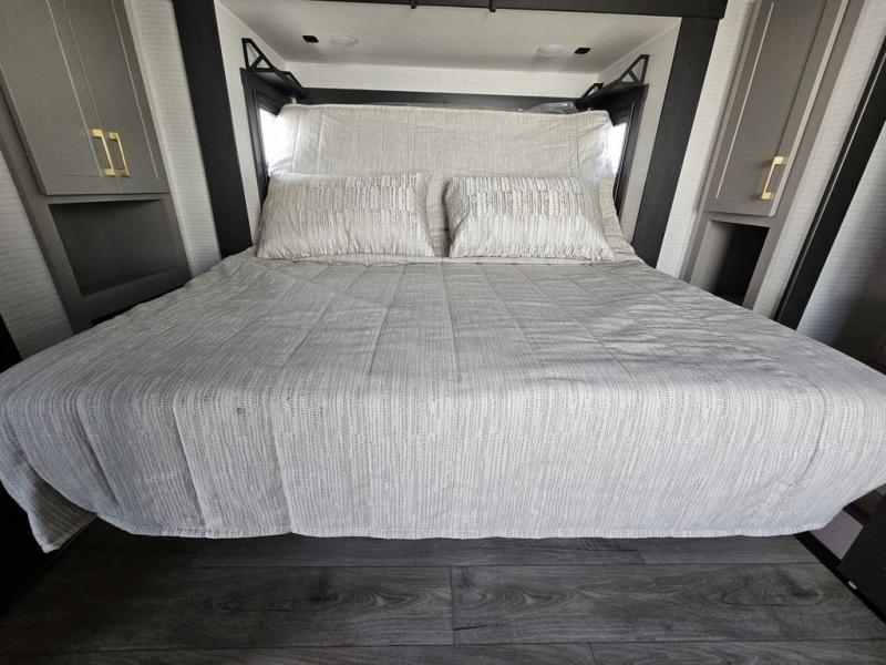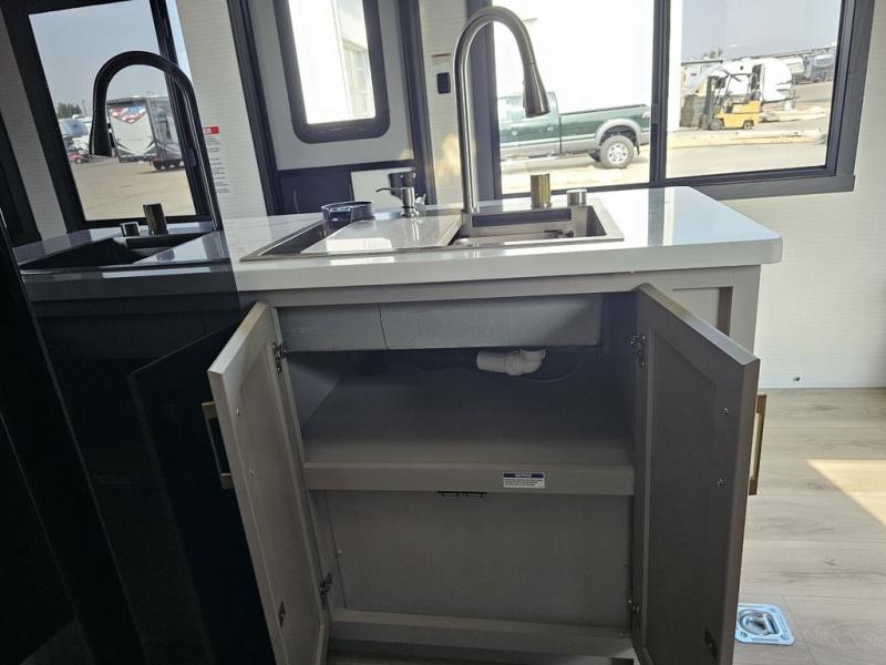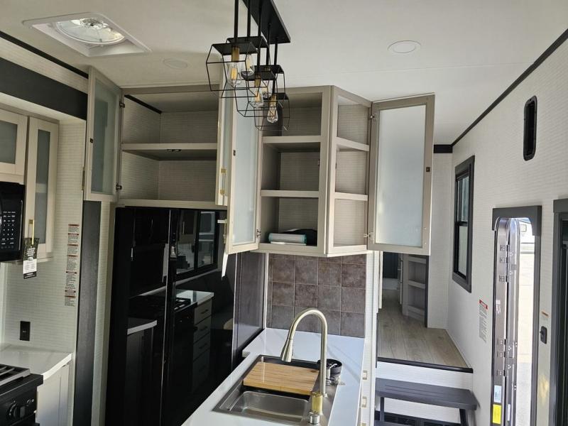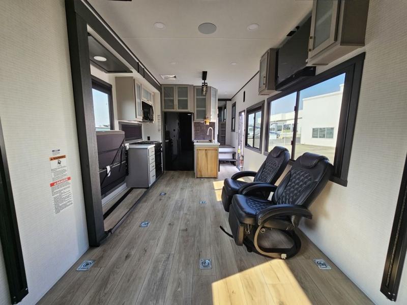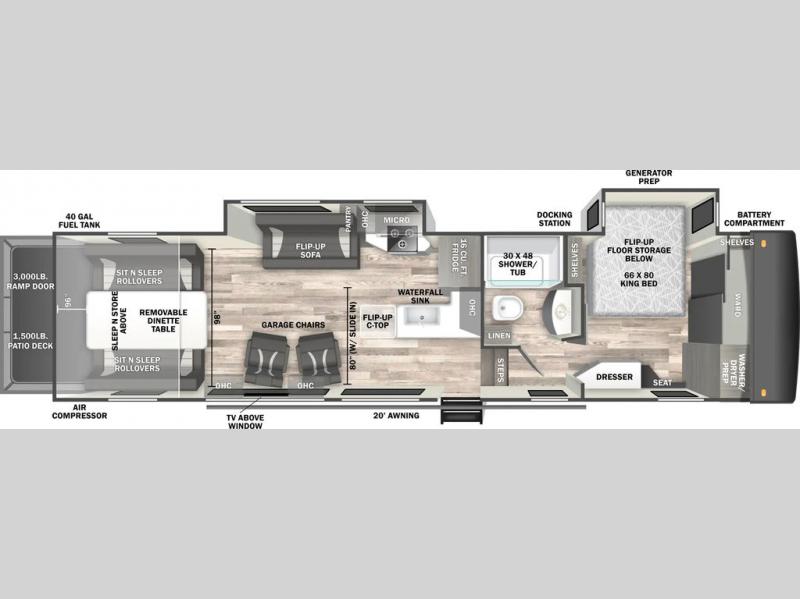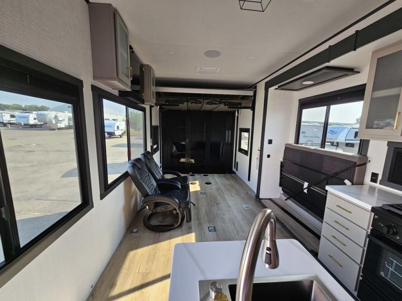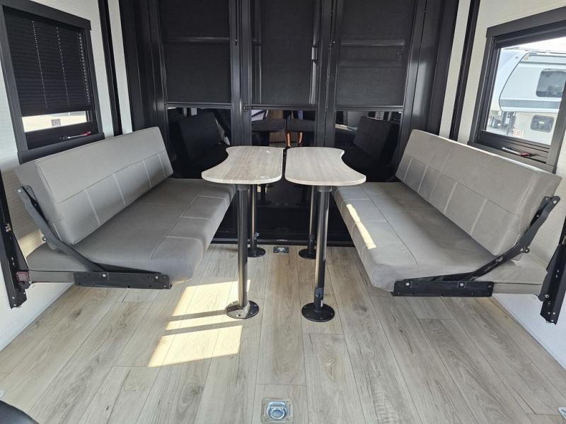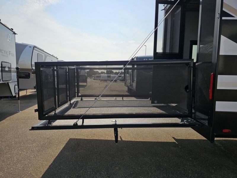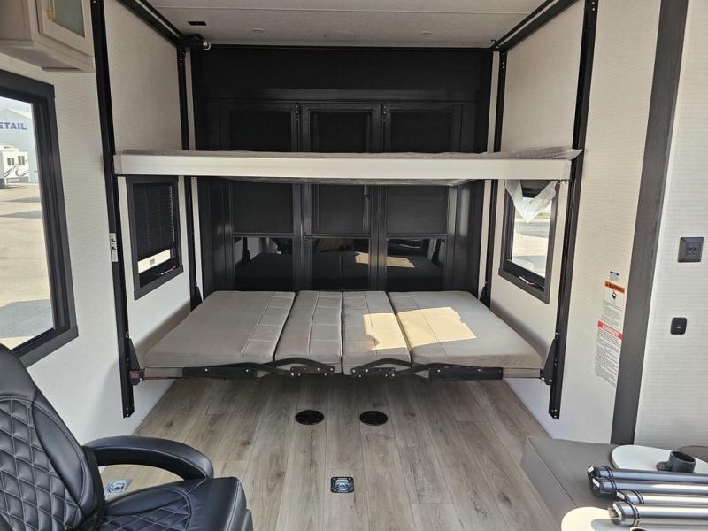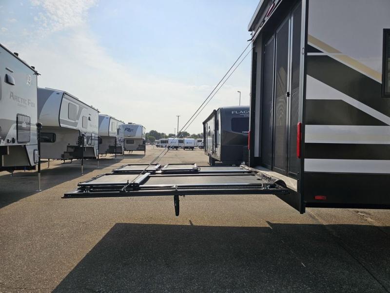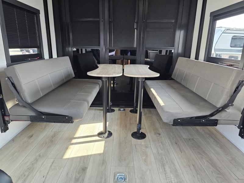This toy hauler will bring the greatest sleeping experience on your road trip thanks to its private front bedroom, featuring a king bed with flip-up floor storage below, perfect for stashing your favorite gear. The room also includes a spacious wardrobe, washer and dryer prep for added convenience, shelves, dresser, and seat, providing ample storage and comfort. The full bathroom is spacious, complete with a generous 30 x 48 shower and linen closet for all your towels and bath clothes. The kitchen is equipped with a microwave, waterfall sink, flip-up countertop for added space when cooking, a 16 cu fridge, pantry, and overhead cabinets. The living room is the perfect place to relax, featuring a flip-up sofa, two garage chairs, and an overhead cabinet. In the garage, you'll find sit-n-sleep rollovers, a removable dinette table, and a sleep-and-store above.