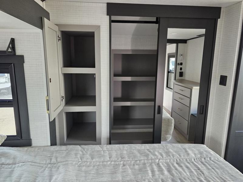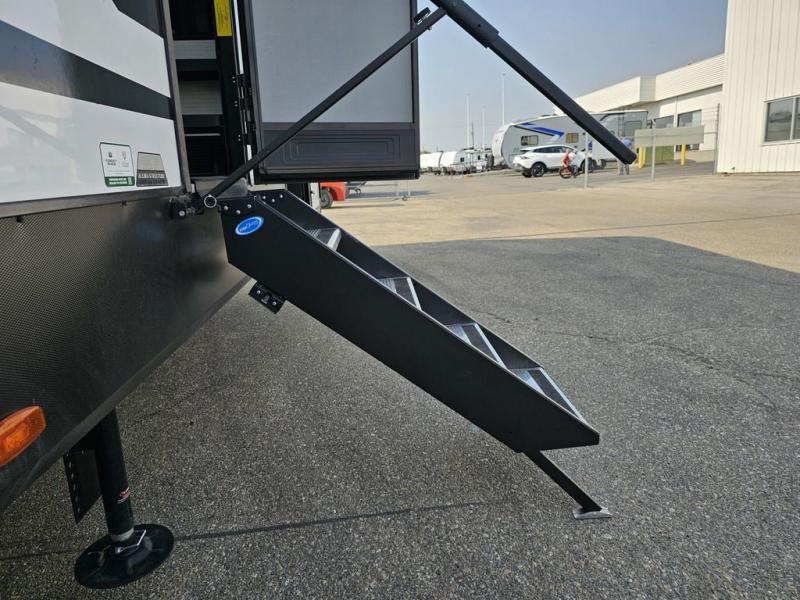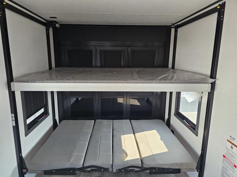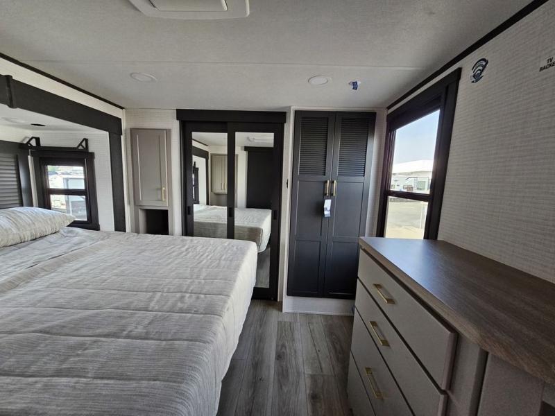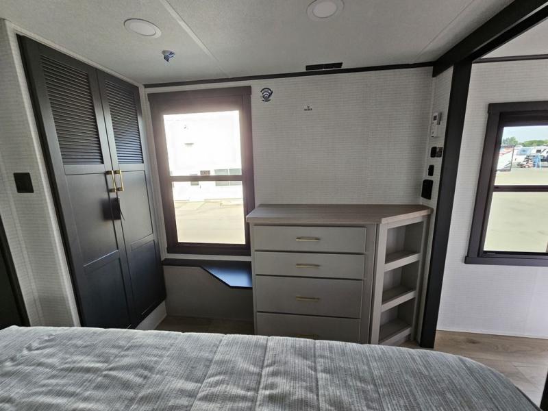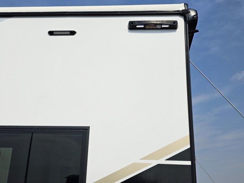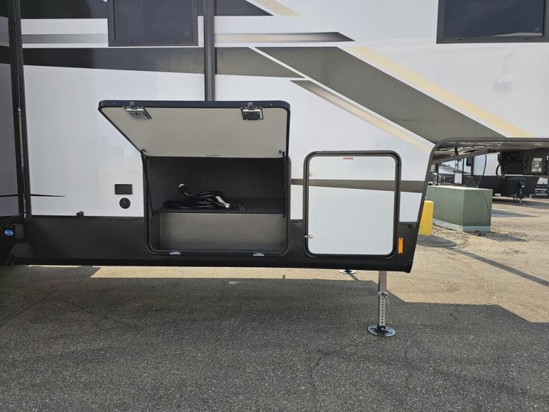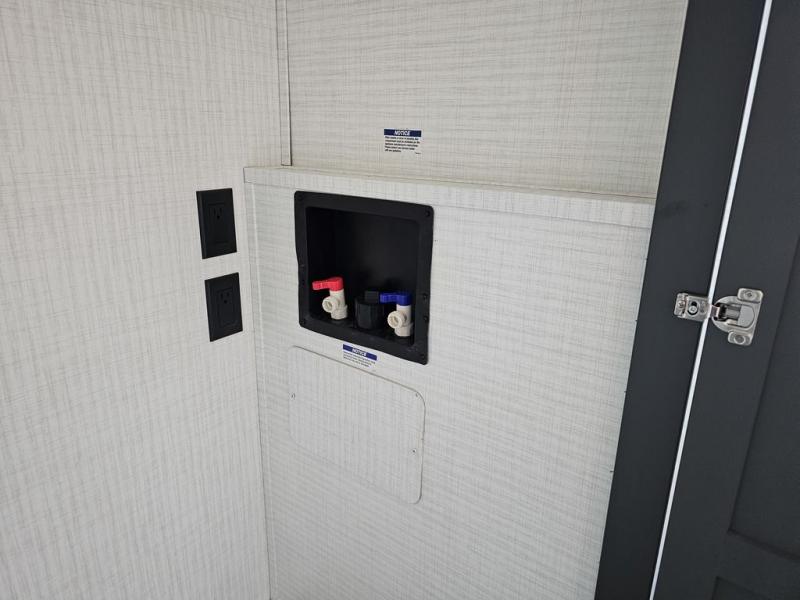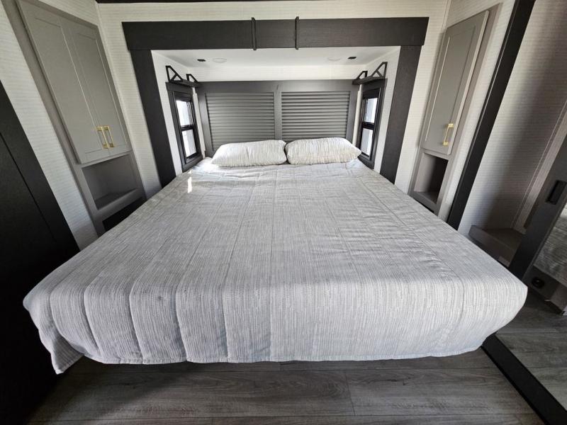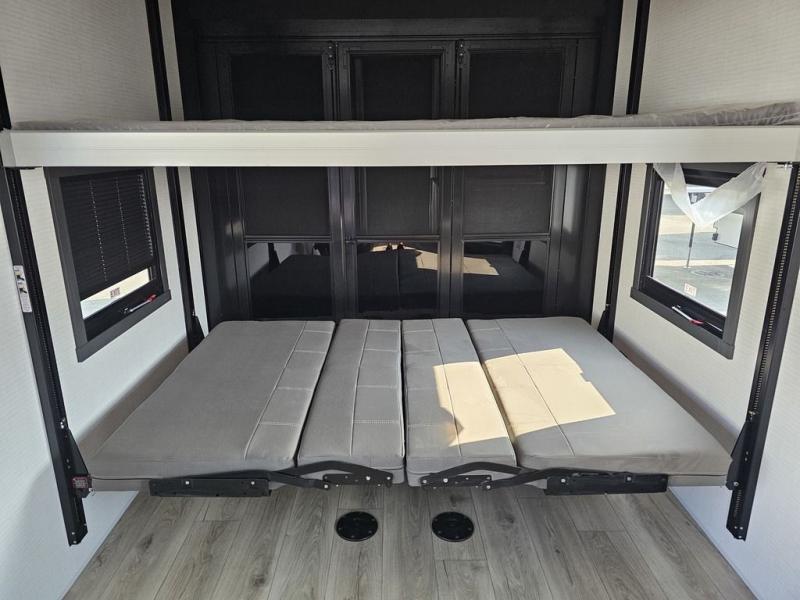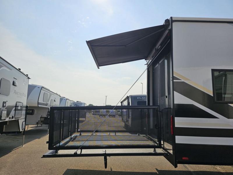 This toy hauler will bring the greatest sleeping experience on your road trip thanks to its private front bedroom, featuring a king bed with flip-up floor storage below, perfect for stashing your favorite gear. The room also includes a spacious wardrobe, washer and dryer prep for added convenience, shelves, dresser, and seat, providing ample storage and comfort. The full bathroom is spacious, complete with a generous 30 x 48 shower and linen closet for all your towels and bath clothes. The kitchen is equipped with a microwave, waterfall sink, flip-up countertop for added space when cooking, a 16 cu fridge, pantry, and overhead cabinets. The living room is the perfect place to relax, featuring a flip-up sofa, two garage chairs, and an overhead cabinet. In the garage, you'll find sit-n-sleep rollovers, a removable dinette table, and a sleep-and-store above.
