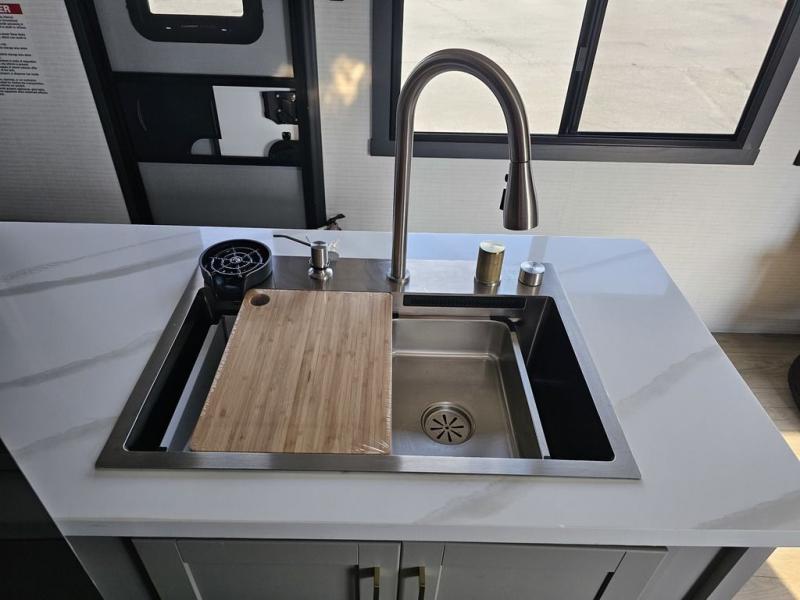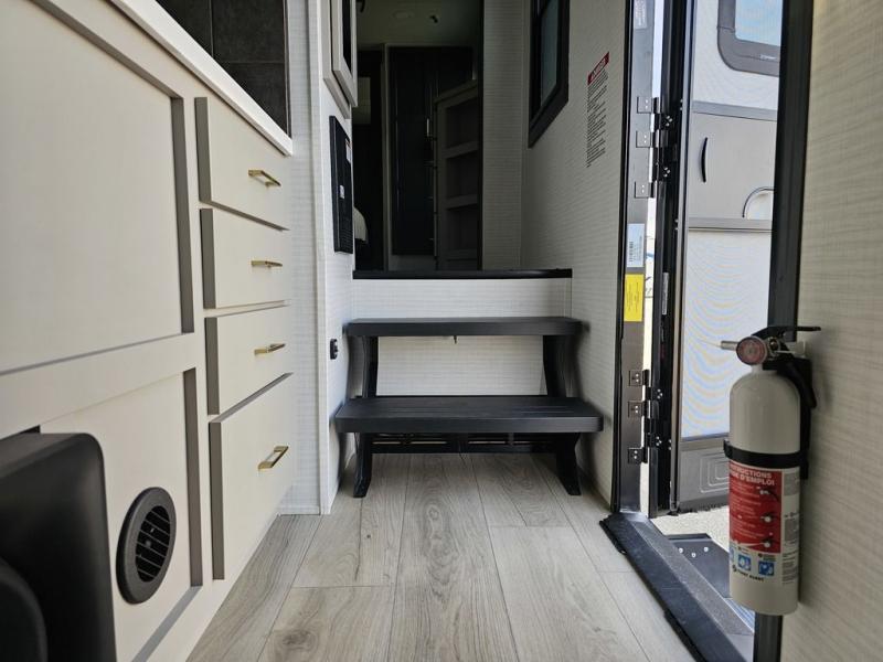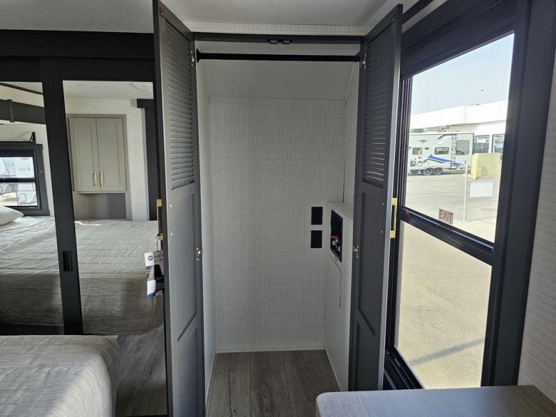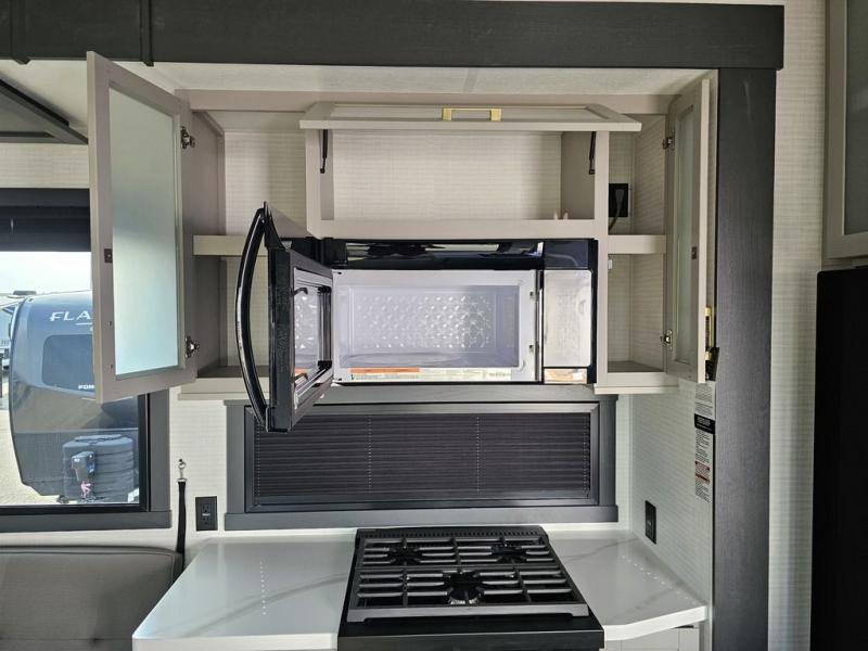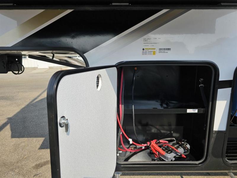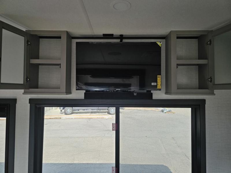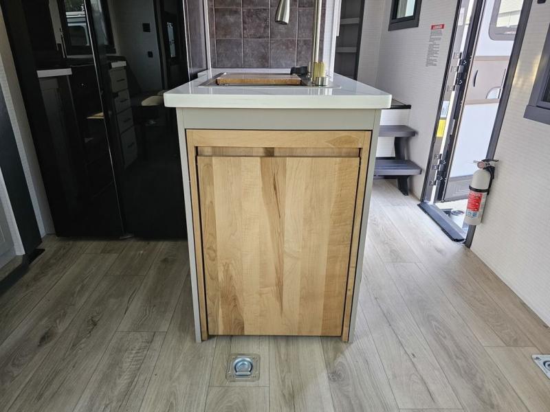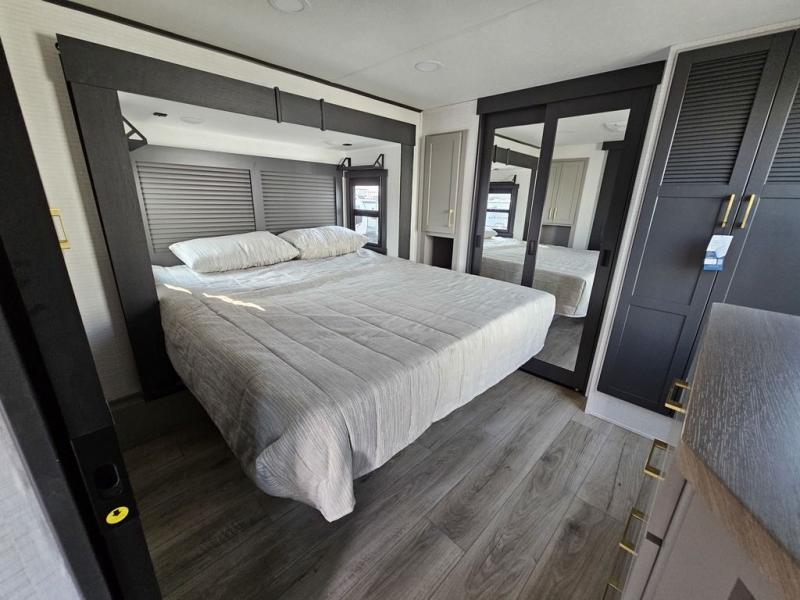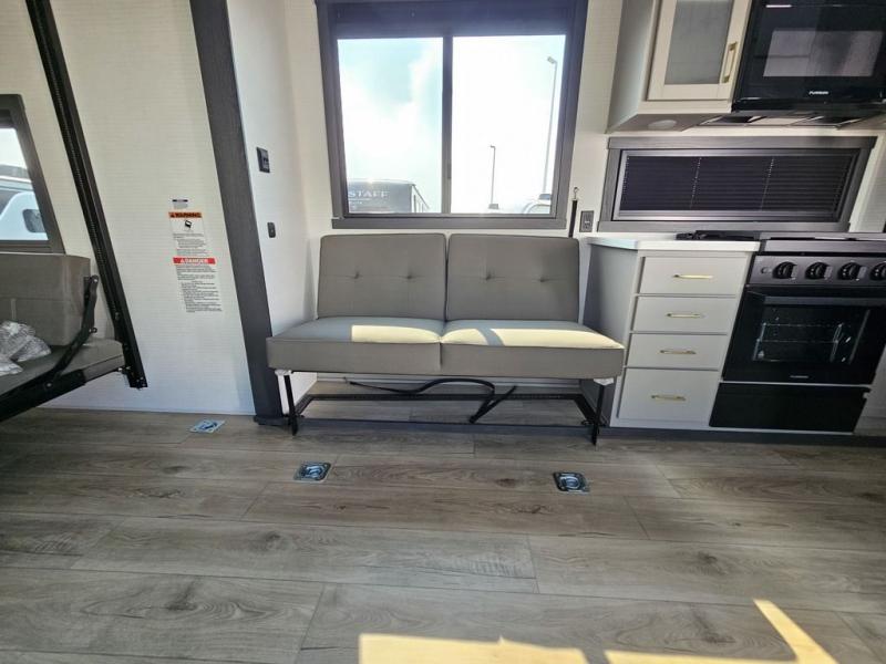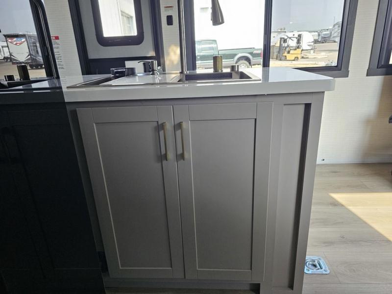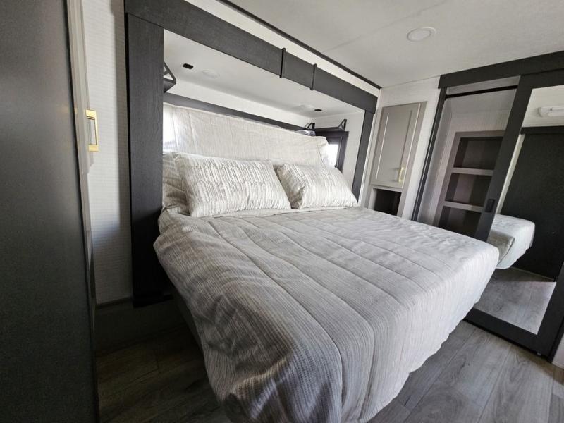 This toy hauler will bring the greatest sleeping experience on your road trip thanks to its private front bedroom, featuring a king bed with flip-up floor storage below, perfect for stashing your favorite gear. The room also includes a spacious wardrobe, washer and dryer prep for added convenience, shelves, dresser, and seat, providing ample storage and comfort. The full bathroom is spacious, complete with a generous 30 x 48 shower and linen closet for all your towels and bath clothes. The kitchen is equipped with a microwave, waterfall sink, flip-up countertop for added space when cooking, a 16 cu fridge, pantry, and overhead cabinets. The living room is the perfect place to relax, featuring a flip-up sofa, two garage chairs, and an overhead cabinet. In the garage, you'll find sit-n-sleep rollovers, a removable dinette table, and a sleep-and-store above.