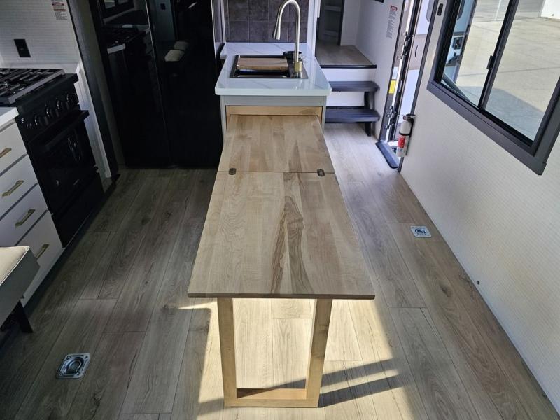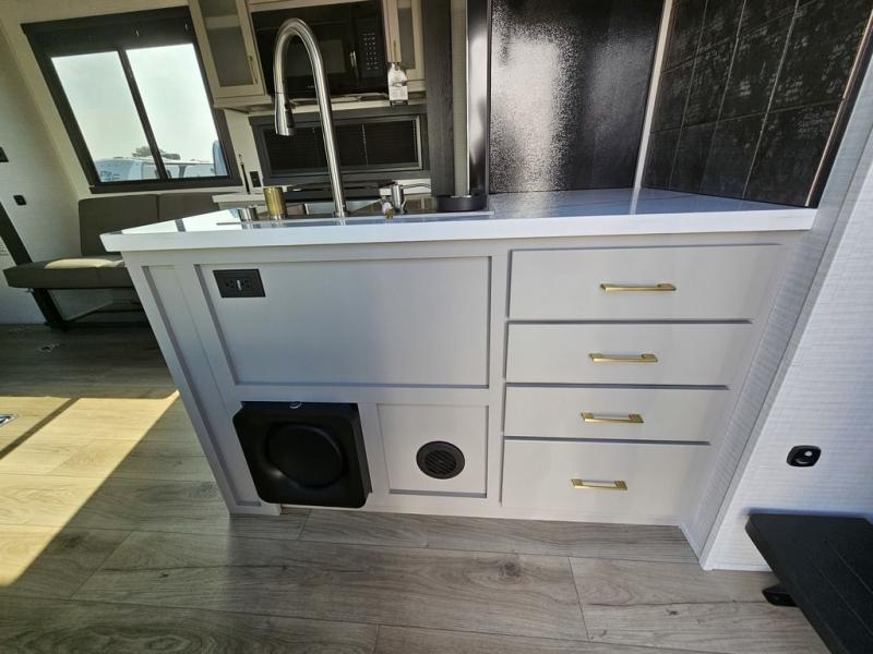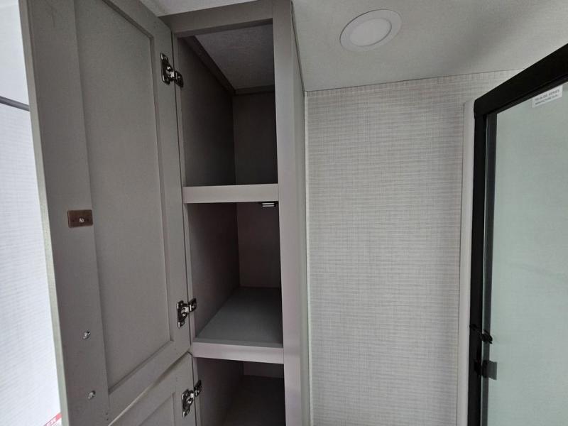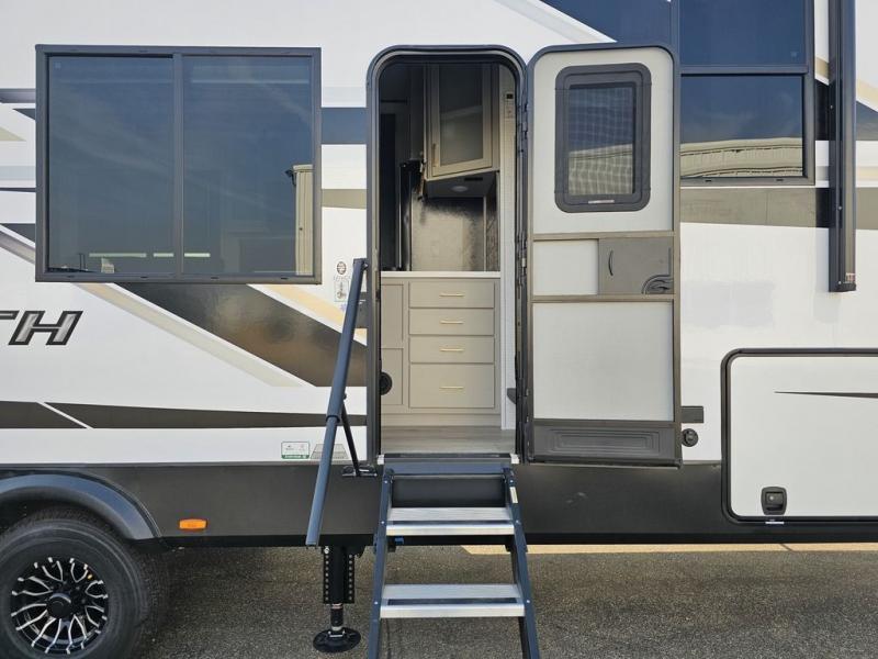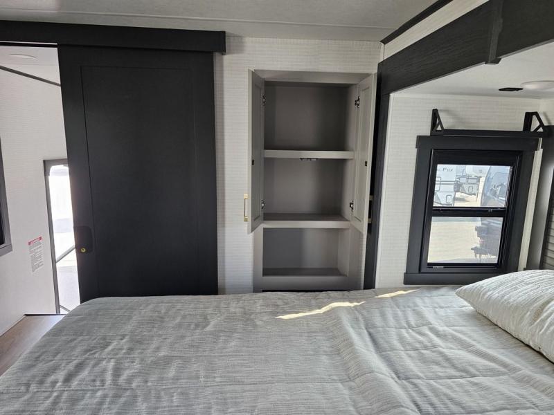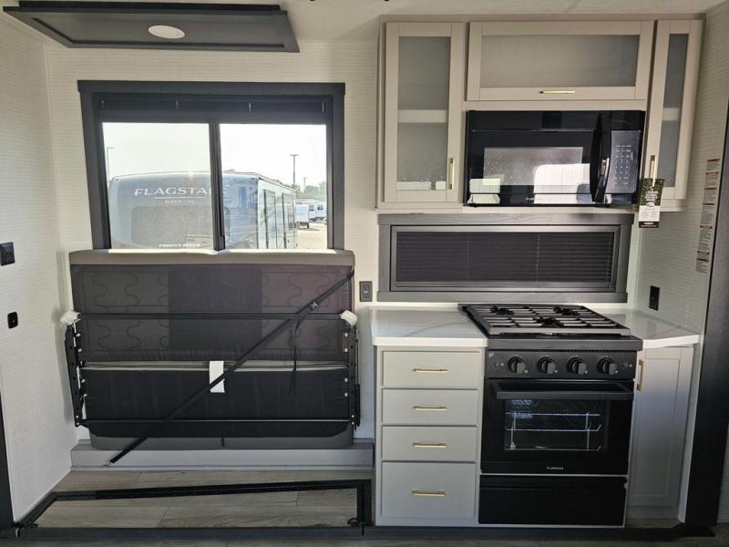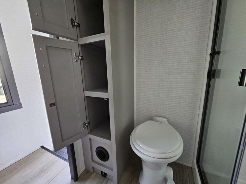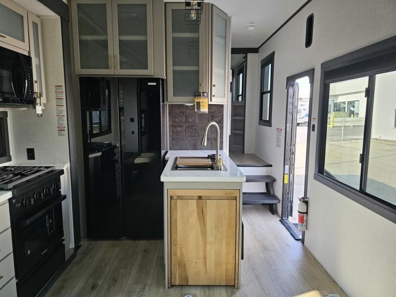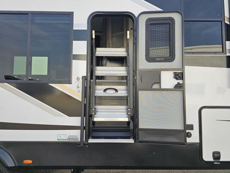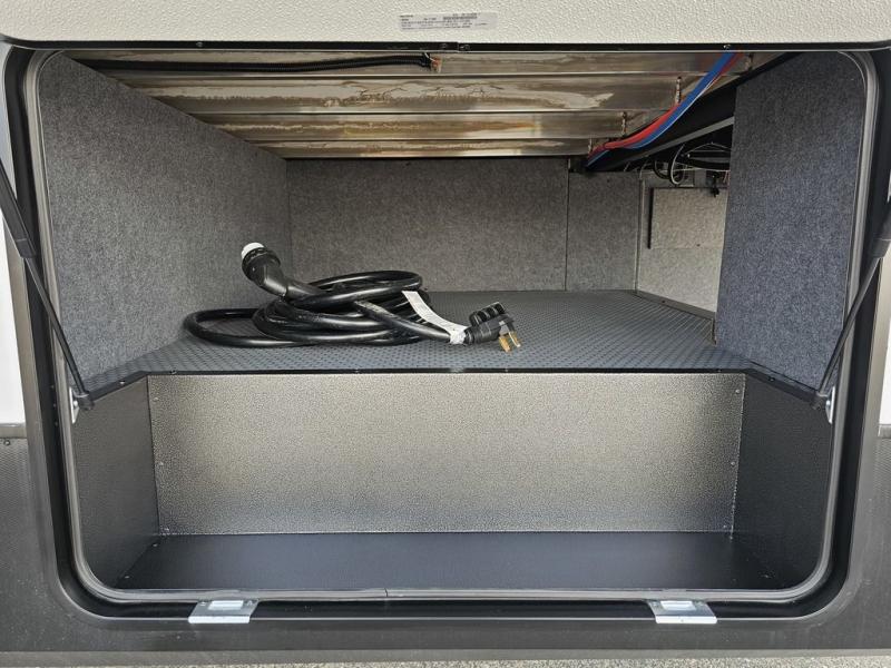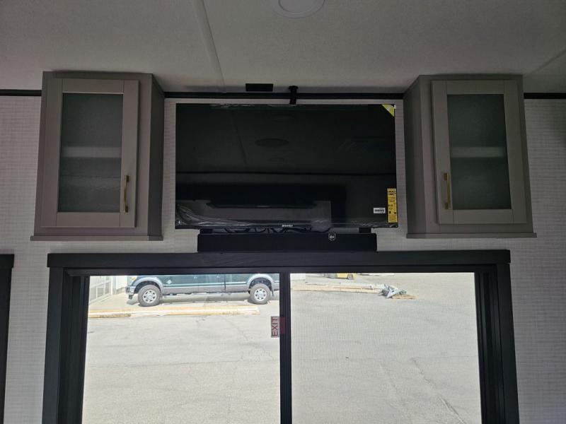 This toy hauler will bring the greatest sleeping experience on your road trip thanks to its private front bedroom, featuring a king bed with flip-up floor storage below, perfect for stashing your favorite gear. The room also includes a spacious wardrobe, washer and dryer prep for added convenience, shelves, dresser, and seat, providing ample storage and comfort. The full bathroom is spacious, complete with a generous 30 x 48 shower and linen closet for all your towels and bath clothes. The kitchen is equipped with a microwave, waterfall sink, flip-up countertop for added space when cooking, a 16 cu fridge, pantry, and overhead cabinets. The living room is the perfect place to relax, featuring a flip-up sofa, two garage chairs, and an overhead cabinet. In the garage, you'll find sit-n-sleep rollovers, a removable dinette table, and a sleep-and-store above.