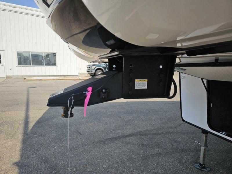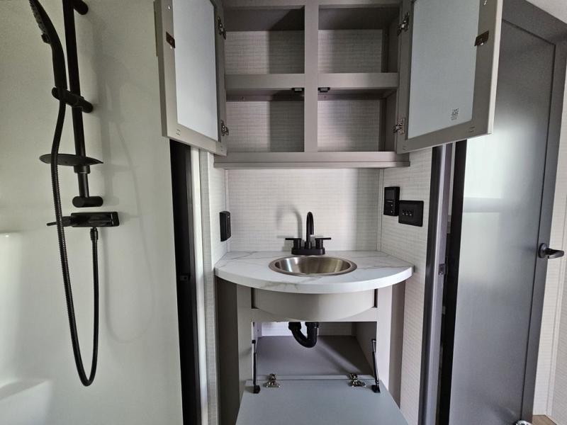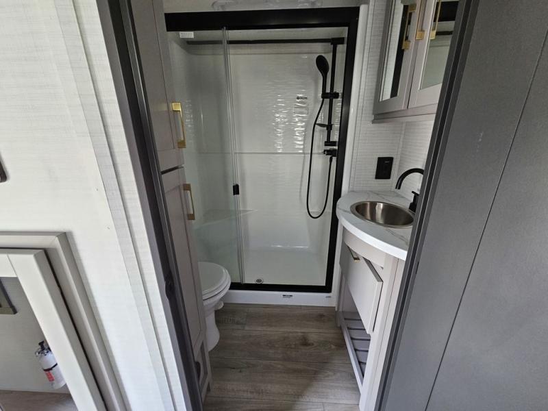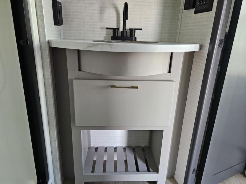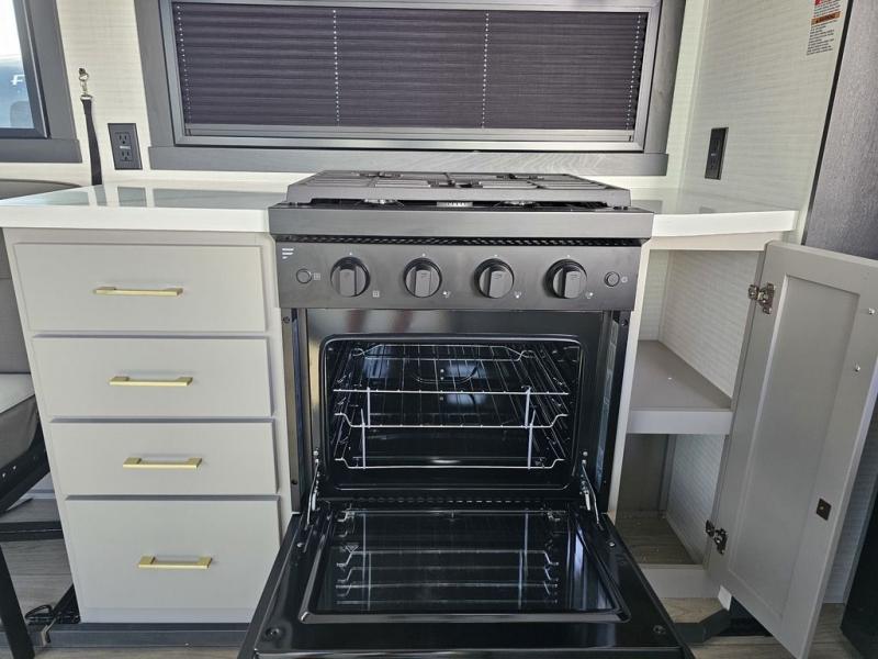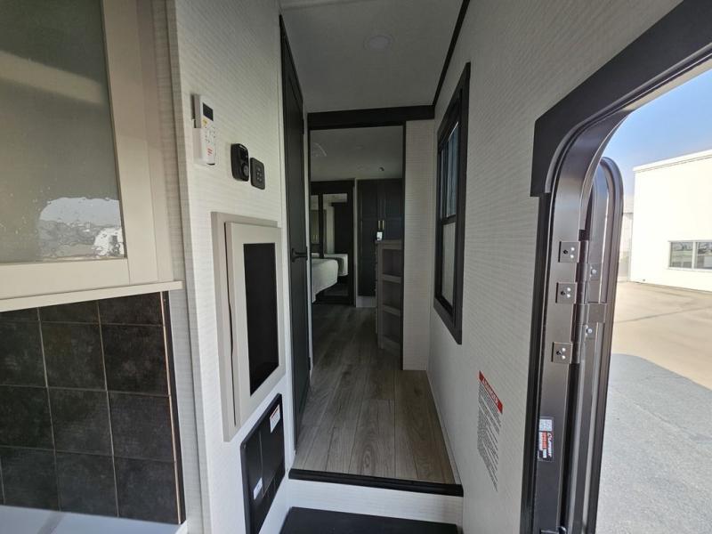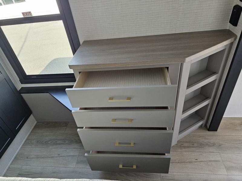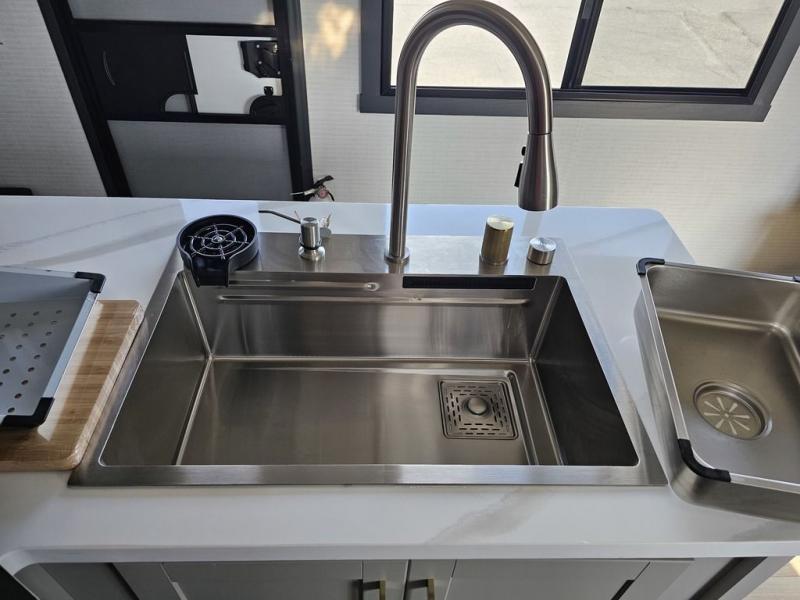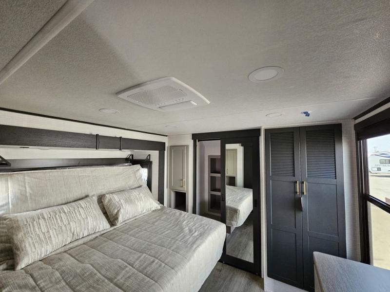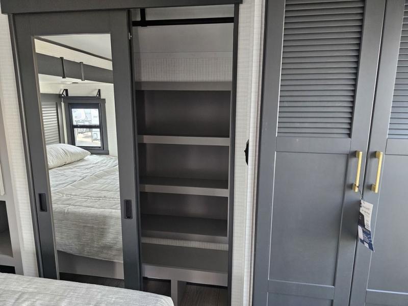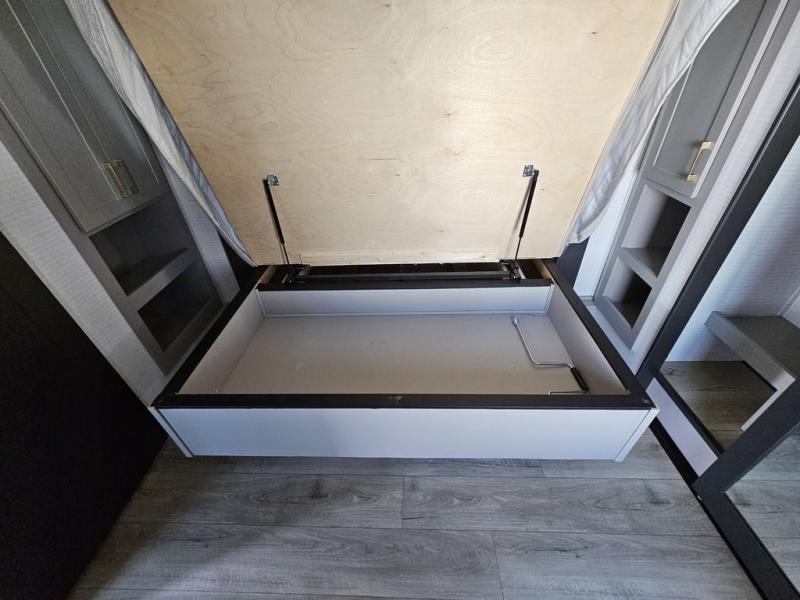 This toy hauler will bring the greatest sleeping experience on your road trip thanks to its private front bedroom, featuring a king bed with flip-up floor storage below, perfect for stashing your favorite gear. The room also includes a spacious wardrobe, washer and dryer prep for added convenience, shelves, dresser, and seat, providing ample storage and comfort. The full bathroom is spacious, complete with a generous 30 x 48 shower and linen closet for all your towels and bath clothes. The kitchen is equipped with a microwave, waterfall sink, flip-up countertop for added space when cooking, a 16 cu fridge, pantry, and overhead cabinets. The living room is the perfect place to relax, featuring a flip-up sofa, two garage chairs, and an overhead cabinet. In the garage, you'll find sit-n-sleep rollovers, a removable dinette table, and a sleep-and-store above.
