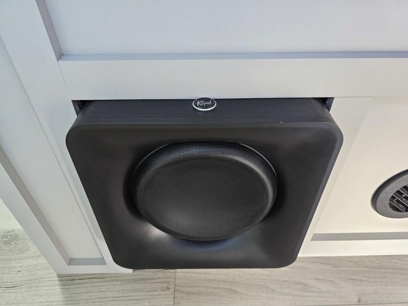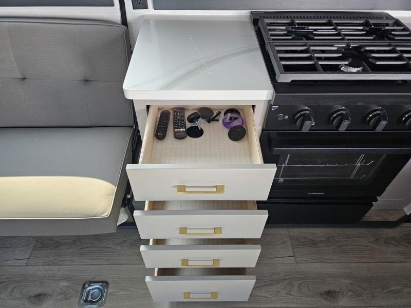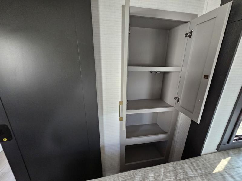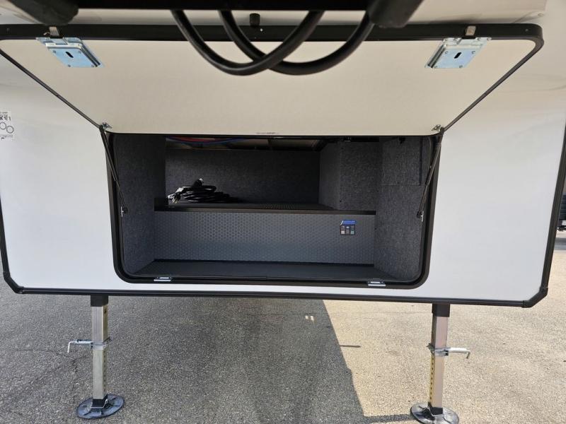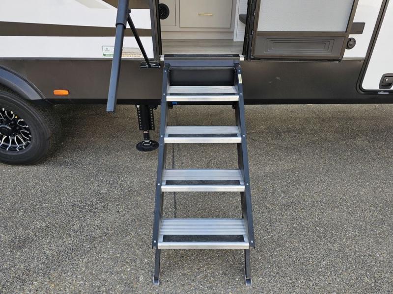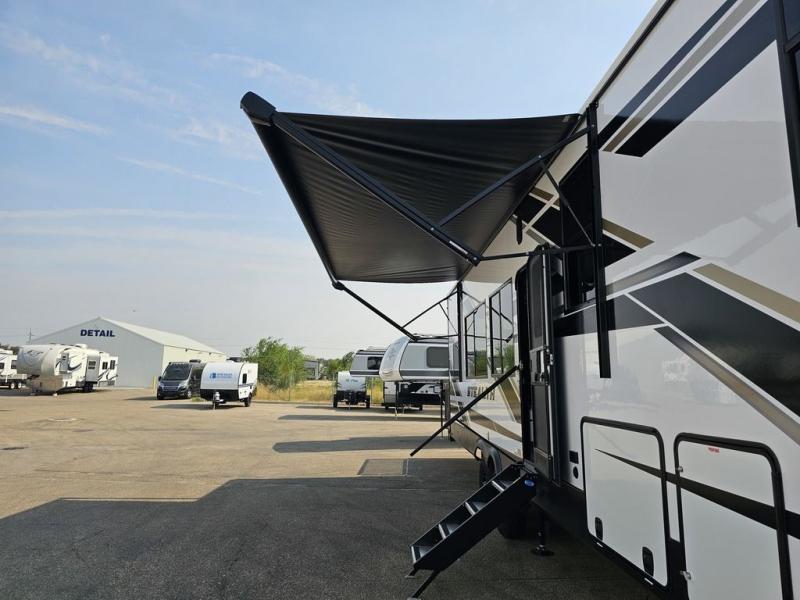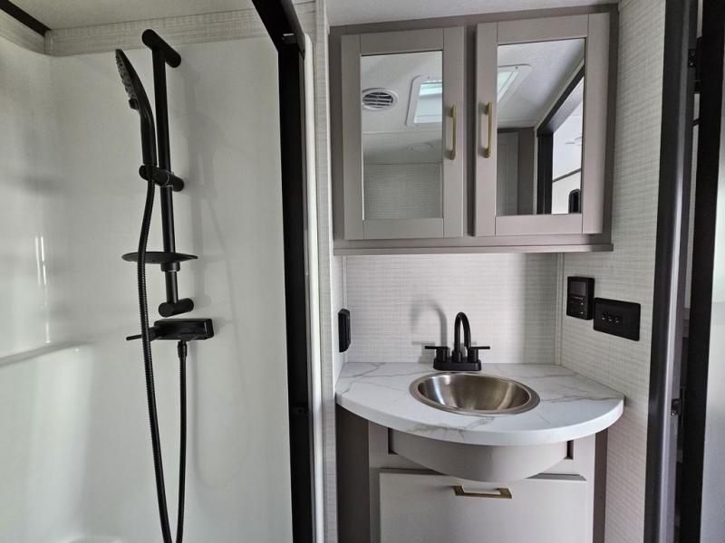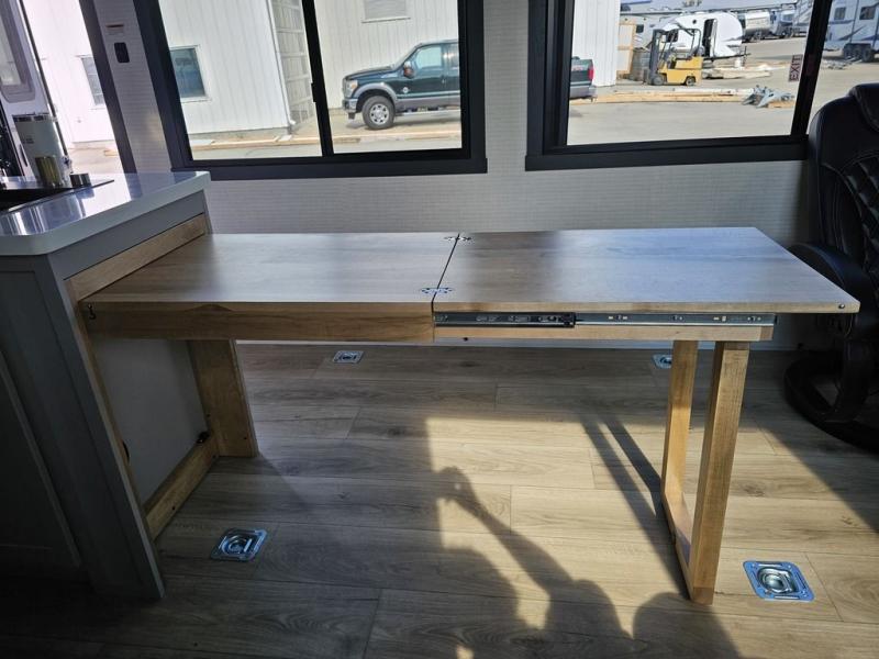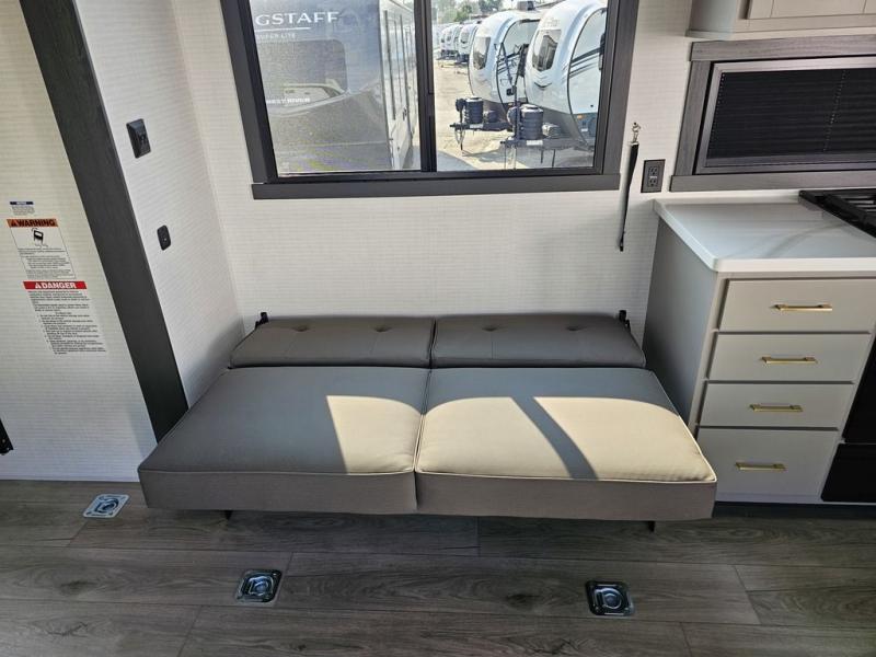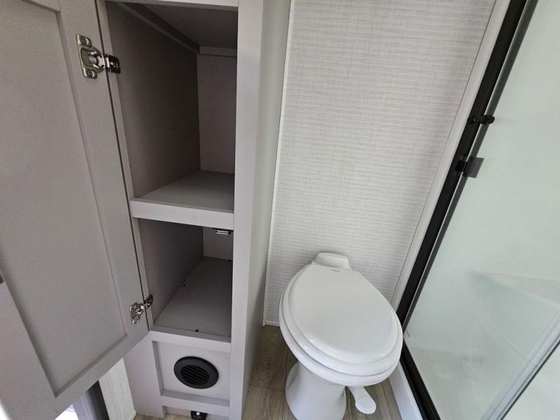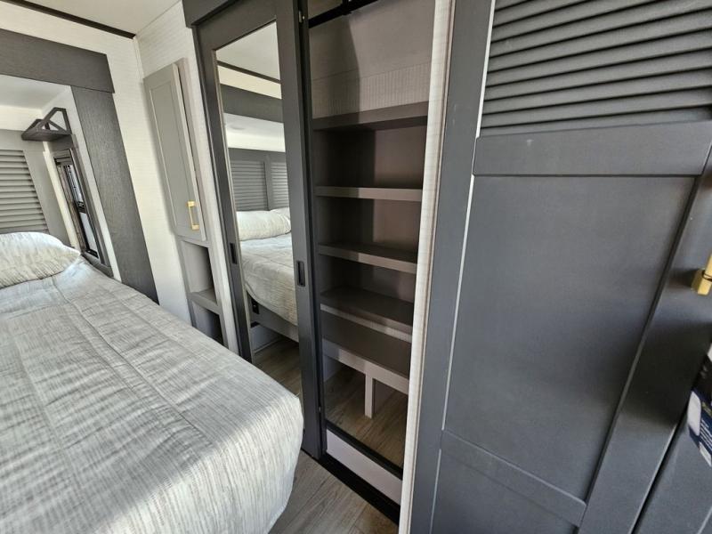 This toy hauler will bring the greatest sleeping experience on your road trip thanks to its private front bedroom, featuring a king bed with flip-up floor storage below, perfect for stashing your favorite gear. The room also includes a spacious wardrobe, washer and dryer prep for added convenience, shelves, dresser, and seat, providing ample storage and comfort. The full bathroom is spacious, complete with a generous 30 x 48 shower and linen closet for all your towels and bath clothes. The kitchen is equipped with a microwave, waterfall sink, flip-up countertop for added space when cooking, a 16 cu fridge, pantry, and overhead cabinets. The living room is the perfect place to relax, featuring a flip-up sofa, two garage chairs, and an overhead cabinet. In the garage, you'll find sit-n-sleep rollovers, a removable dinette table, and a sleep-and-store above.