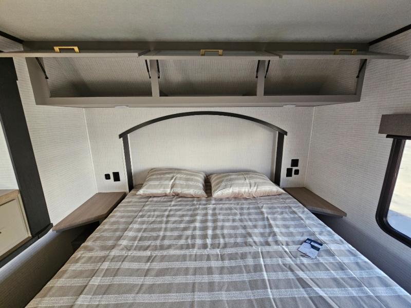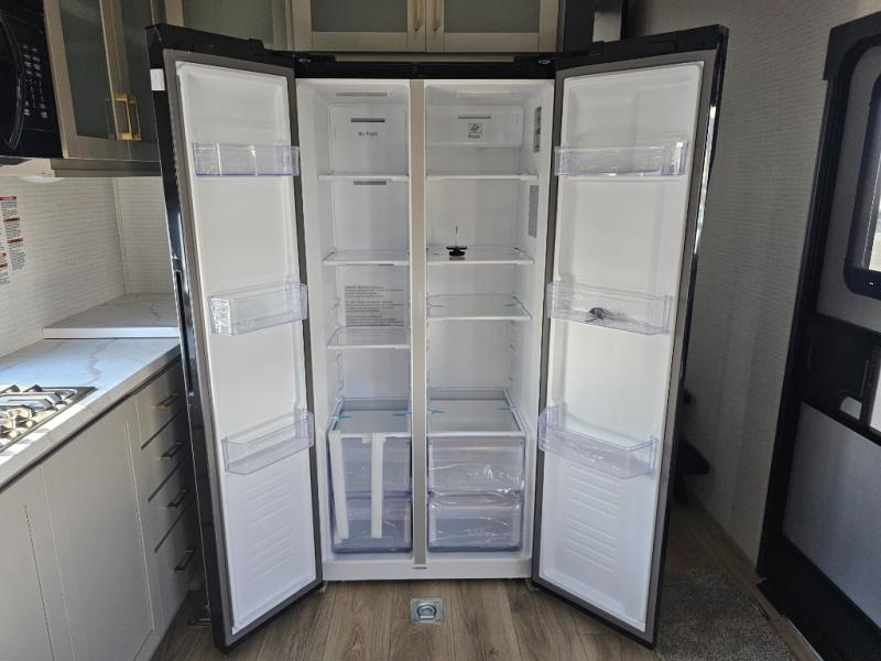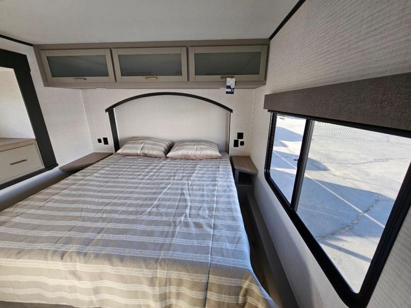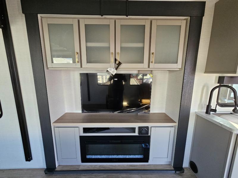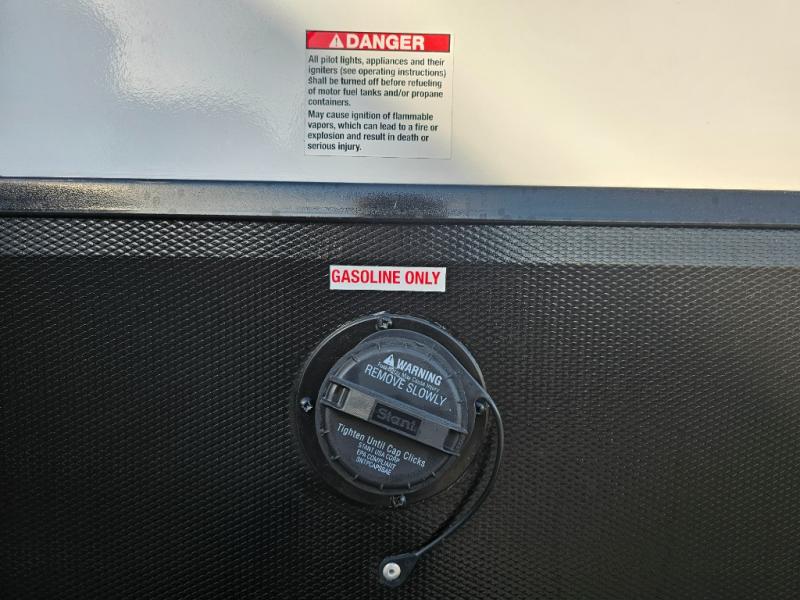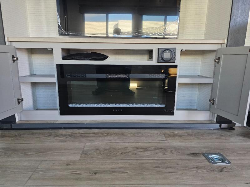 Whether you're heading to the woods or lake, you'll enjoy every minute in this spacious toy hauler. There is 19' 7" total garage space for your toys plus a ramp door to easily unload them. Once the dirt bikes are out, you can dine at the electric pass-thru dinette or relax on the dual lounge chairs across from the fireplace. The kitchen includes a refrigerator, a convection microwave, and plenty of counter space to prep meals. You'll find the front private bedroom to be inviting with its king bed, dresser slide out, plus dual wardrobes and a closet for storage galore! And the full bath is close by for easy nighttime use!