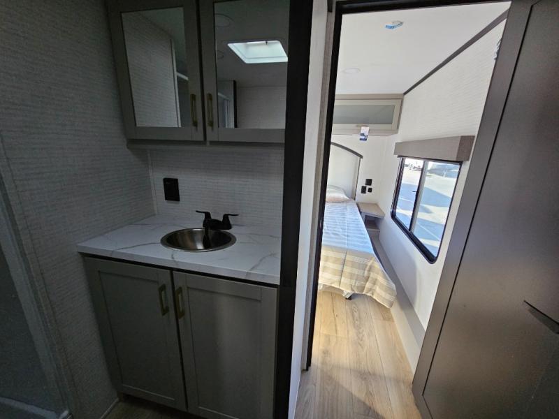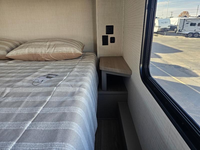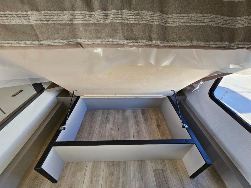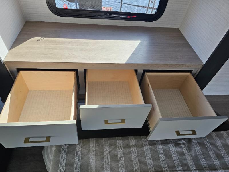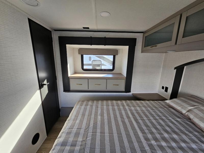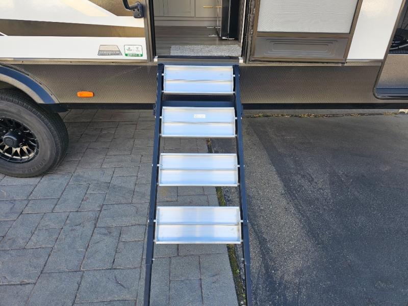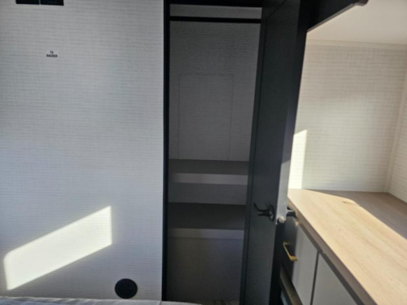 Whether you're heading to the woods or lake, you'll enjoy every minute in this spacious toy hauler. There is 19' 7" total garage space for your toys plus a ramp door to easily unload them. Once the dirt bikes are out, you can dine at the electric pass-thru dinette or relax on the dual lounge chairs across from the fireplace. The kitchen includes a refrigerator, a convection microwave, and plenty of counter space to prep meals. You'll find the front private bedroom to be inviting with its king bed, dresser slide out, plus dual wardrobes and a closet for storage galore! And the full bath is close by for easy nighttime use!