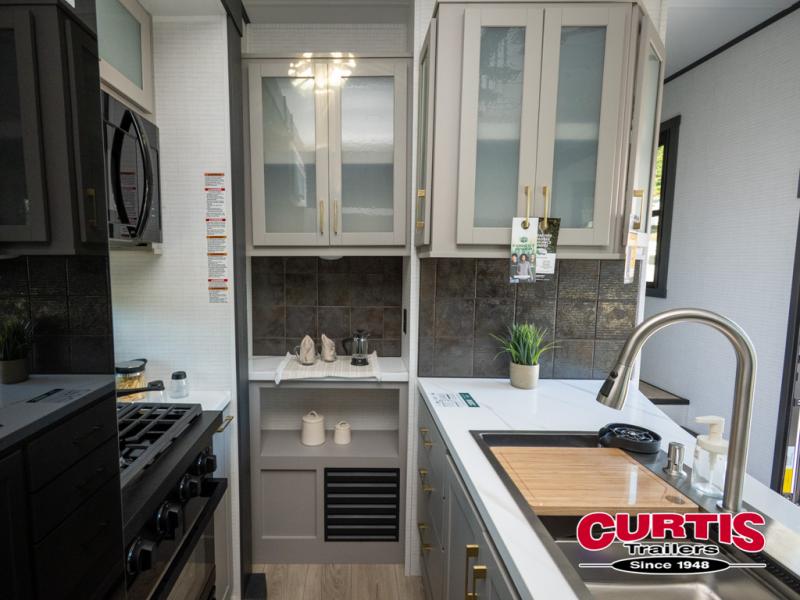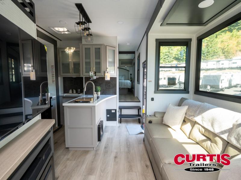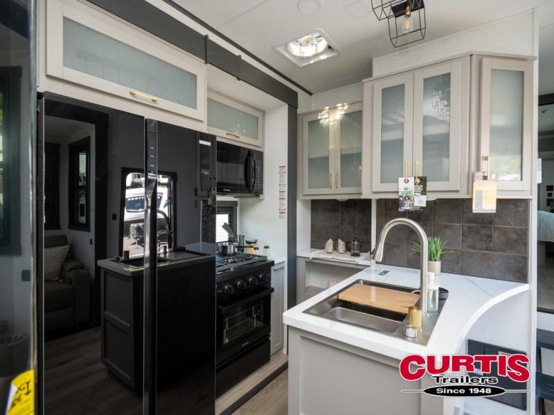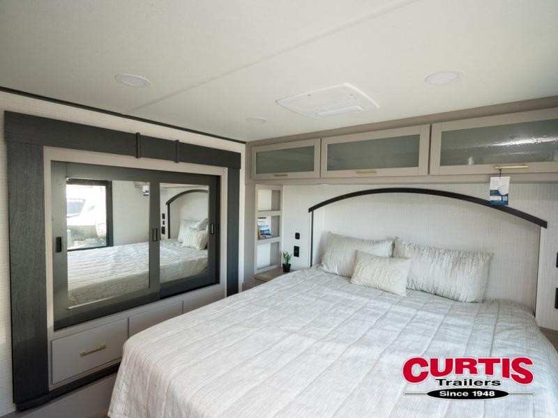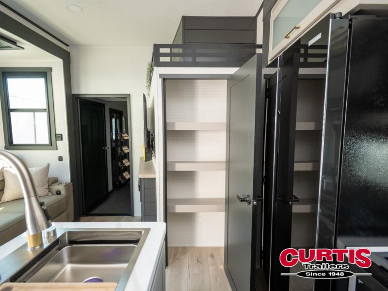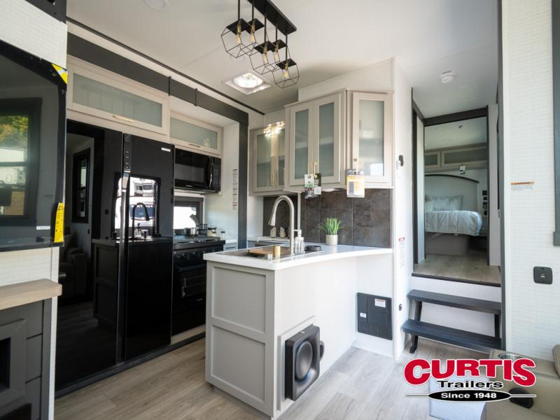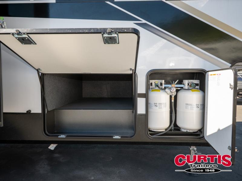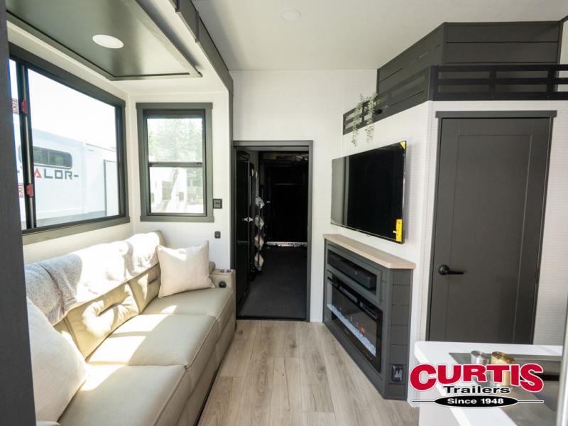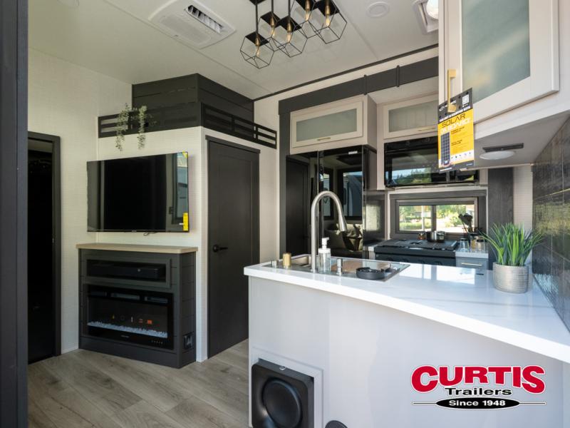 The front bedroom is serene, featuring a king bed, dual wardrobe, and additional wardrobe space for all your favorite belongings. The full bathroom is fitted with everything you need to freshen up and feel at home, and with a convenient half bathroom located in the kitchen/living room area, you'll have everything you need to stay comfortable and convenient. Speaking of the kitchen/living room area, this space is the heart of the home, equipped with a microwave, refrigerator, waterfall sink, pantry, sofa, entertainment center, fireplace, and more. The 15’ garage boasts a loft, overhead cabinets, removable table, dual gaucho seat, and sleep and store space. And with dual entry/exit doors, you'll have easy access to the garage and the rest of the RV. Plus, with a 14’ awning, you'll have plenty of shade and protection from the elements.