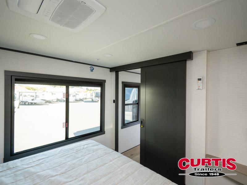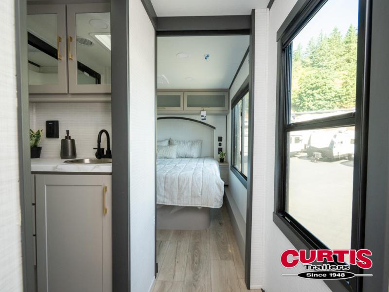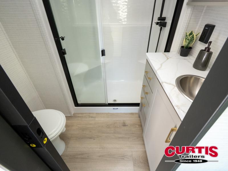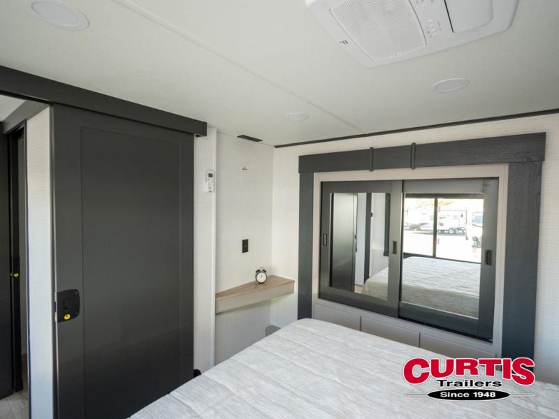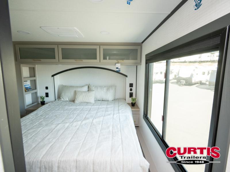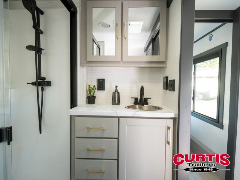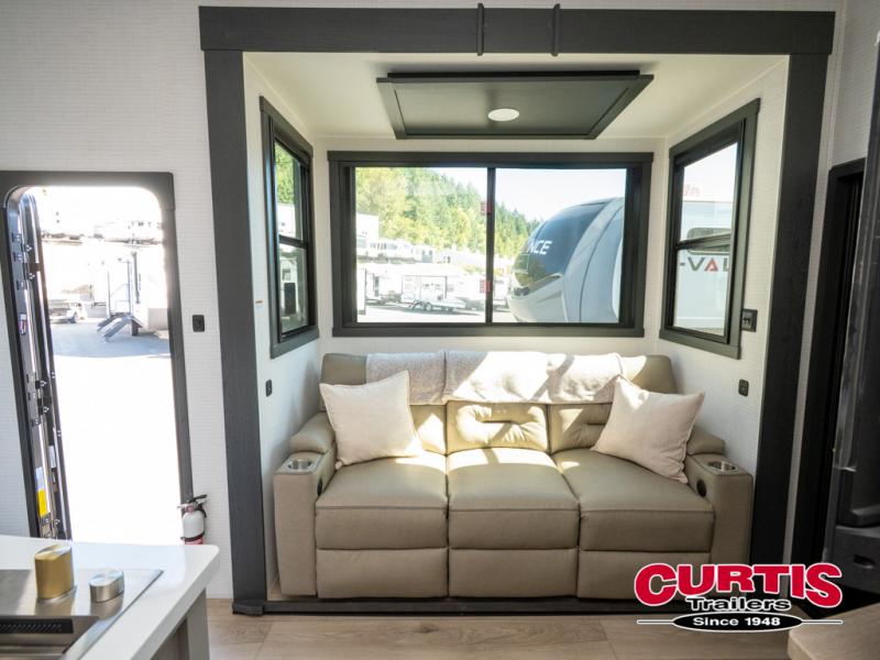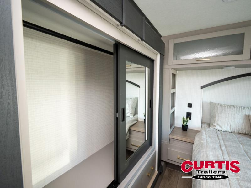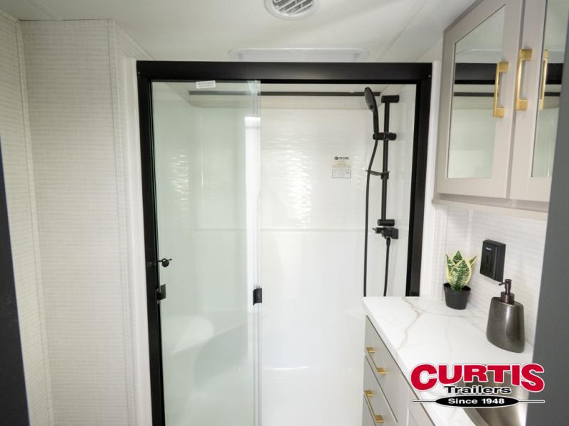 The front bedroom is serene, featuring a king bed, dual wardrobe, and additional wardrobe space for all your favorite belongings. The full bathroom is fitted with everything you need to freshen up and feel at home, and with a convenient half bathroom located in the kitchen/living room area, you'll have everything you need to stay comfortable and convenient. Speaking of the kitchen/living room area, this space is the heart of the home, equipped with a microwave, refrigerator, waterfall sink, pantry, sofa, entertainment center, fireplace, and more. The 15’ garage boasts a loft, overhead cabinets, removable table, dual gaucho seat, and sleep and store space. And with dual entry/exit doors, you'll have easy access to the garage and the rest of the RV. Plus, with a 14’ awning, you'll have plenty of shade and protection from the elements.