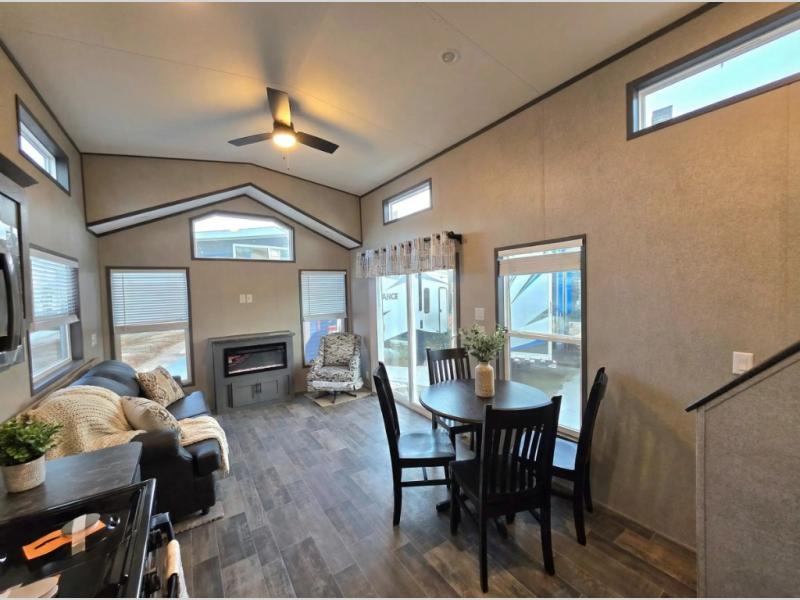 You will enjoy vacationing in this park model! With an L-shaped kitchen to make whipping up your delicious meals even easier, and the table with four chairs is conveniently located across from it too. After you have finished dining, you can relax on the front sofa or in the swivel chair with a ceiling fan above it all to keep you cool. You might like to venture to the rear private bedroom and take a quick nap on the queen-sized bed. And the loft in this unit will provide extra sleeping or storage space!