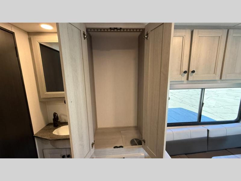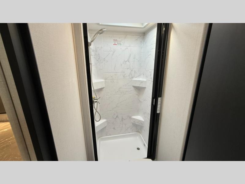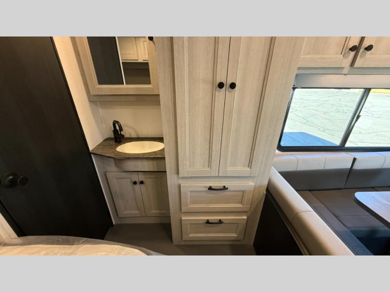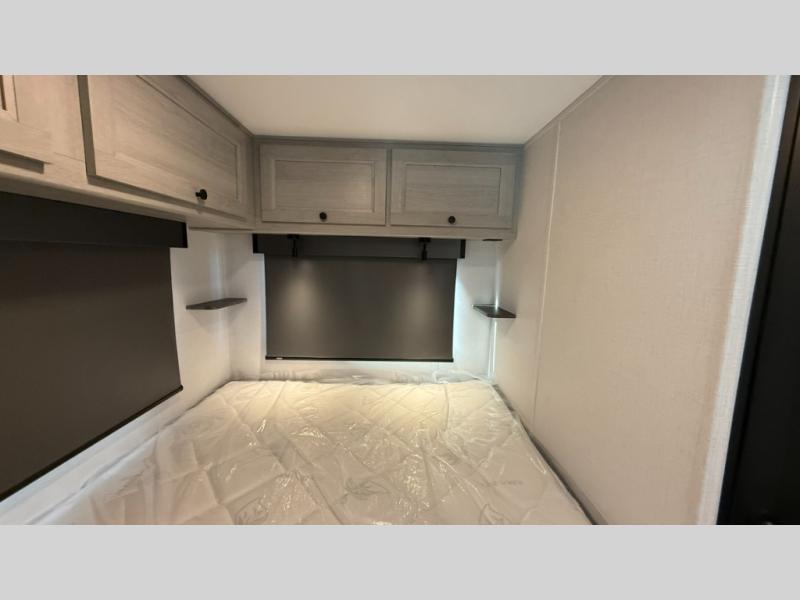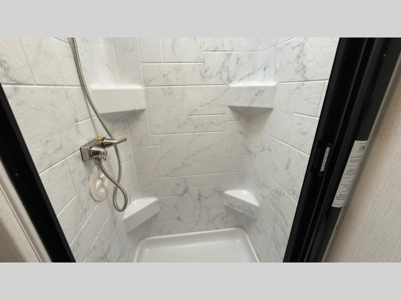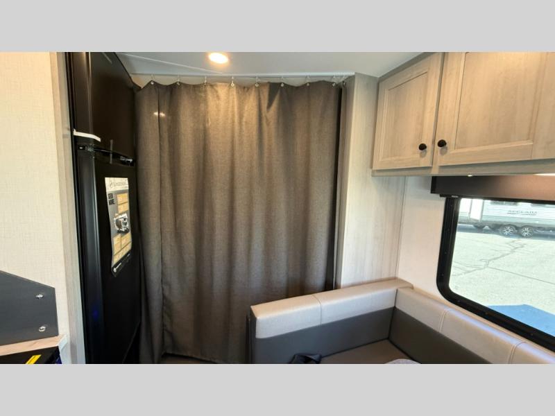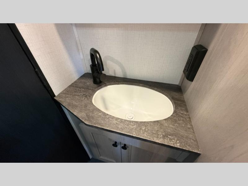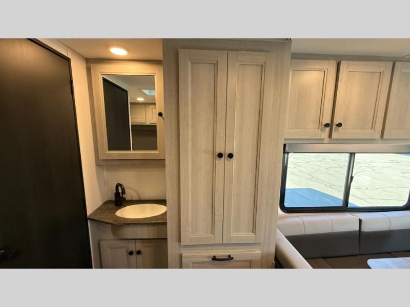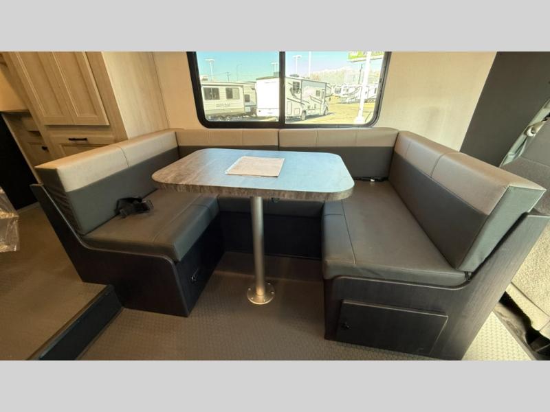 Travel in style with your own accommodations in this coach. You'll find a queen-size cab-over bunk that can be utilized as extra sleeping space or even storage, plus the rear corner offers a queen bed. And don't forget about the U-dinette as extra sleeping space after dining, playing games and relaxing. The kitchen offers a 10-cu. ft. 12V refrigerator, a convection/microwave/air fryer, and a flip-up countertop for more prep space. The private toilet and shower gives you a place to get cleaned up, and the bathroom sink is just outside the door allowing someone else the ability to get ready at the same time.