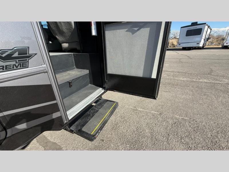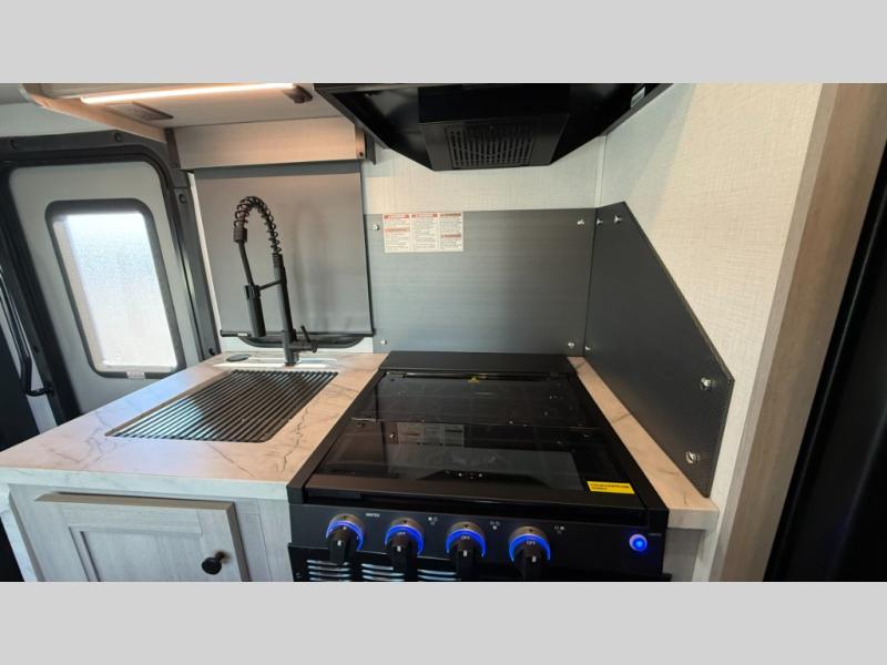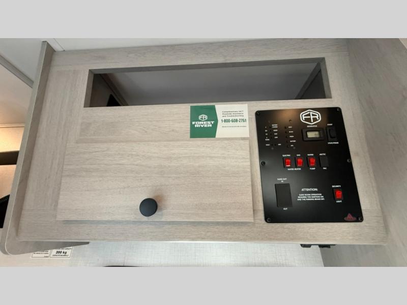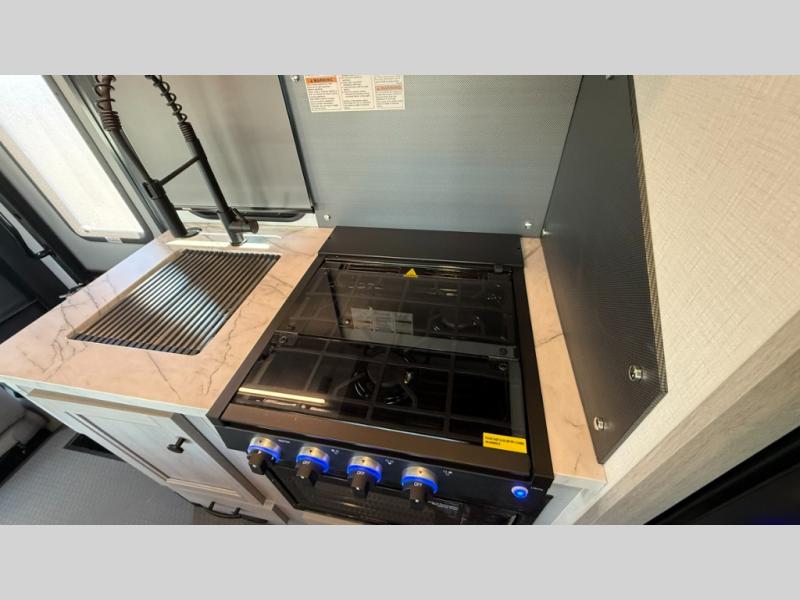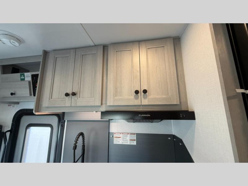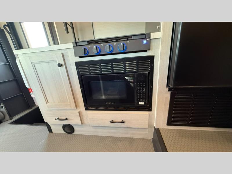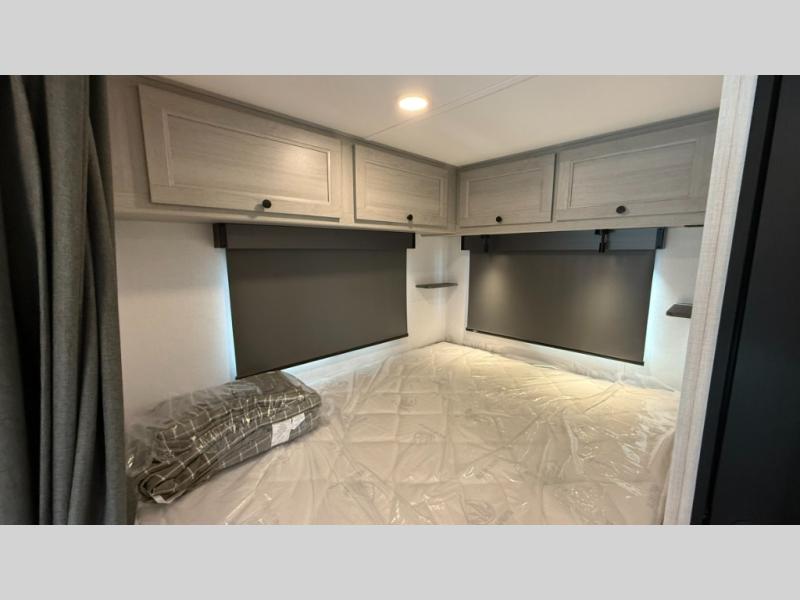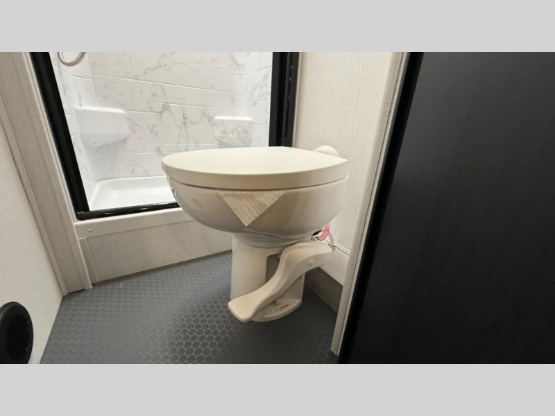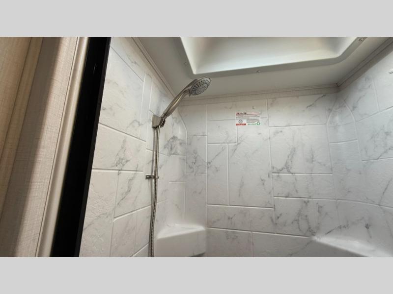 Travel in style with your own accommodations in this coach. You'll find a queen-size cab-over bunk that can be utilized as extra sleeping space or even storage, plus the rear corner offers a queen bed. And don't forget about the U-dinette as extra sleeping space after dining, playing games and relaxing. The kitchen offers a 10-cu. ft. 12V refrigerator, a convection/microwave/air fryer, and a flip-up countertop for more prep space. The private toilet and shower gives you a place to get cleaned up, and the bathroom sink is just outside the door allowing someone else the ability to get ready at the same time.